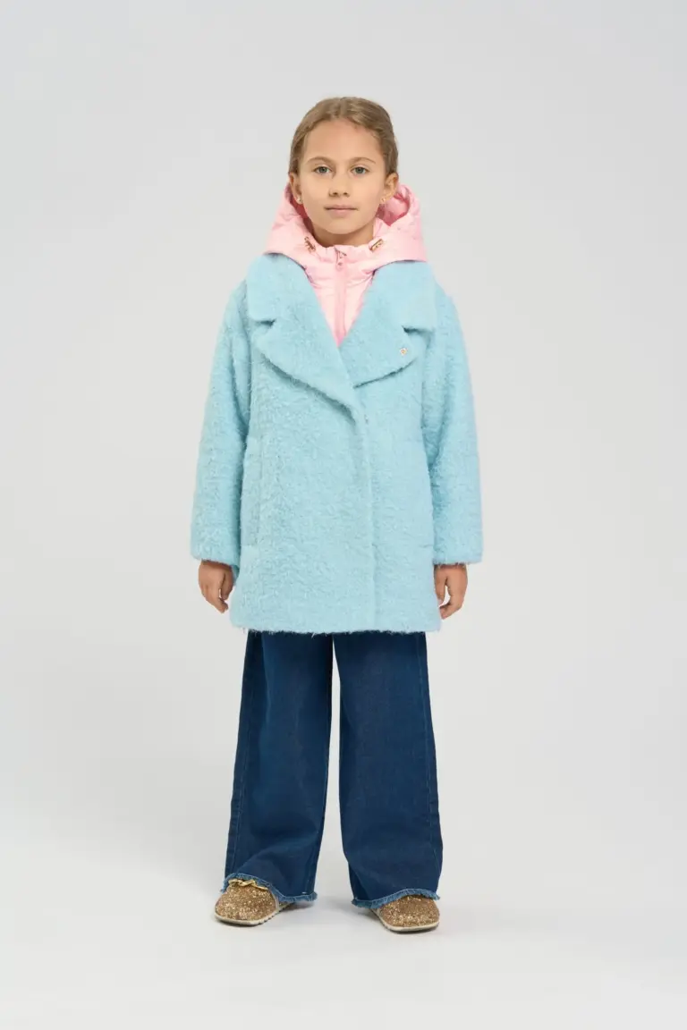 Модное пальто со съемным капюшоном позволяет изменять дизайн одежды по своему усмотрению. Розовый капюшон с ветрозащитной манишкой хорошо защищает от холода и осадков, при желании его ... можно снять. Пальто голубого цвета изготовлено из трендового искусственного меха. Модель комфортного прямого силуэта застегивается на потайную застежку. Утеплитель из полиэфирного волокна сочетает в себе легкость и превосходные теплоизоляционные свойства.