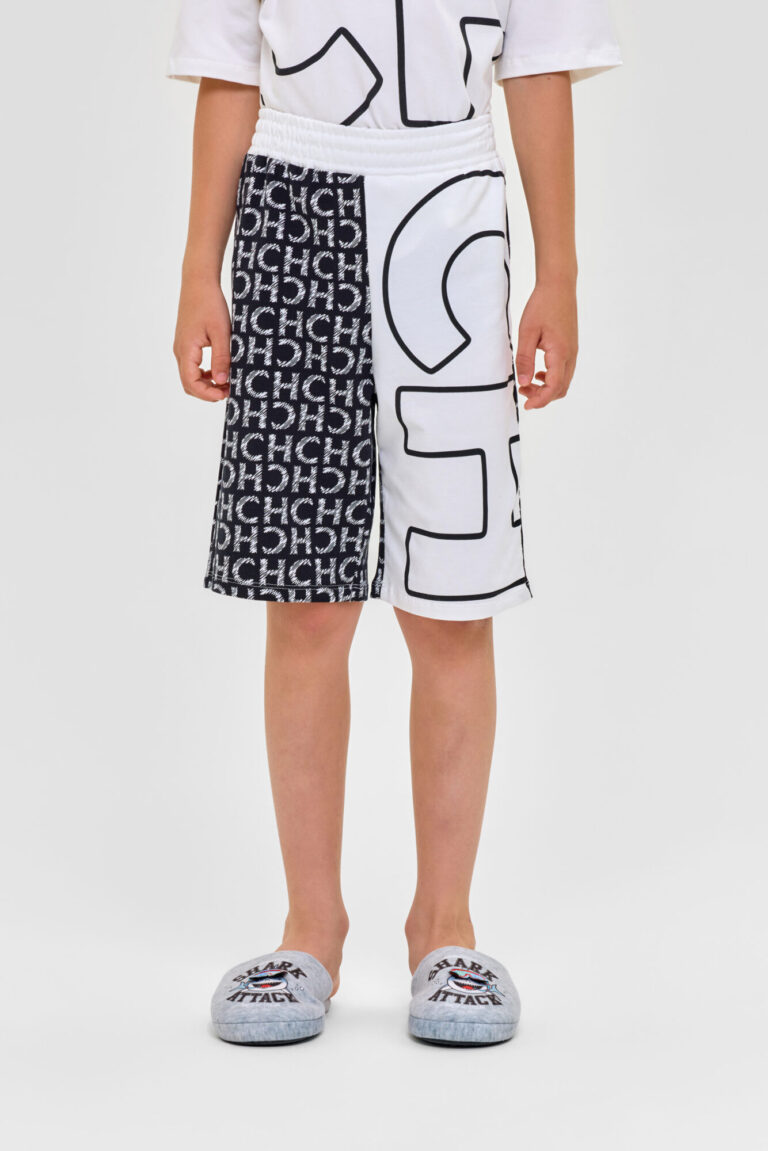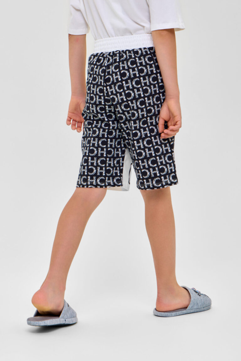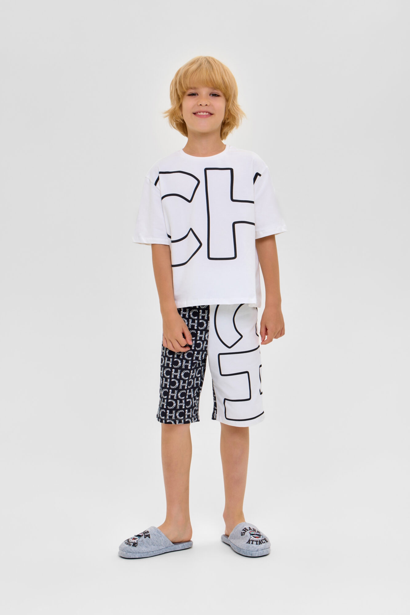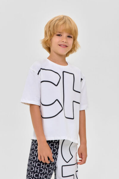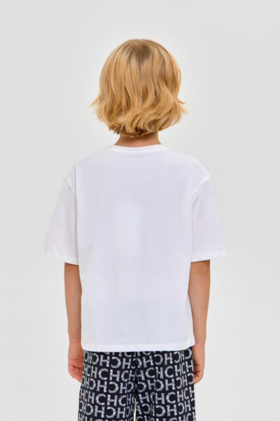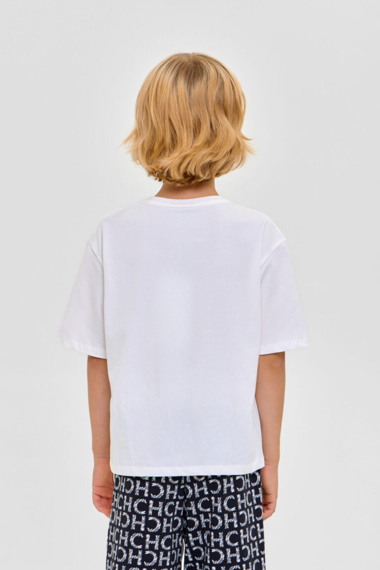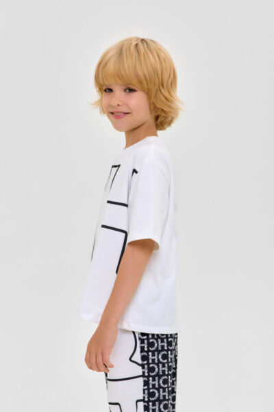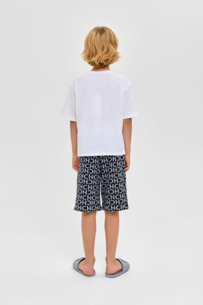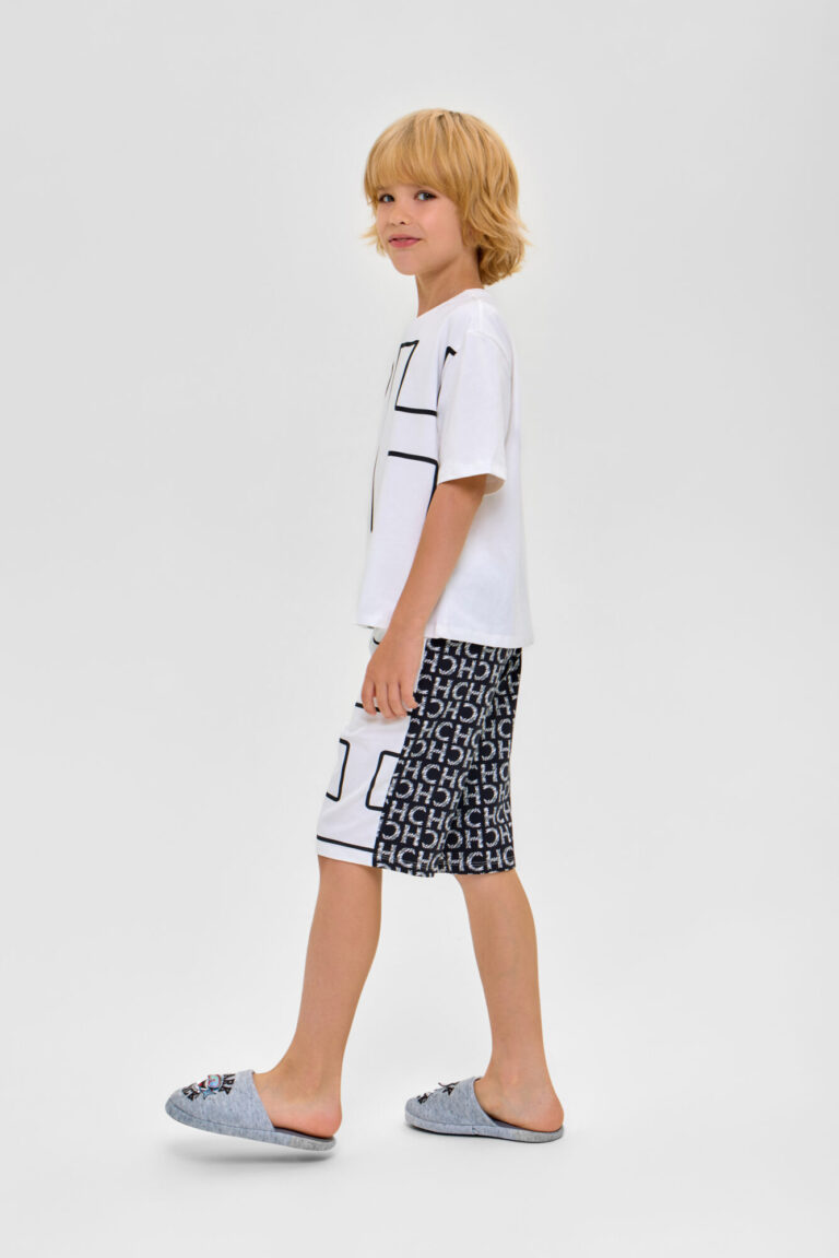 Домашний комплект для мальчика: футболка и бермуды из высококачественного смесового материала. Футболка - свободного кроя с короткими рукавами и обработанным бейкой воротом.