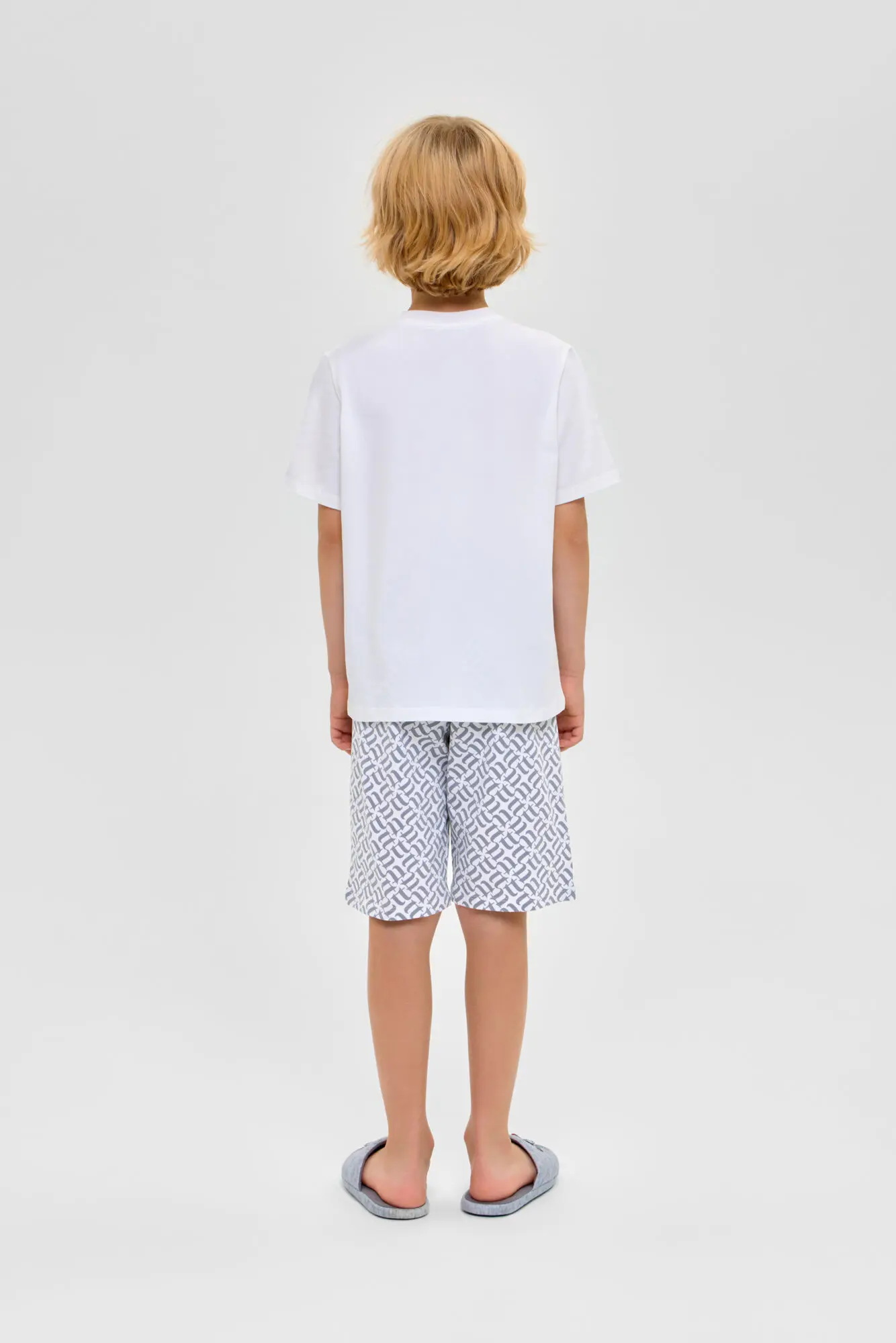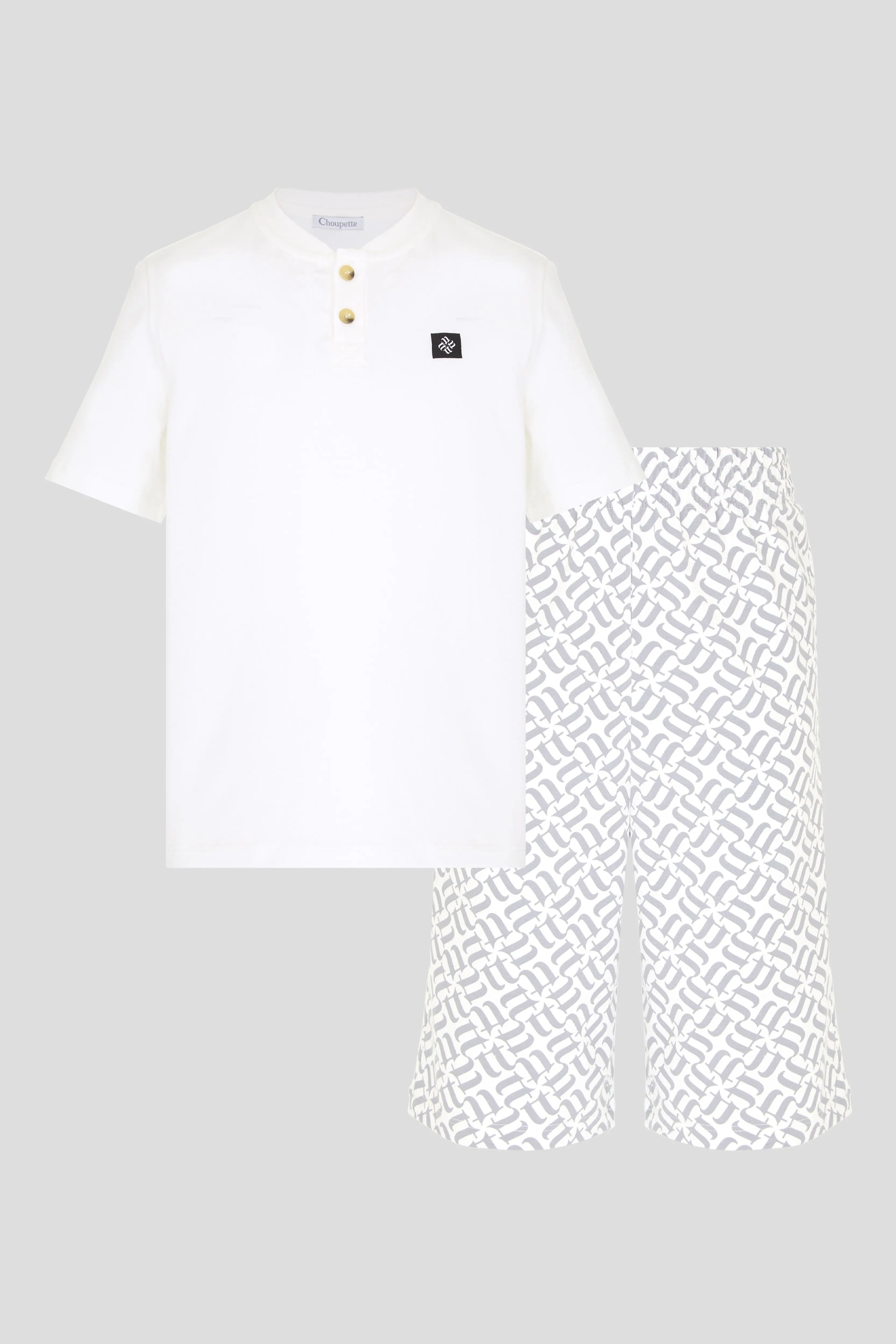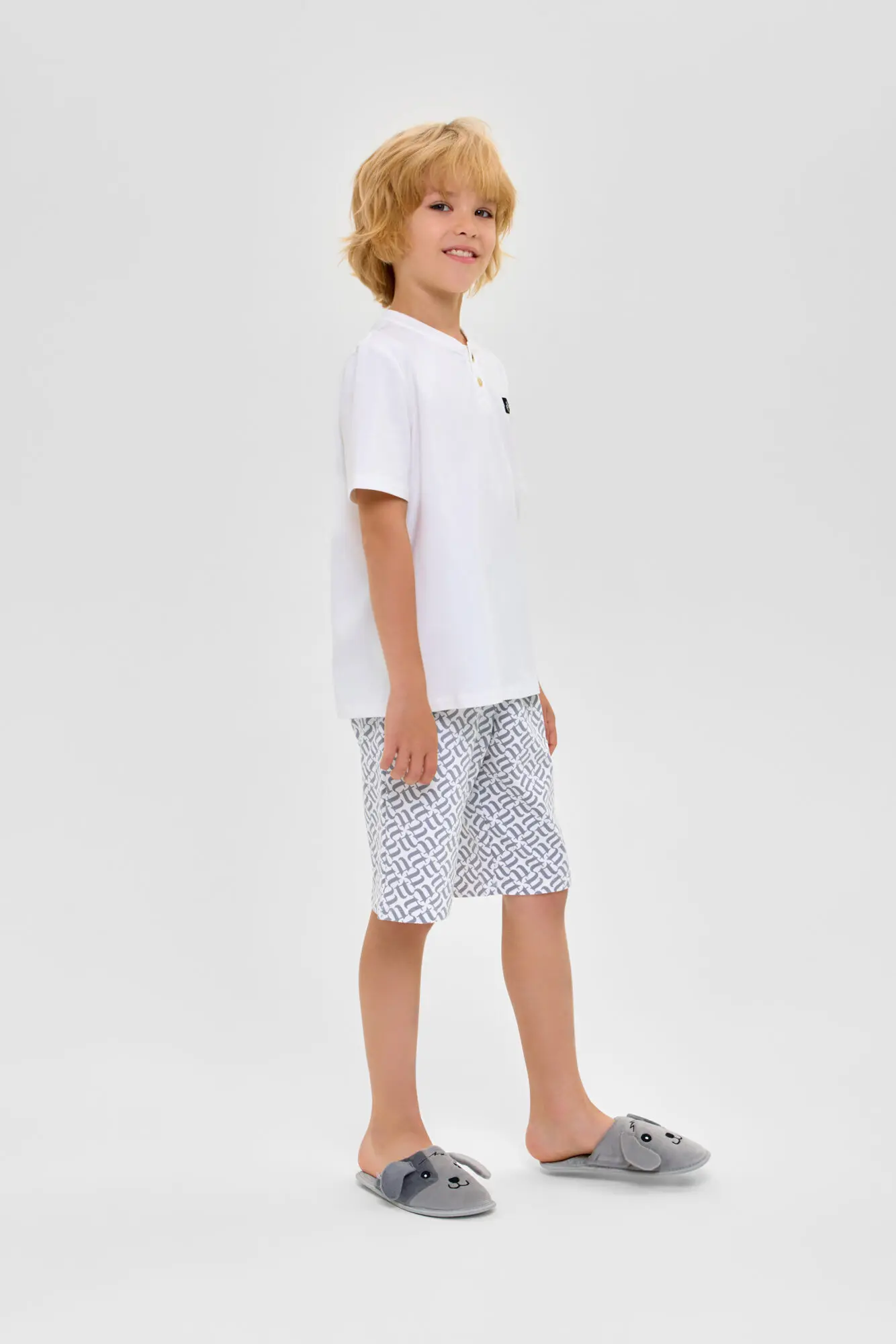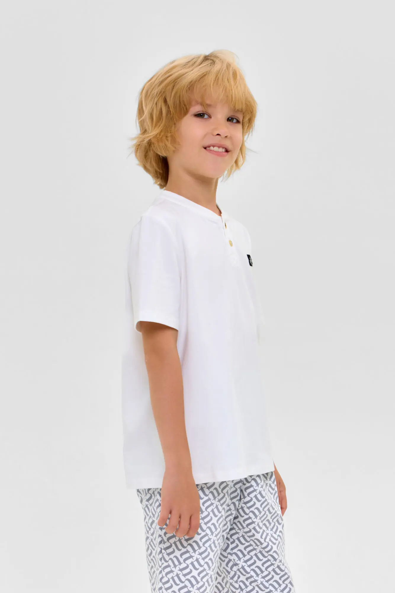 Домашний комплект для мальчика состоит из футболки и бермуд. Футболка свободного кроя, рукава короткие. Ворот горловины обработан бейкой. Удобная застежка на две пуговицы облегчает процесс переодевания. Свободные ... бермуды на поясе имеют эластичную резинку. Изделие выполнено из смесового материала высокого качества.