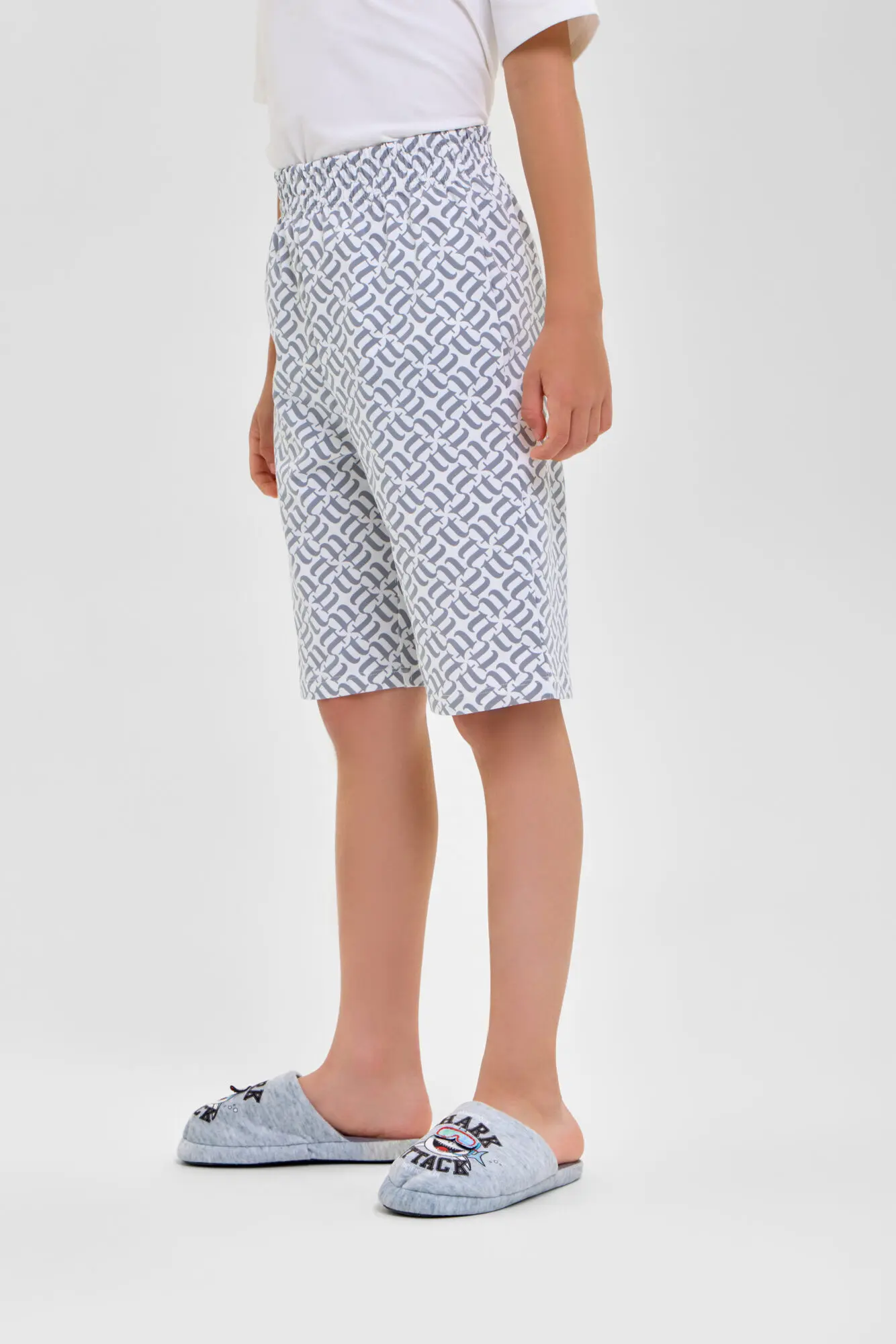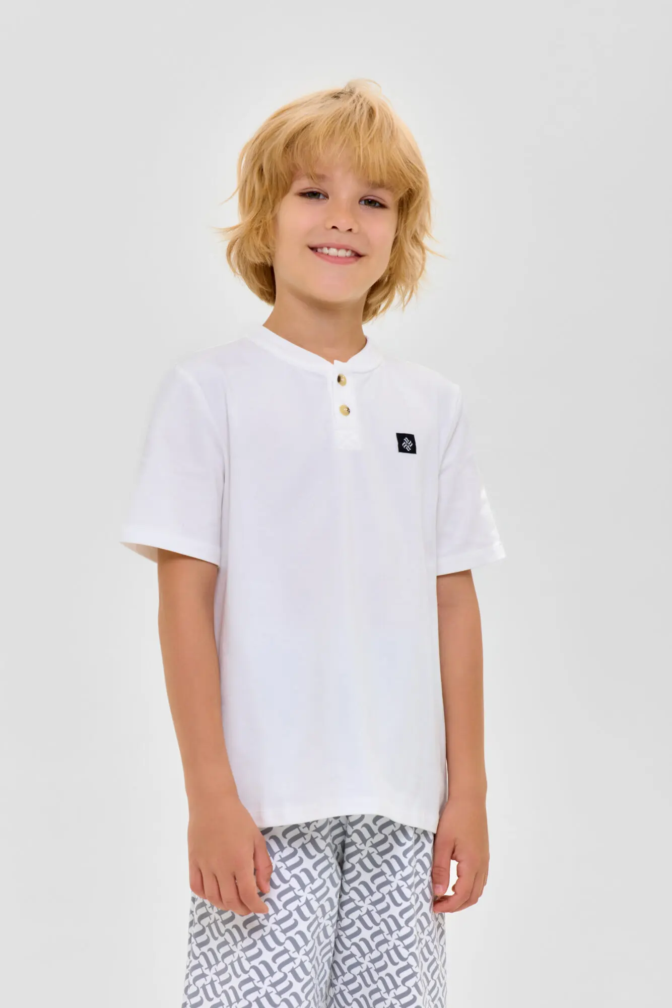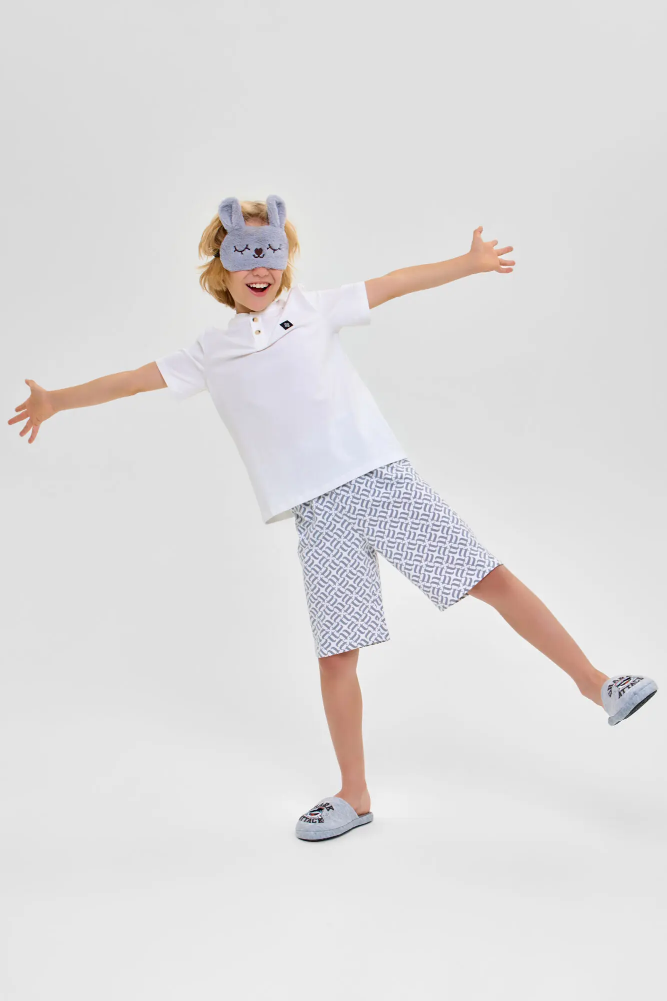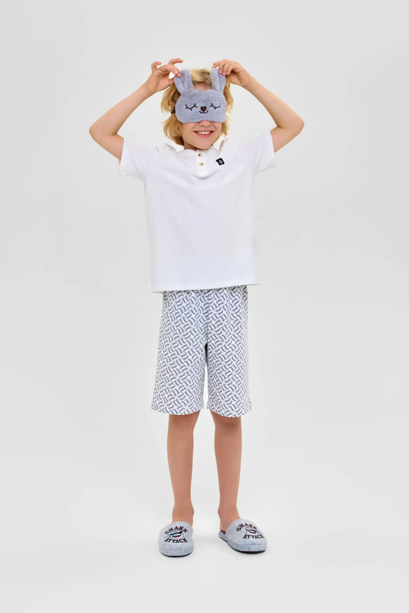 Домашний комплект для мальчика состоит из футболки и бермуд. Футболка свободного кроя, рукава короткие. Ворот горловины обработан бейкой. Удобная застежка на две пуговицы облегчает процесс переодевания. Свободные ... бермуды на поясе имеют эластичную резинку. Изделие выполнено из смесового материала высокого качества.