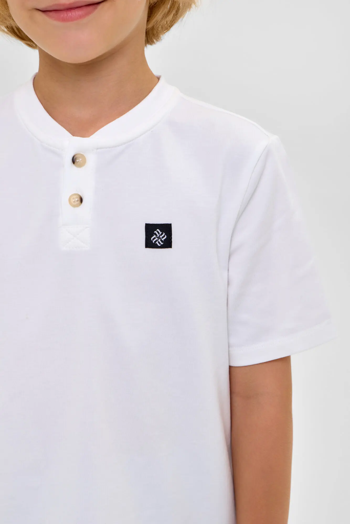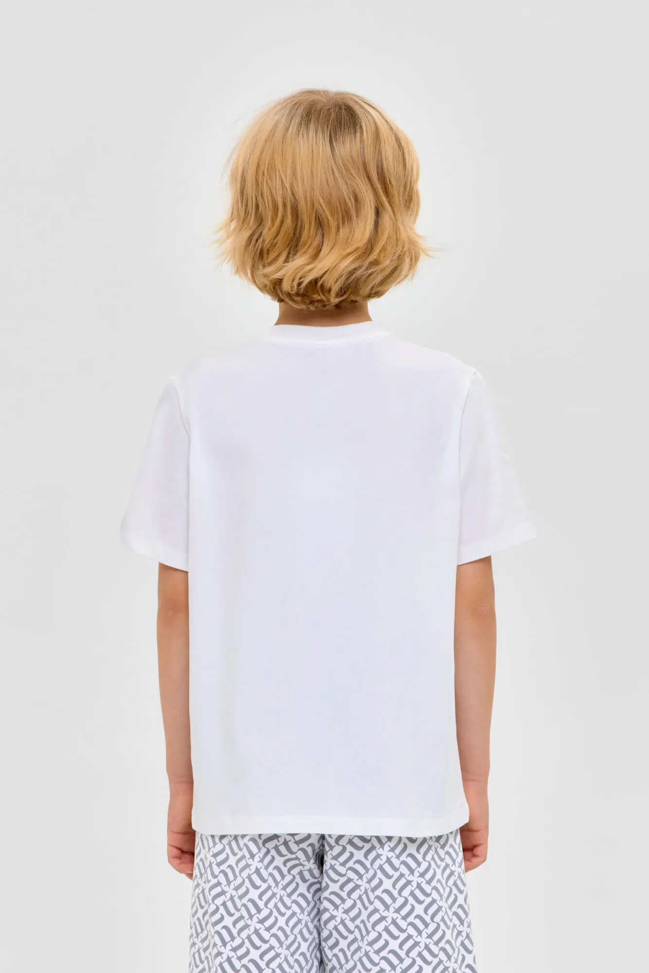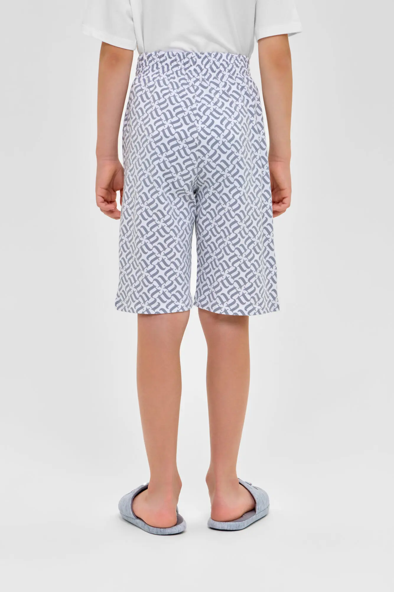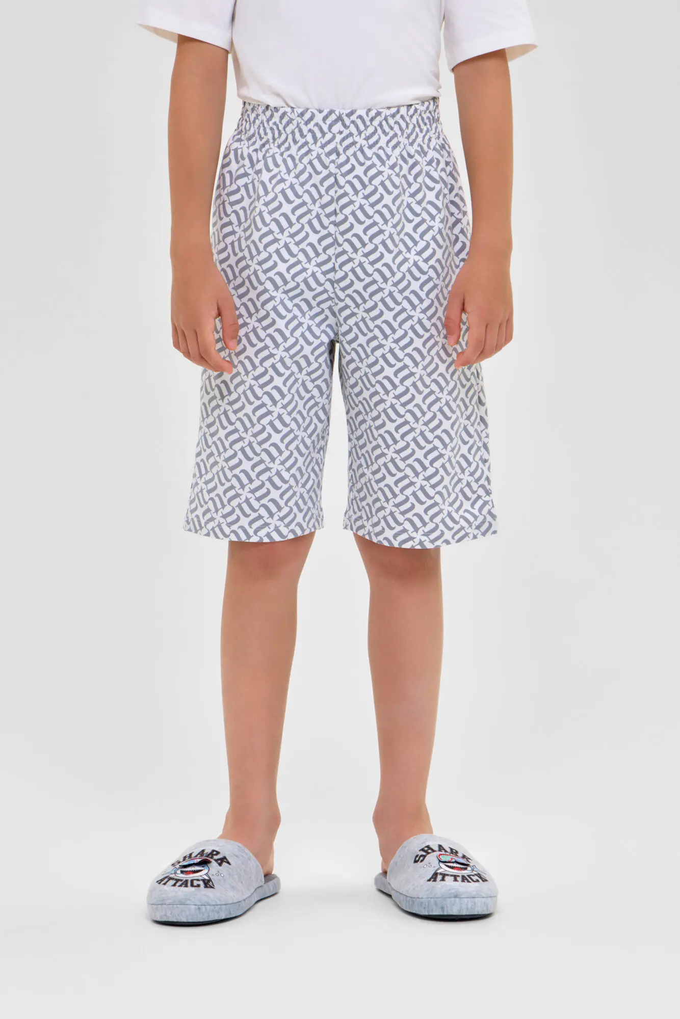 Домашний комплект для мальчика состоит из футболки и бермуд. Футболка свободного кроя, рукава короткие. Ворот горловины обработан бейкой. Удобная застежка на две пуговицы облегчает процесс переодевания. Свободные ... бермуды на поясе имеют эластичную резинку. Изделие выполнено из смесового материала высокого качества.