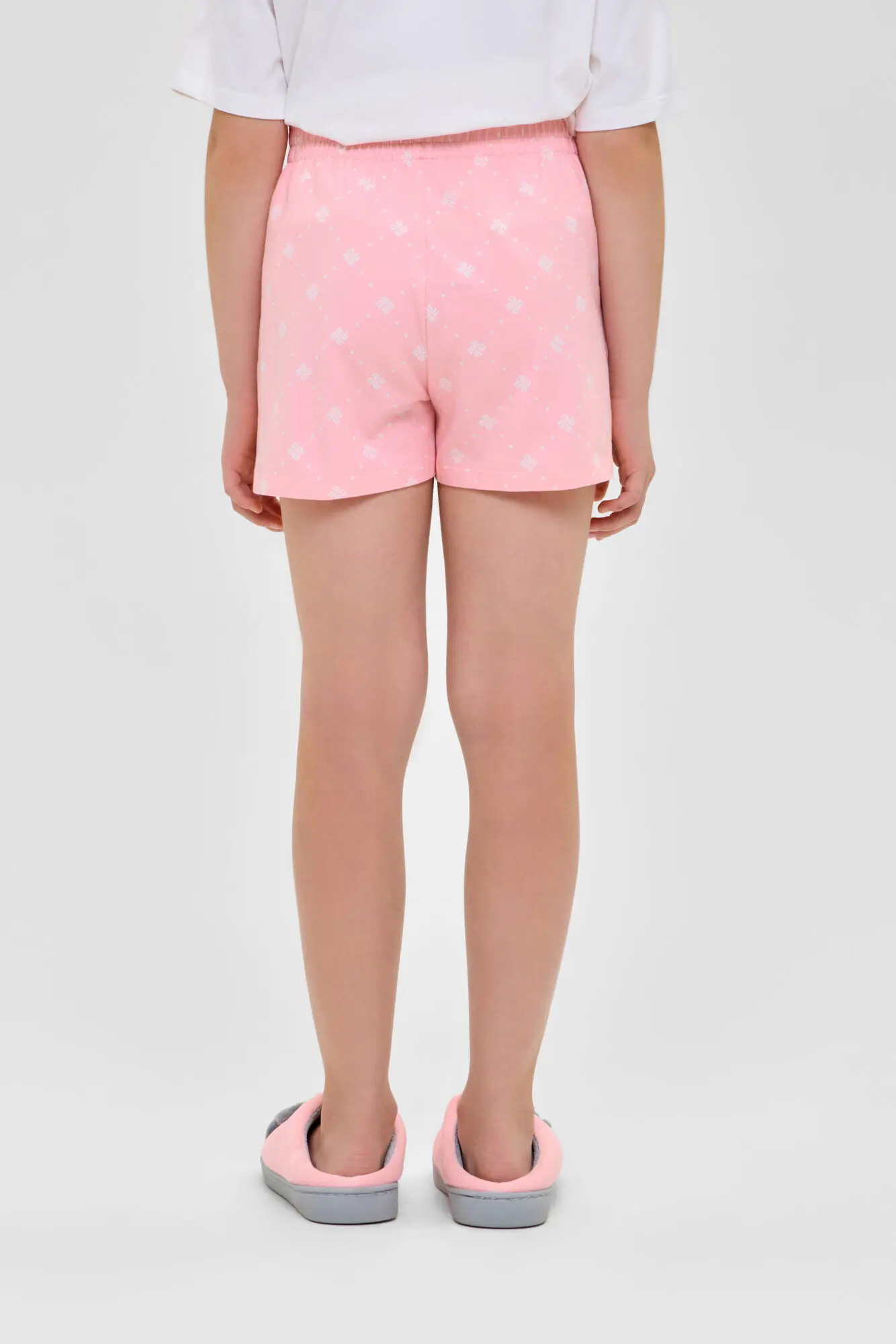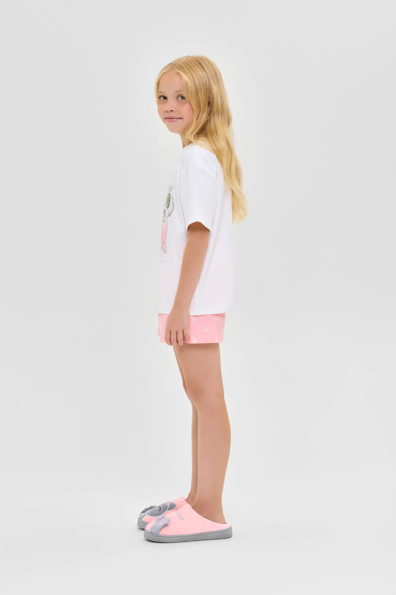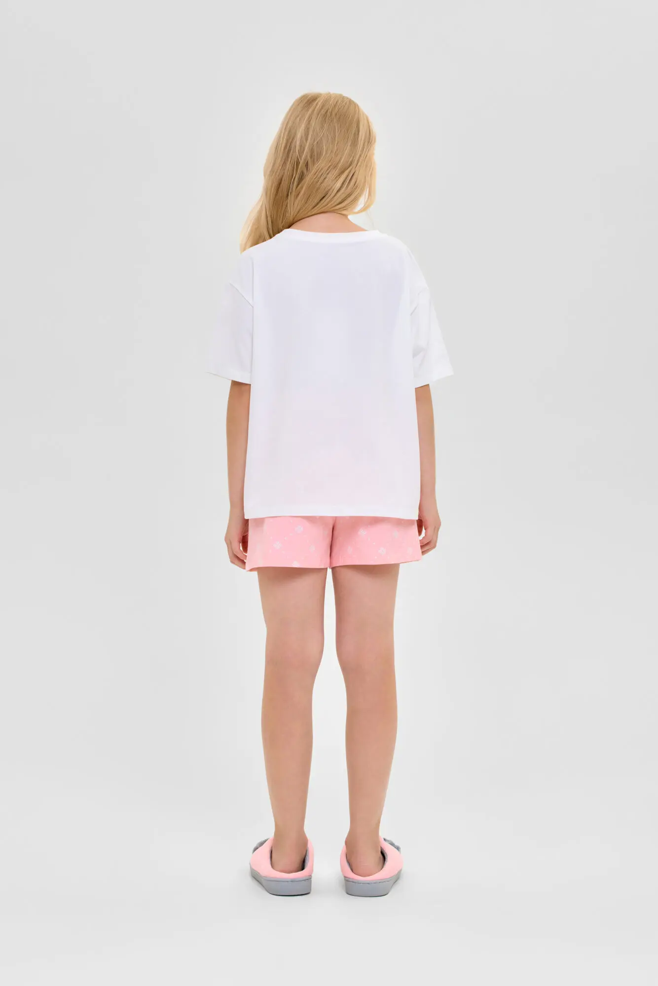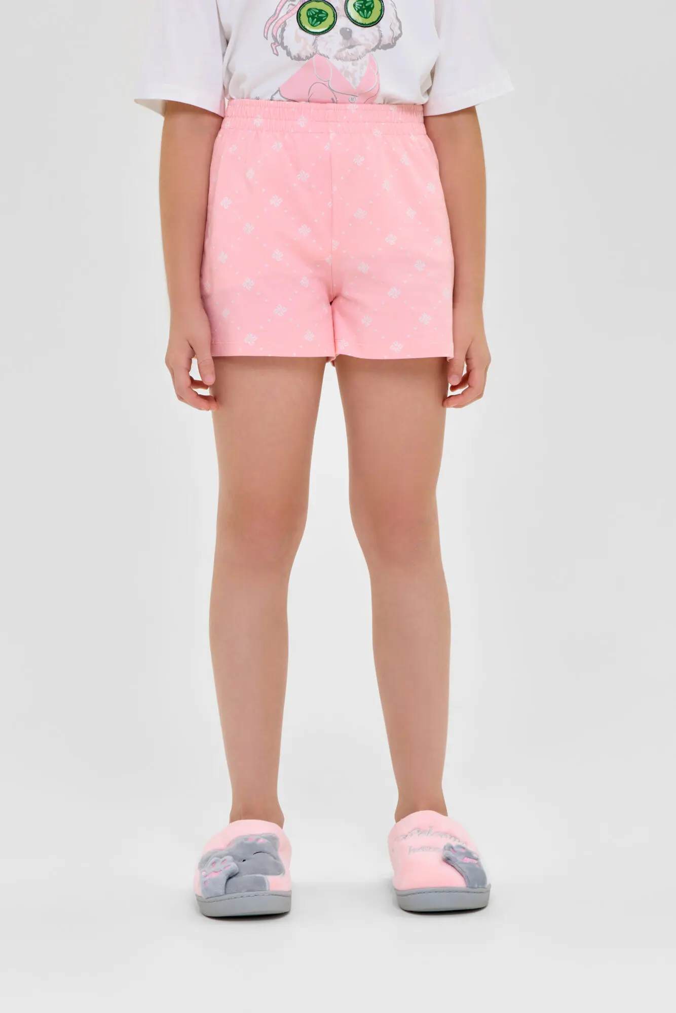 Удобная пижама для девочки выполнена из материала высокого качества. Модель состоит из футболки с коротким рукавом и шорт. Украшает изделие модный анималистический принт.
