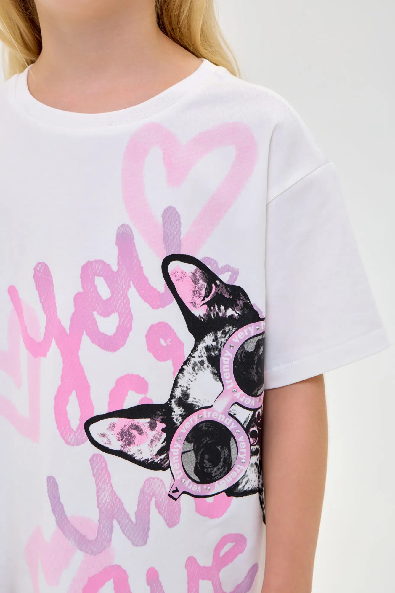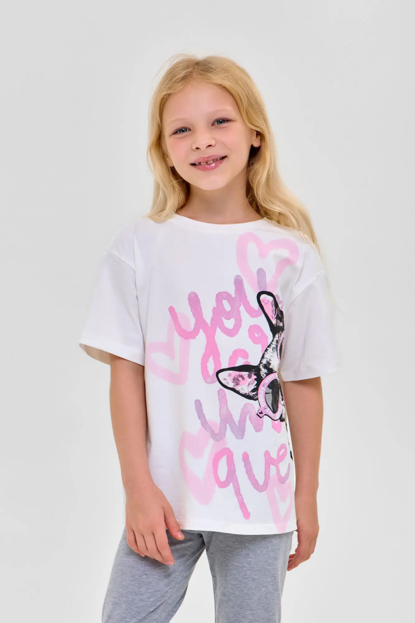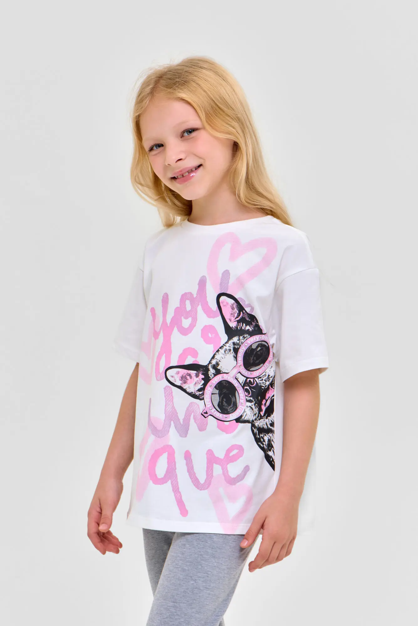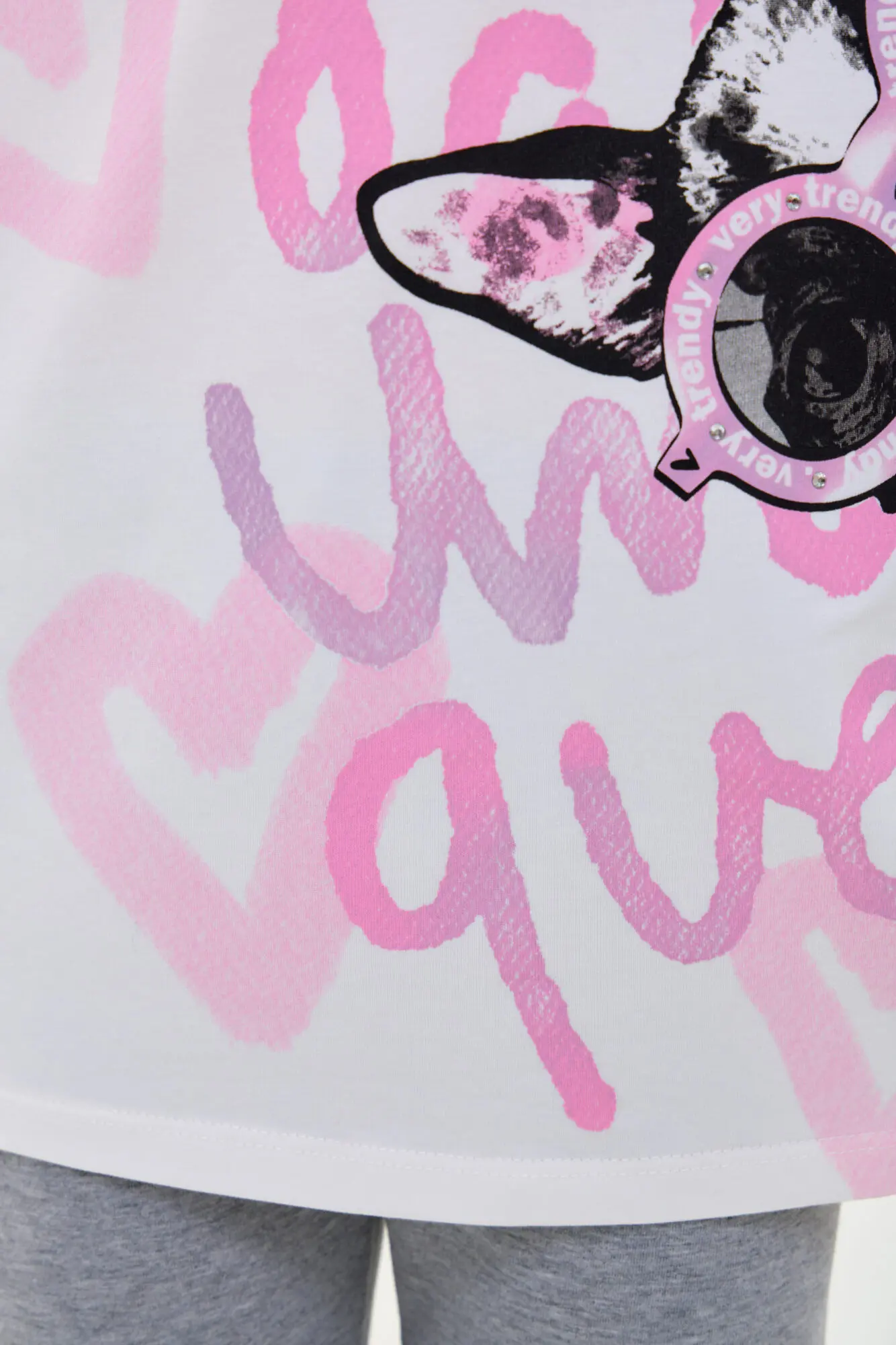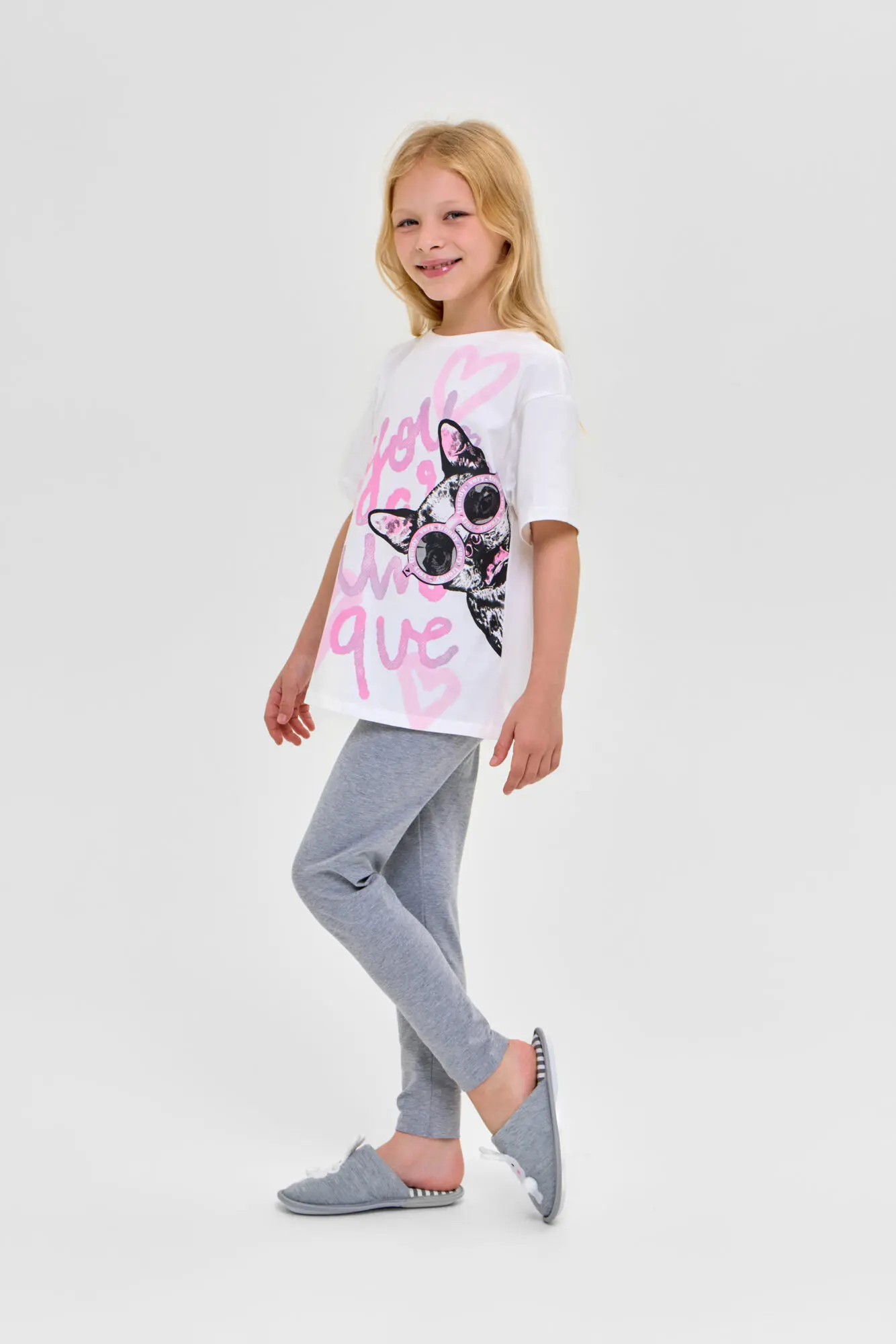 В комплект входят футболка свободного кроя ... и лосины. В качестве декора используется сочетание буквенного и анималистического принта.