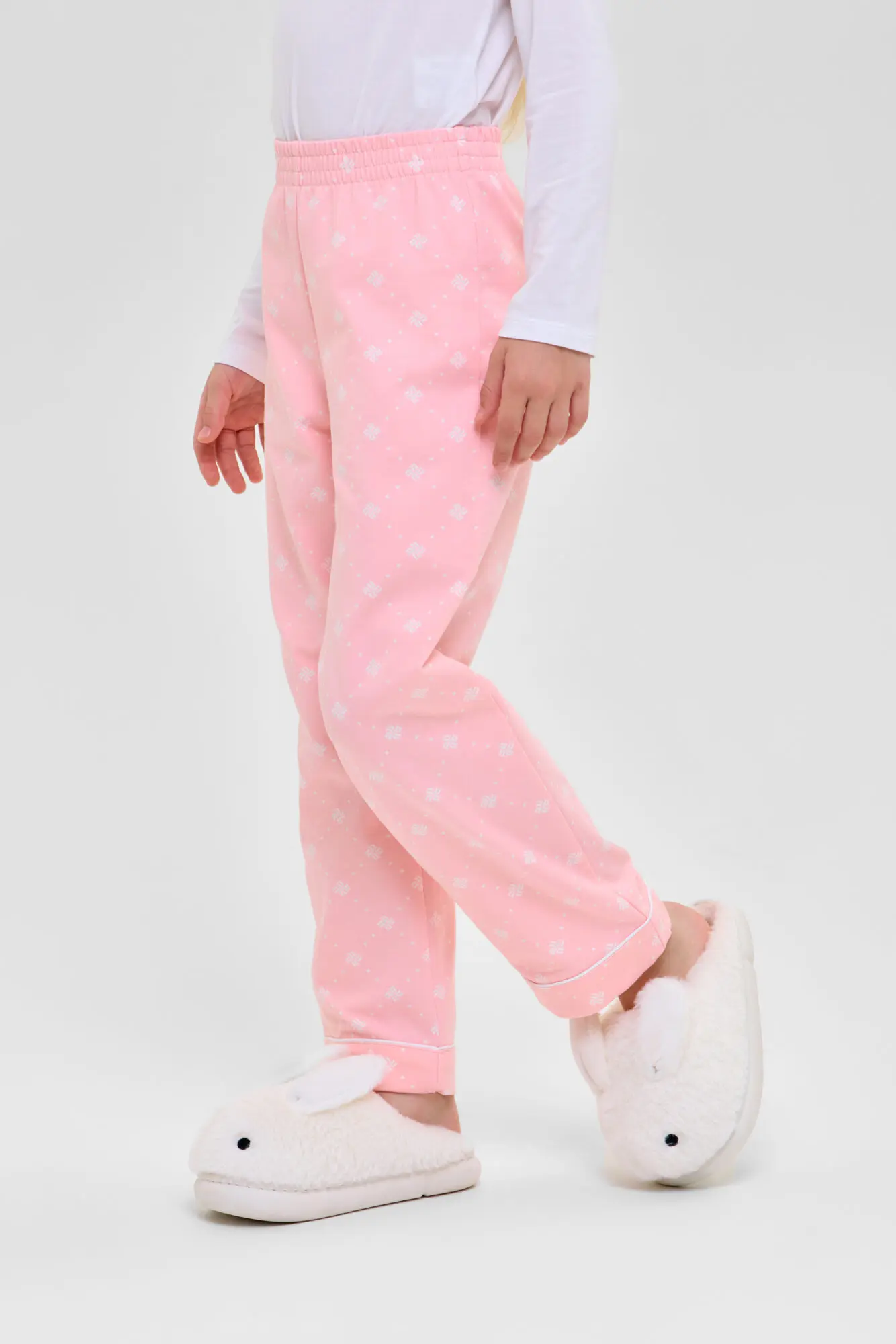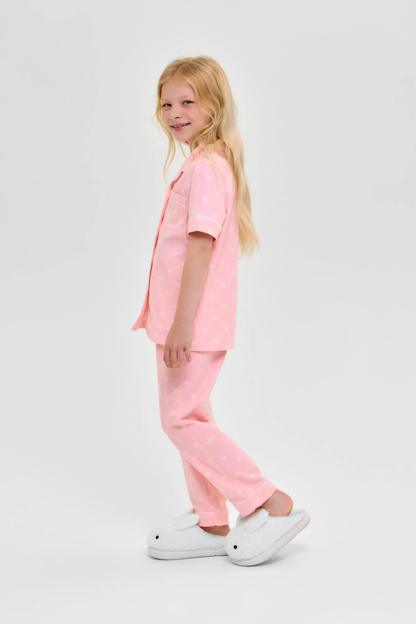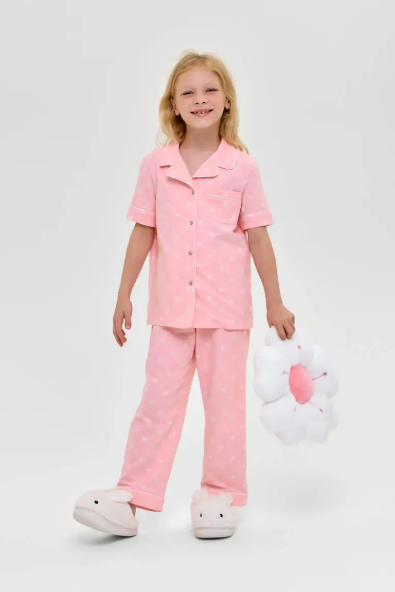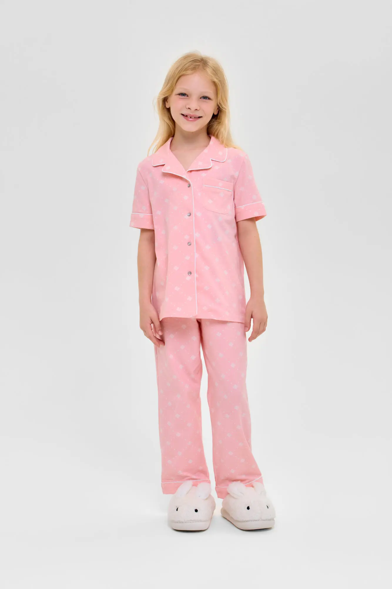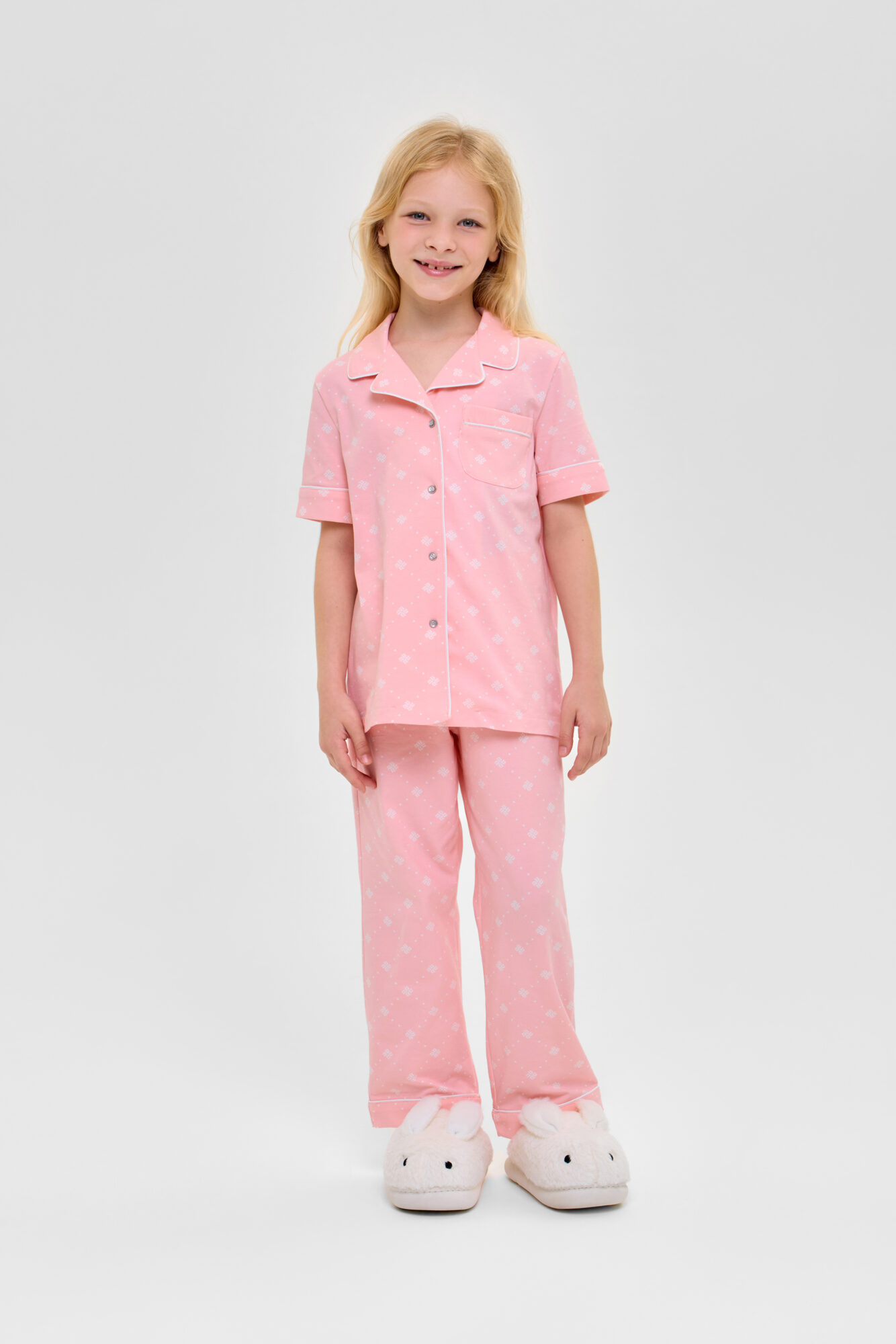 Нежный домашний комплект для девочки, состоящий из хлопковой рубашки и брюк. Рубашка свободного кроя с отложным воротником и застежкой на пуговицы по всей длине. Брюки с ... широким поясом на эластичной резинке обеспечивают комфортную посадку. Этот комплект универсален: его можно использовать как домашнюю одежду или пижаму. Качественные материалы сохранят форму и внешний вид изделия.