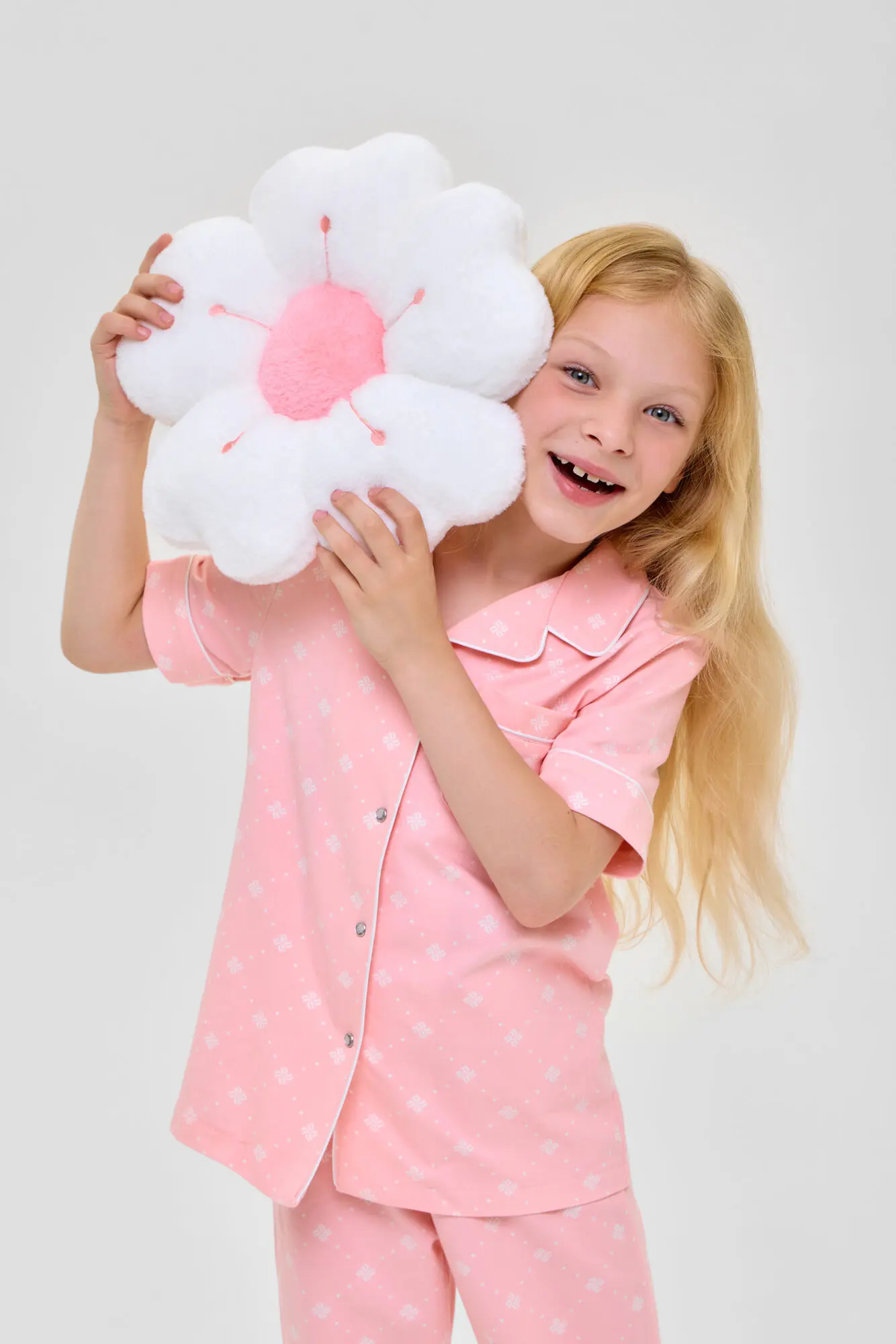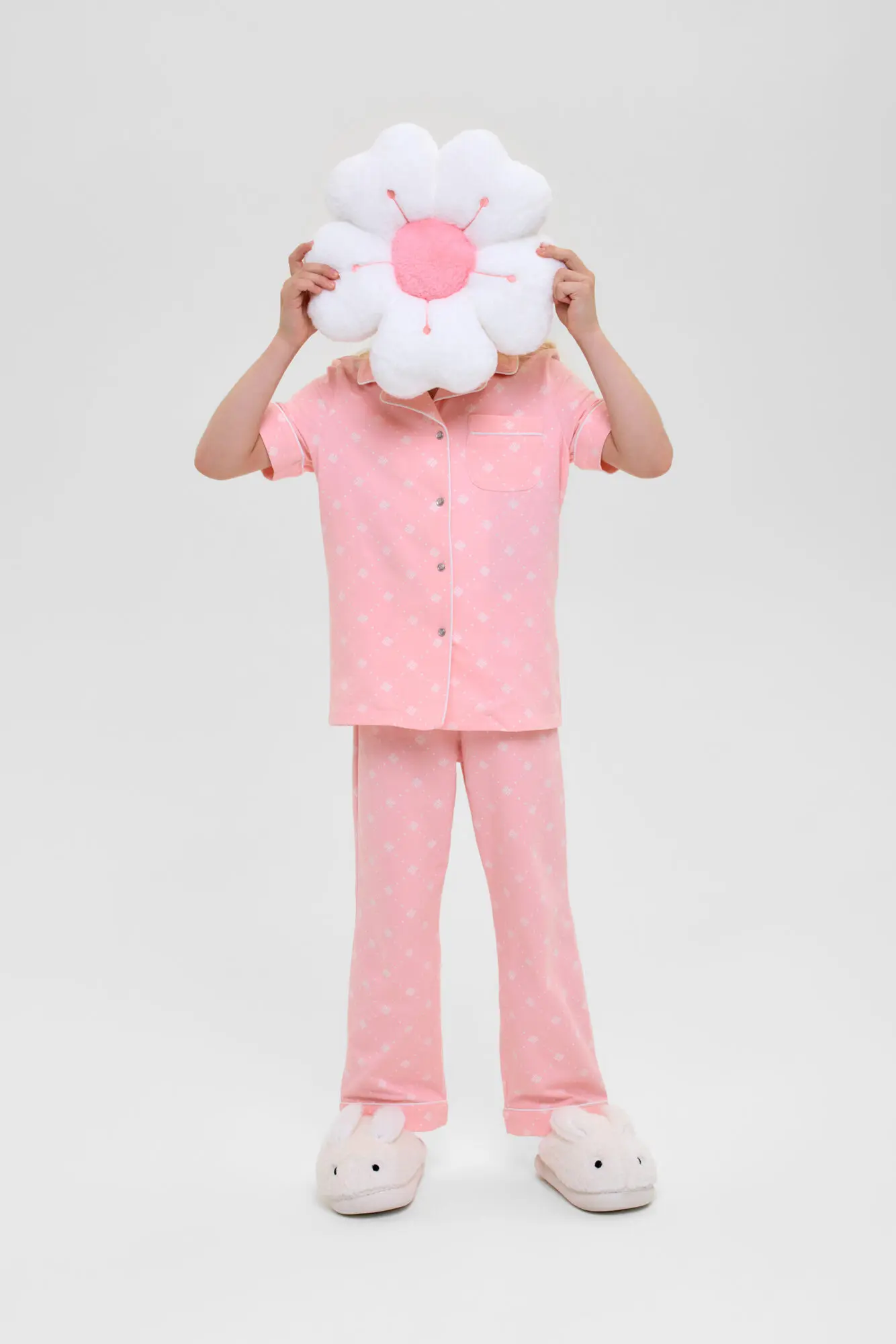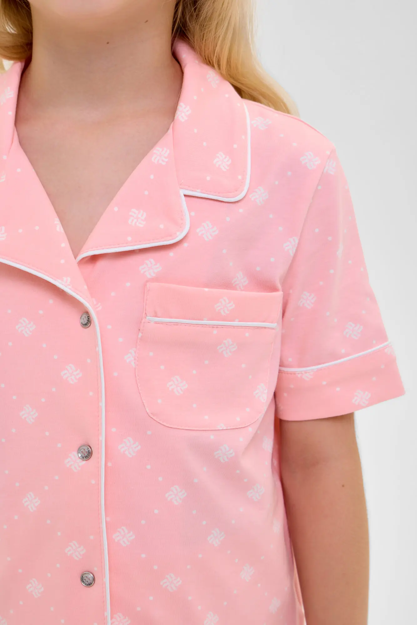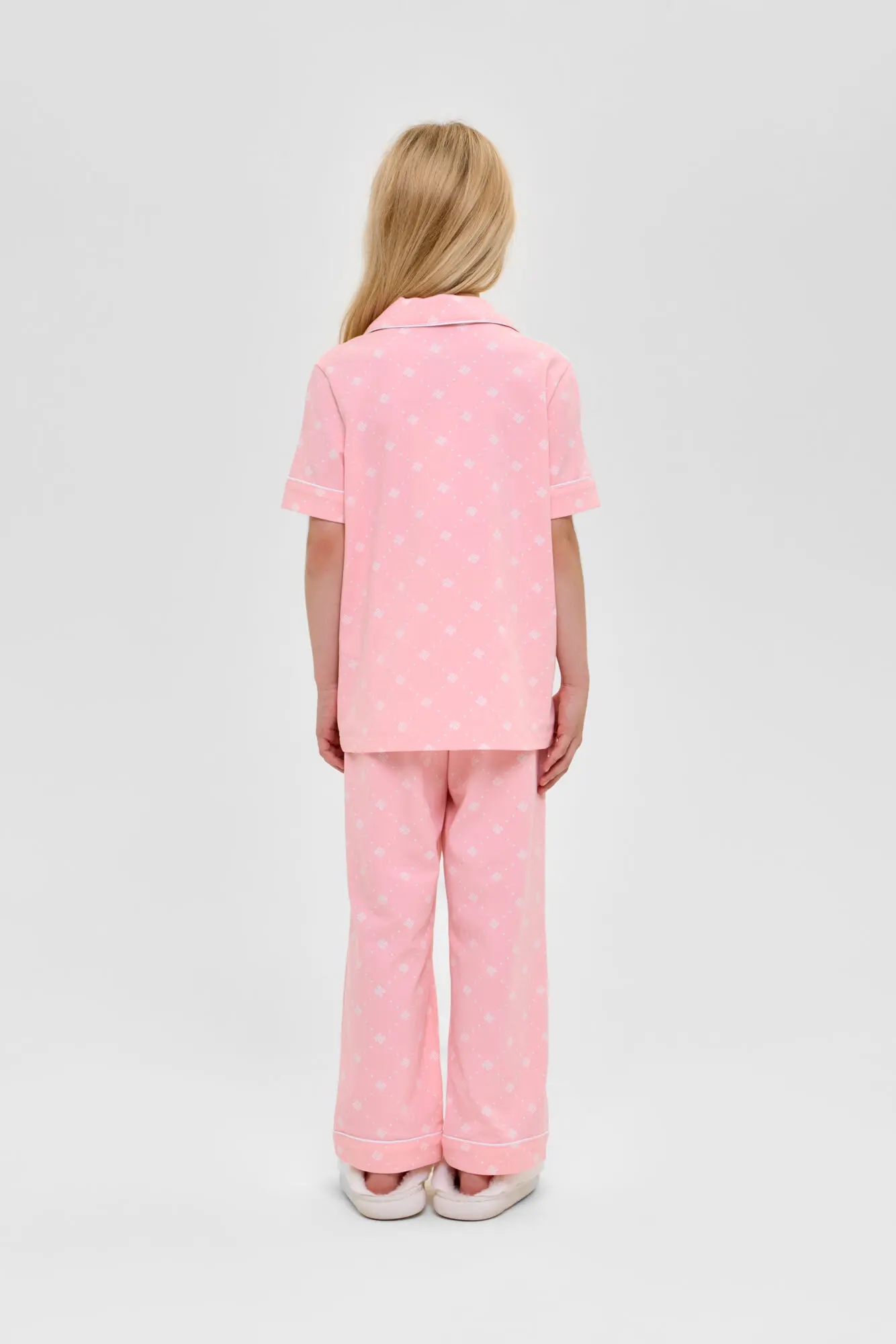 Нежный домашний комплект для девочки, состоящий из хлопковой рубашки и брюк. Рубашка свободного кроя с отложным воротником и застежкой на пуговицы по всей длине. Брюки с ... широким поясом на эластичной резинке обеспечивают комфортную посадку. Этот комплект универсален: его можно использовать как домашнюю одежду или пижаму. Качественные материалы сохранят форму и внешний вид изделия.
