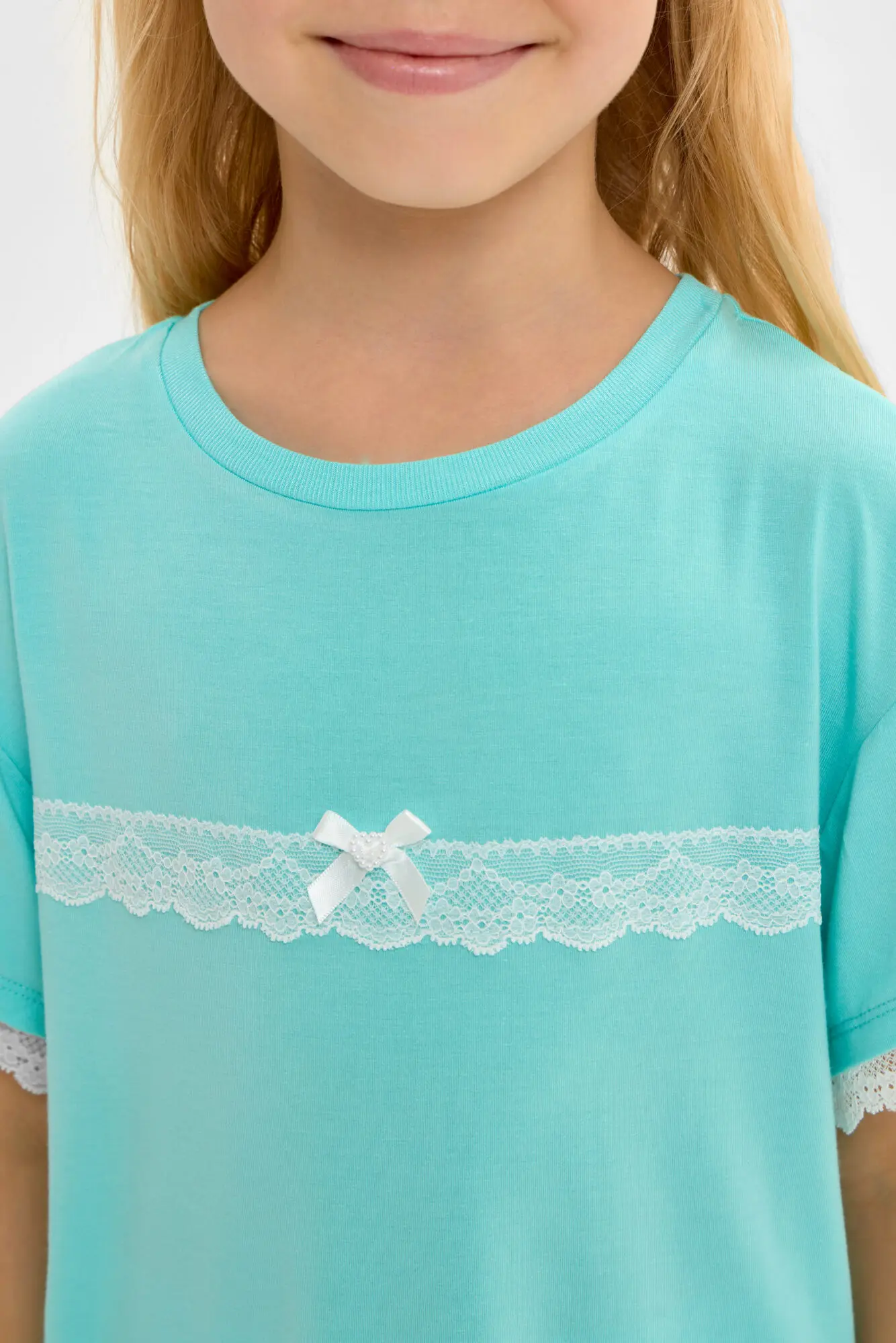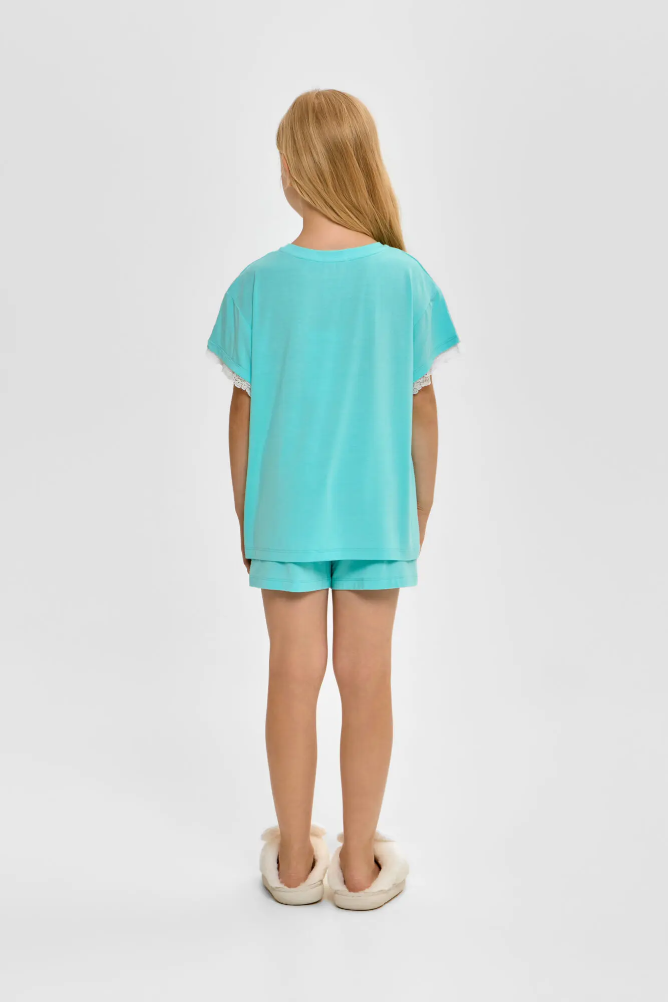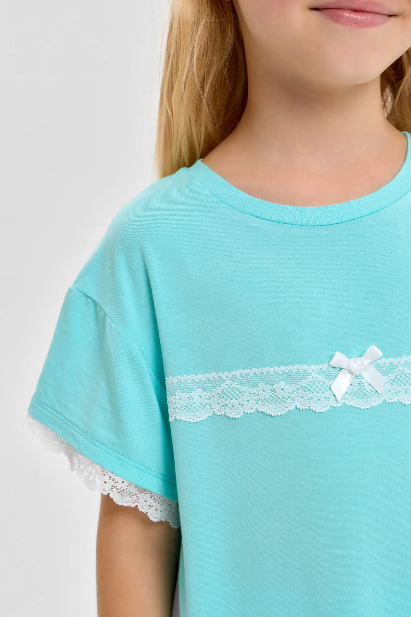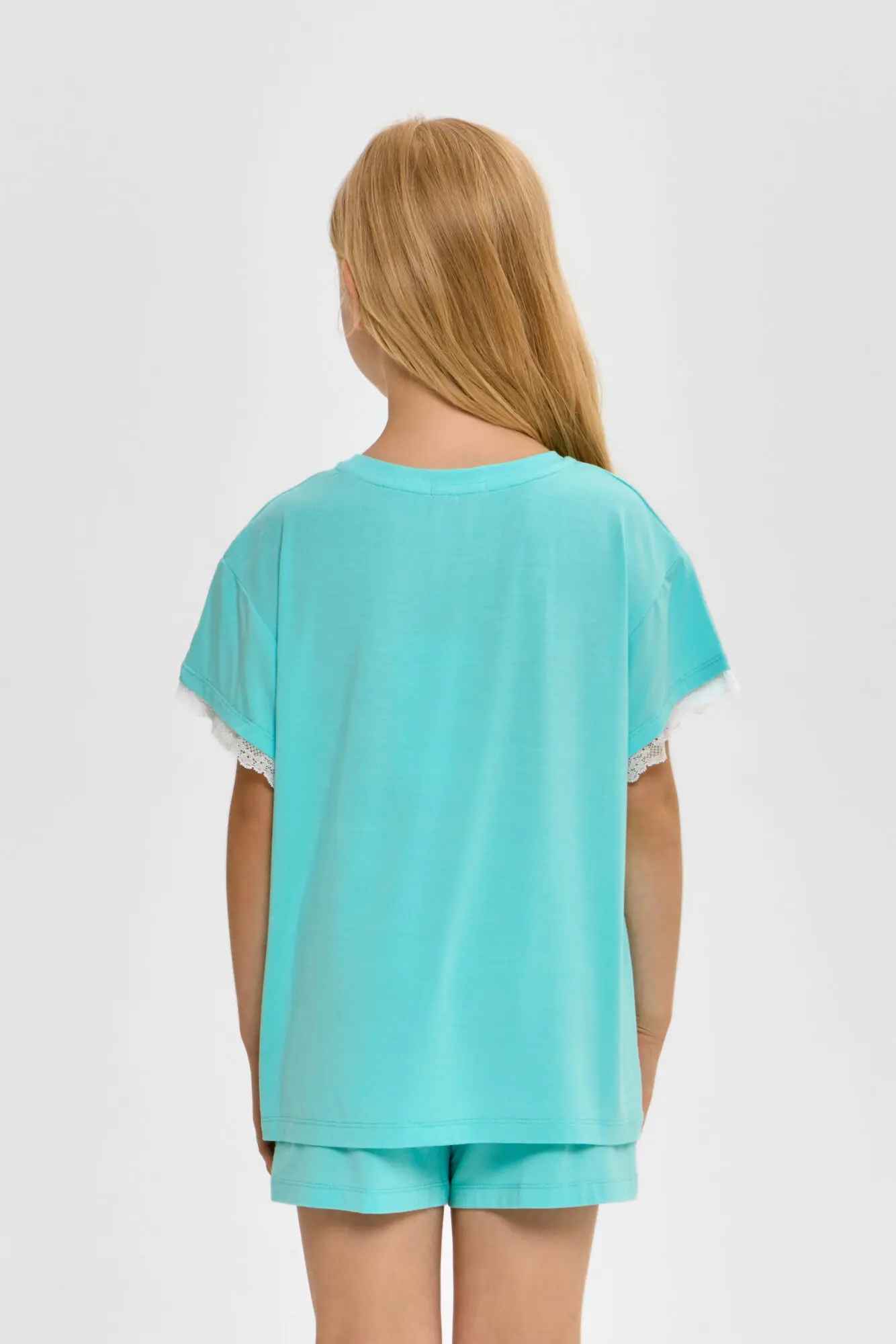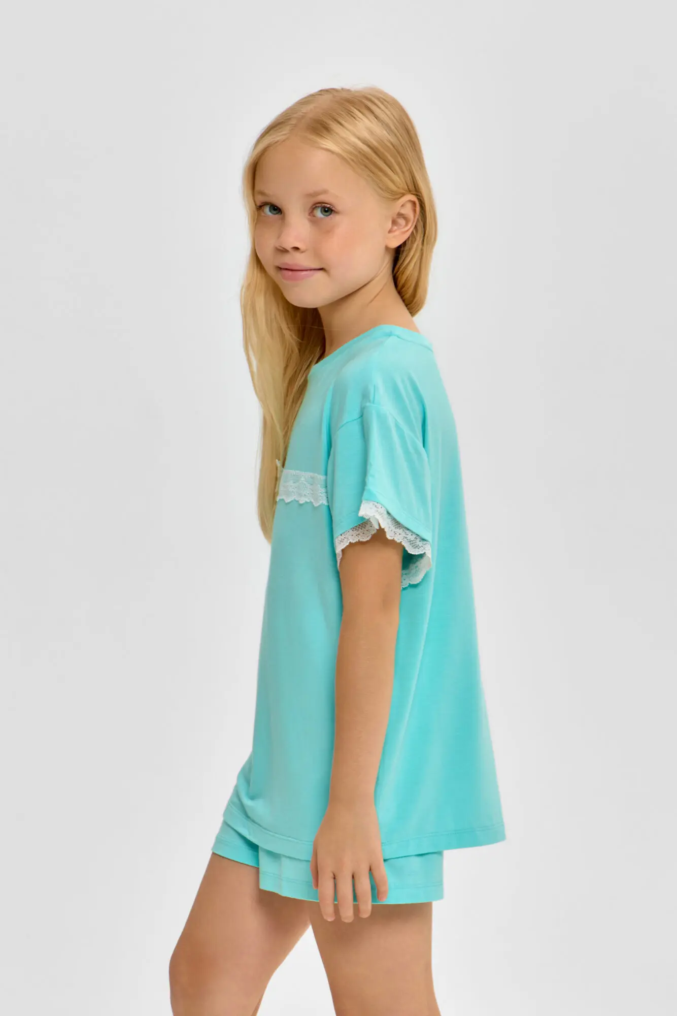Комплект для сна нежного бирюзового цвета для девочек состоит из футболки и шорт. Футболка свободного силуэта, округлый вырез горловины оторочен бейкой. Декоративным элементом коротких рукавов и ... верхней части служит кружево. Шорты с эластичной резинкой на талии обеспечивают комфортную и надежную посадку. Благодаря этому пижама становится удобной и практичной для ночного отдыха.