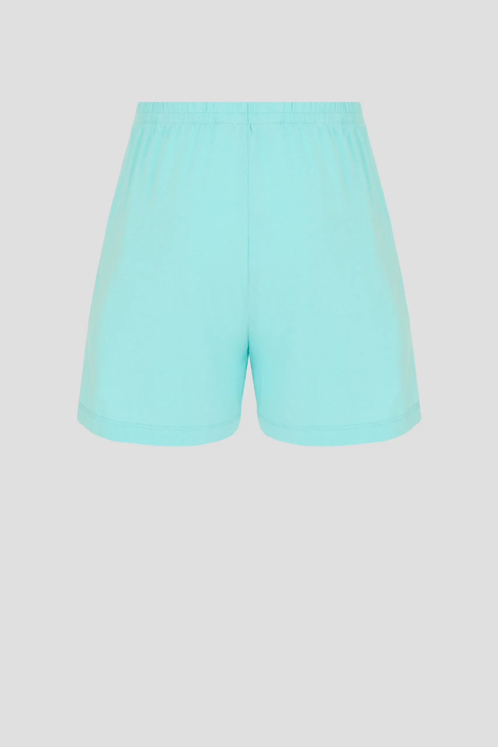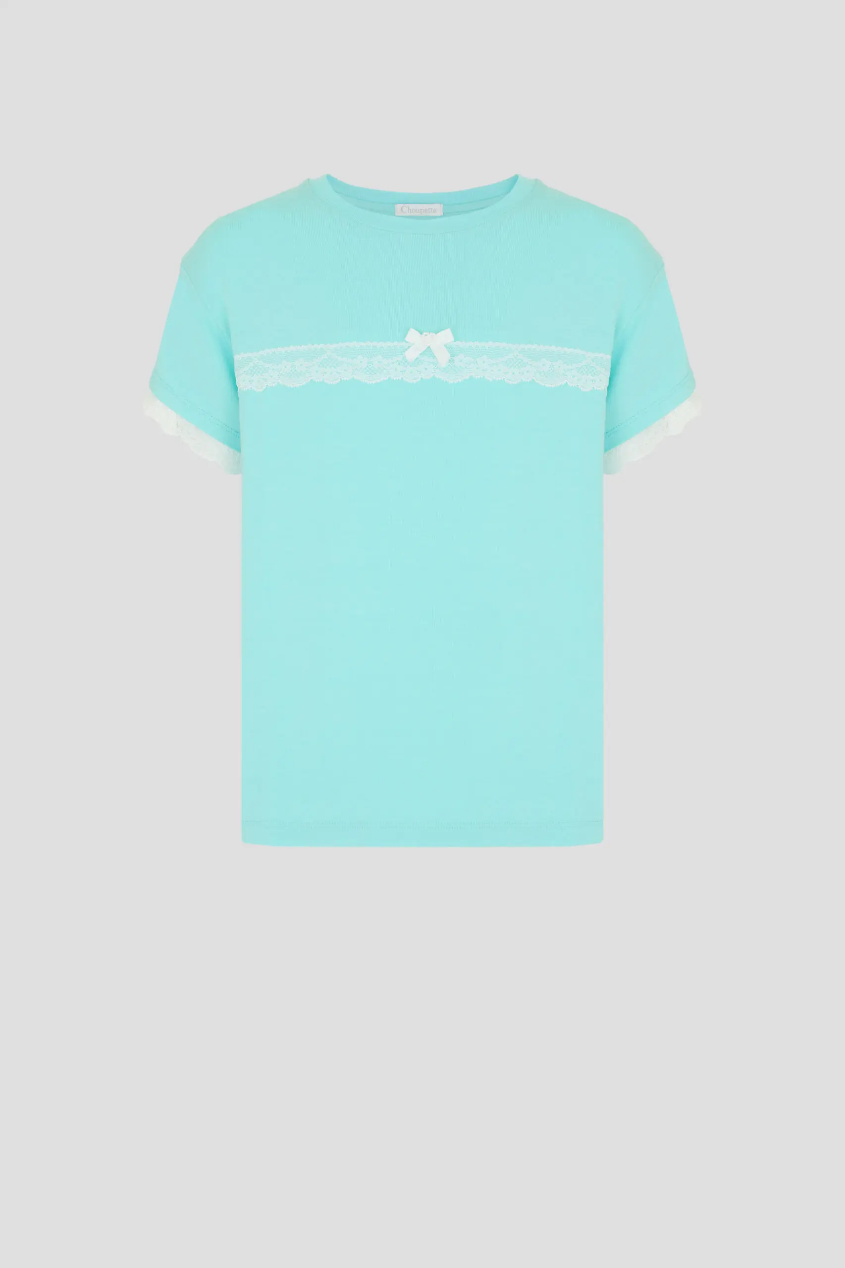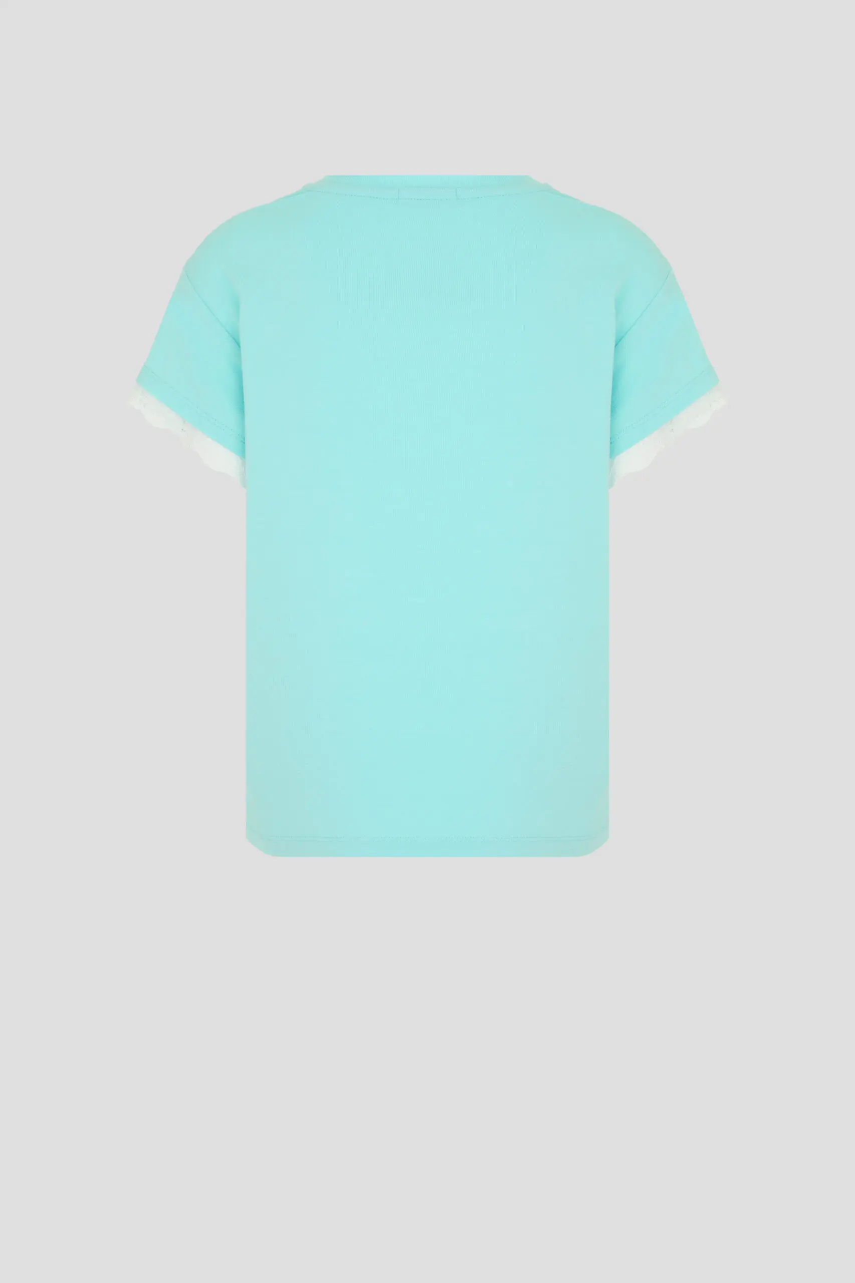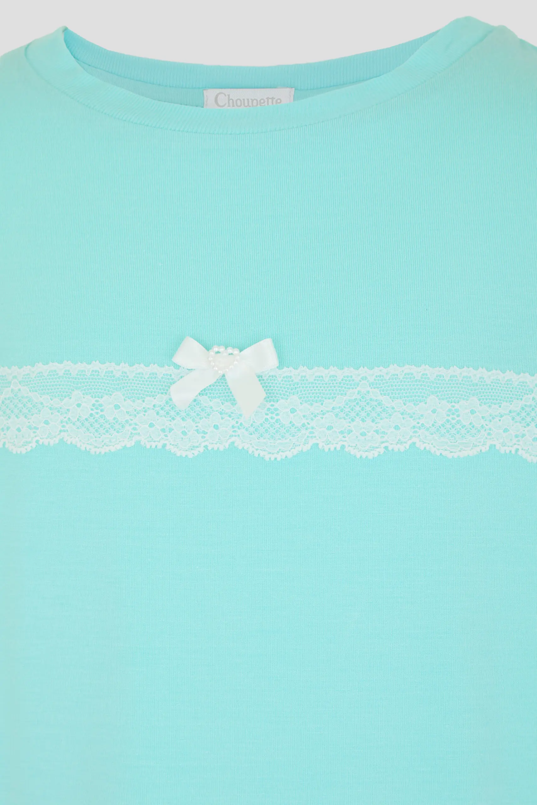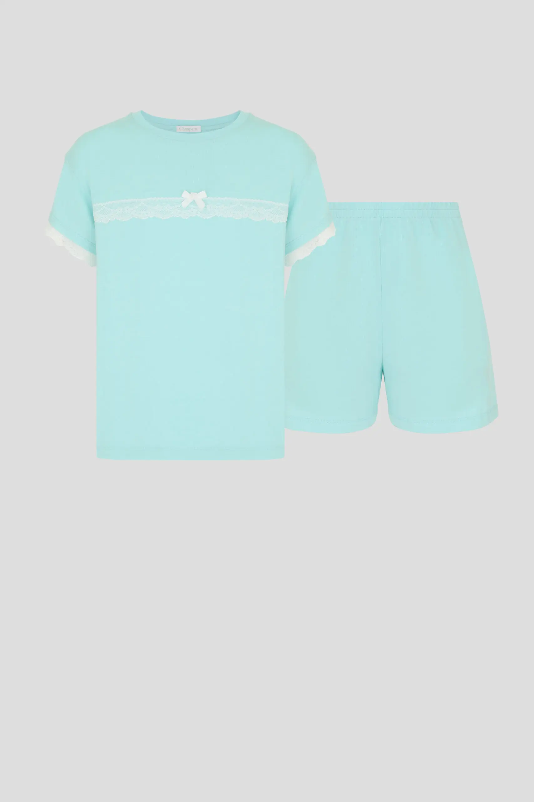 Комплект для сна нежного бирюзового цвета для девочек состоит из футболки и шорт. Футболка свободного силуэта, округлый вырез горловины оторочен бейкой. Декоративным элементом коротких рукавов и ... верхней части служит кружево. Шорты с эластичной резинкой на талии обеспечивают комфортную и надежную посадку. Благодаря этому пижама становится удобной и практичной для ночного отдыха.