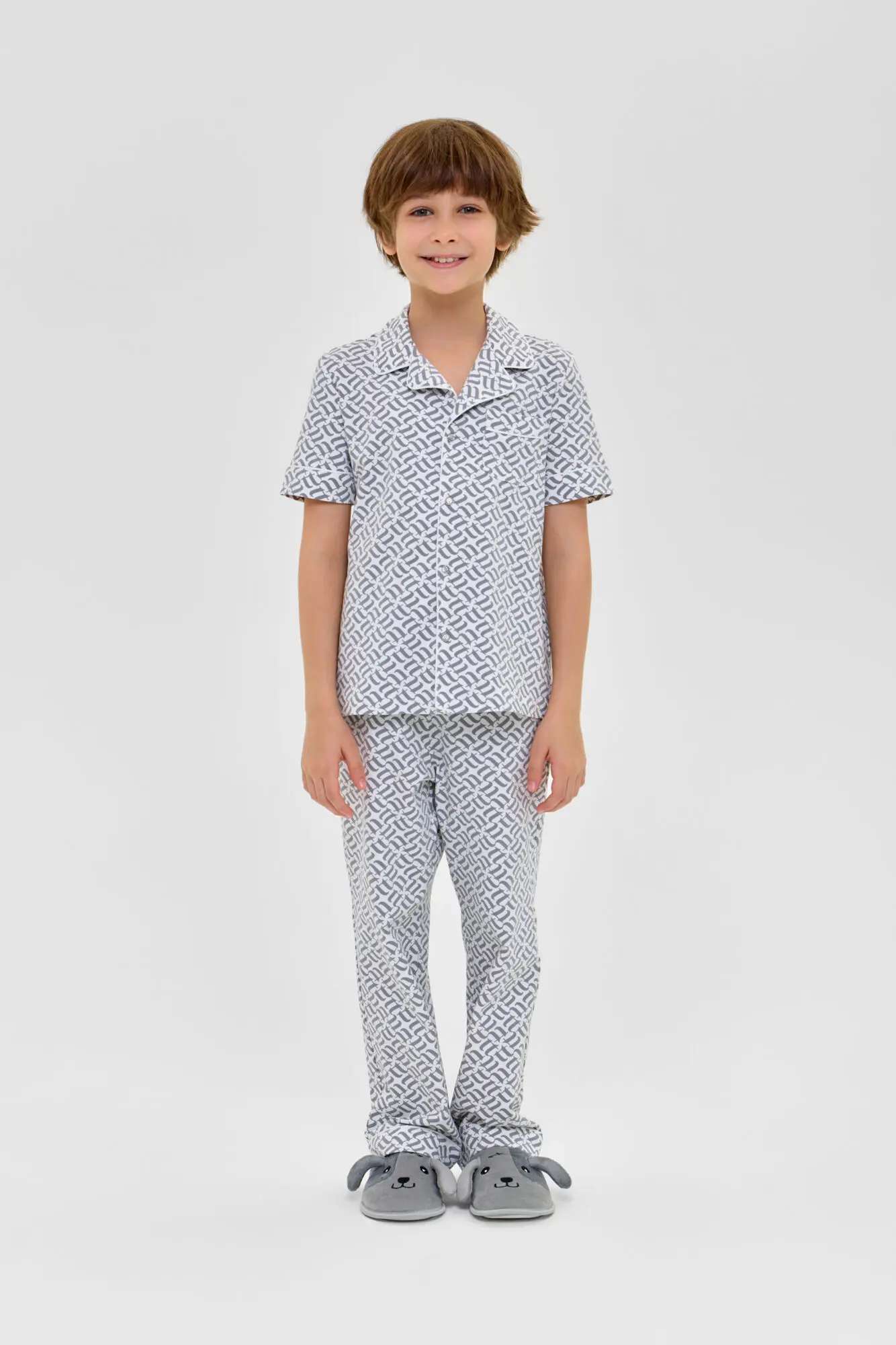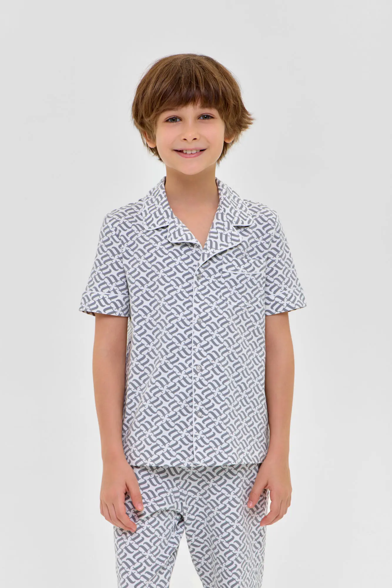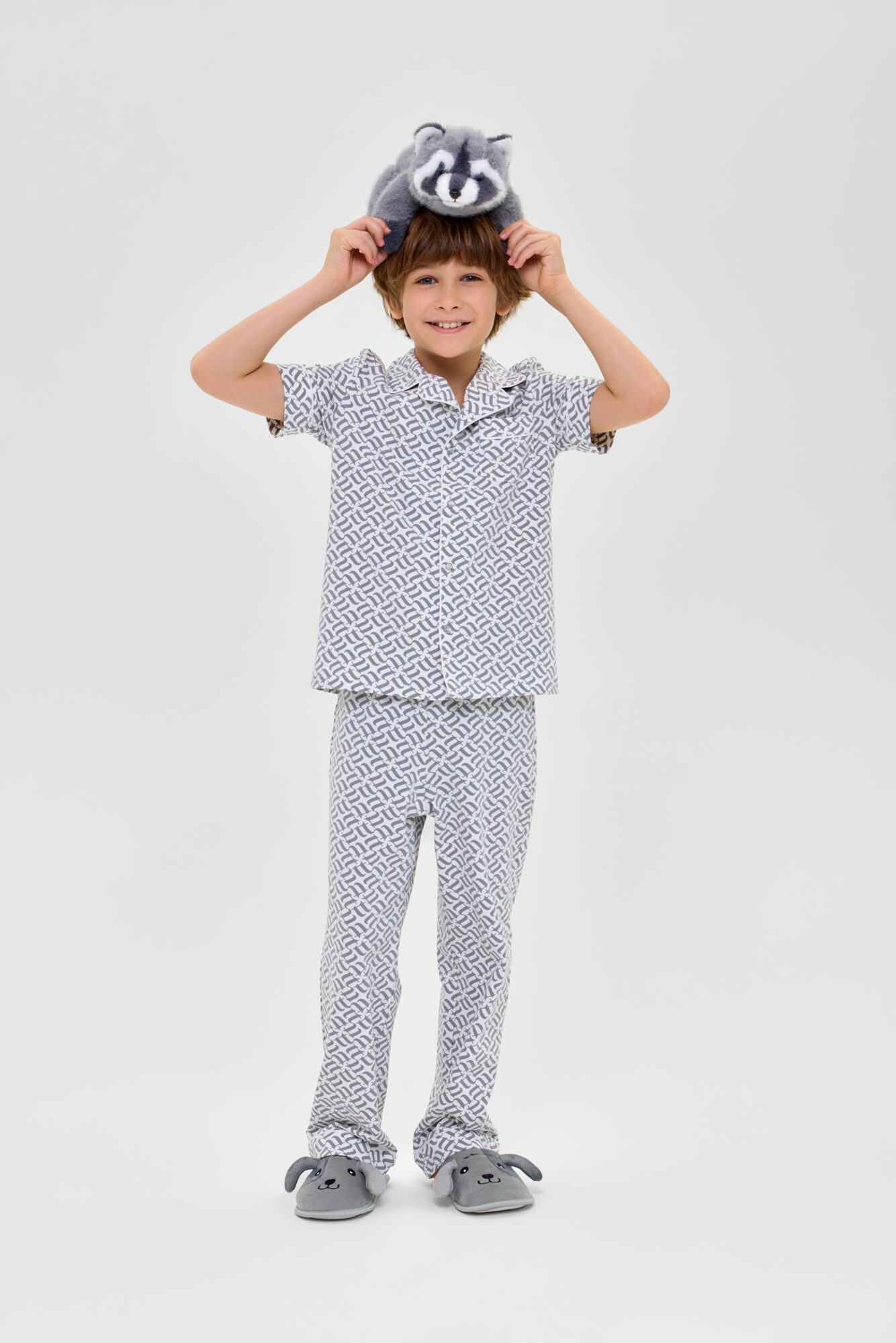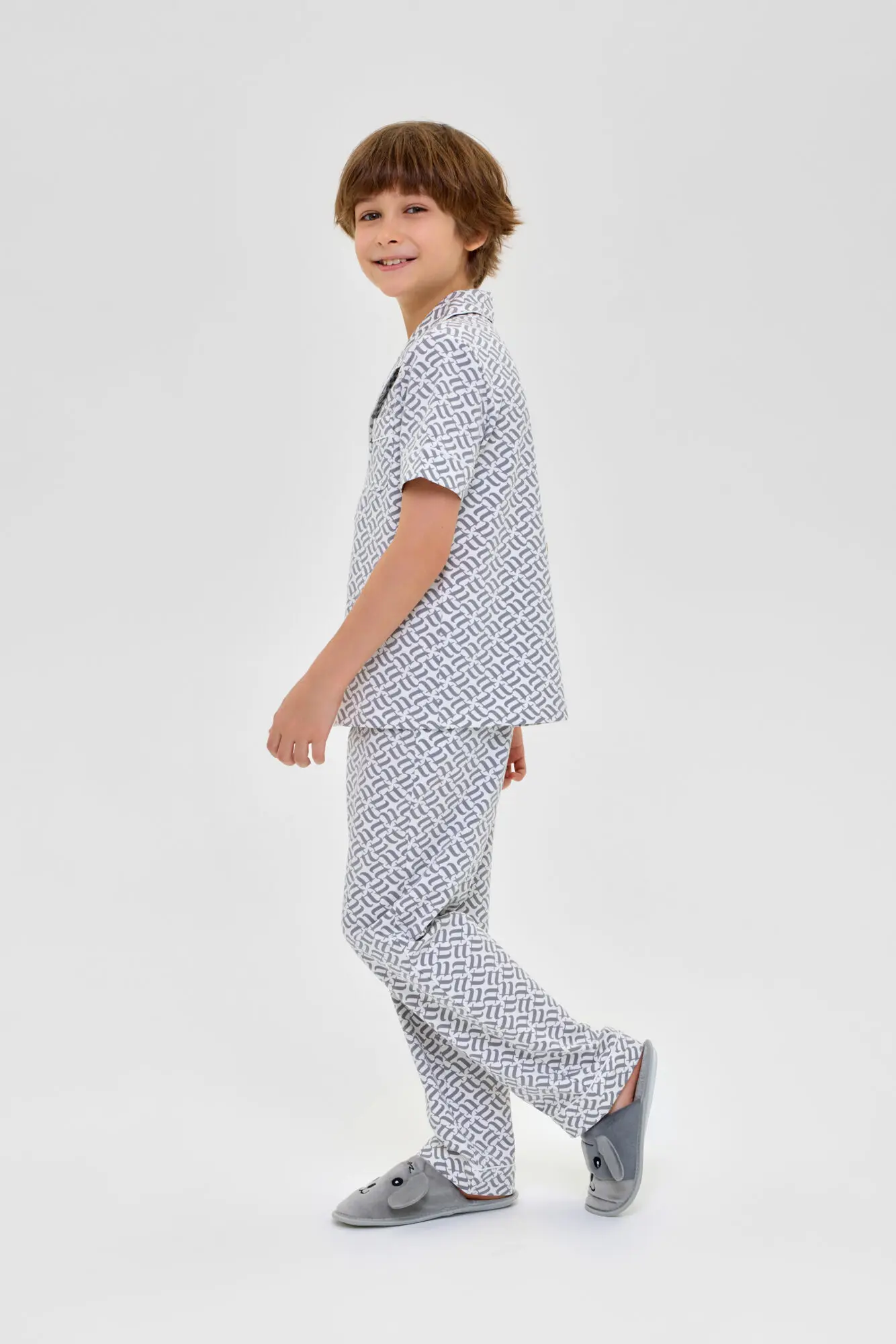 Практичный домашний комплект для мальчика включает в себя хлопковую рубашку с отложным воротником и короткими рукавами, а также широкие брюки на эластичной резинке.