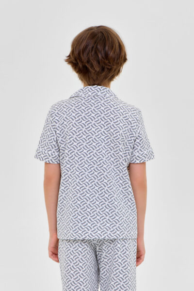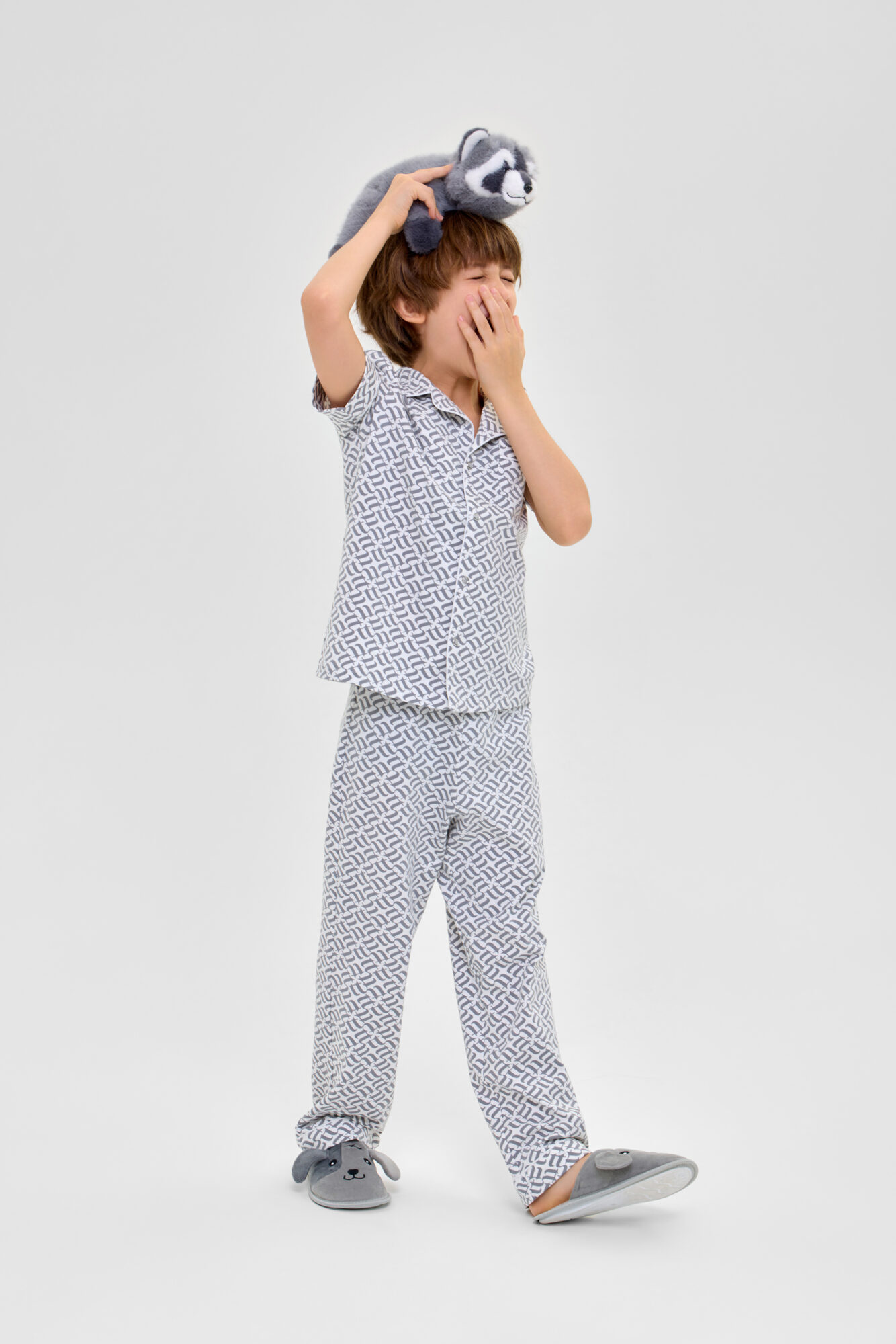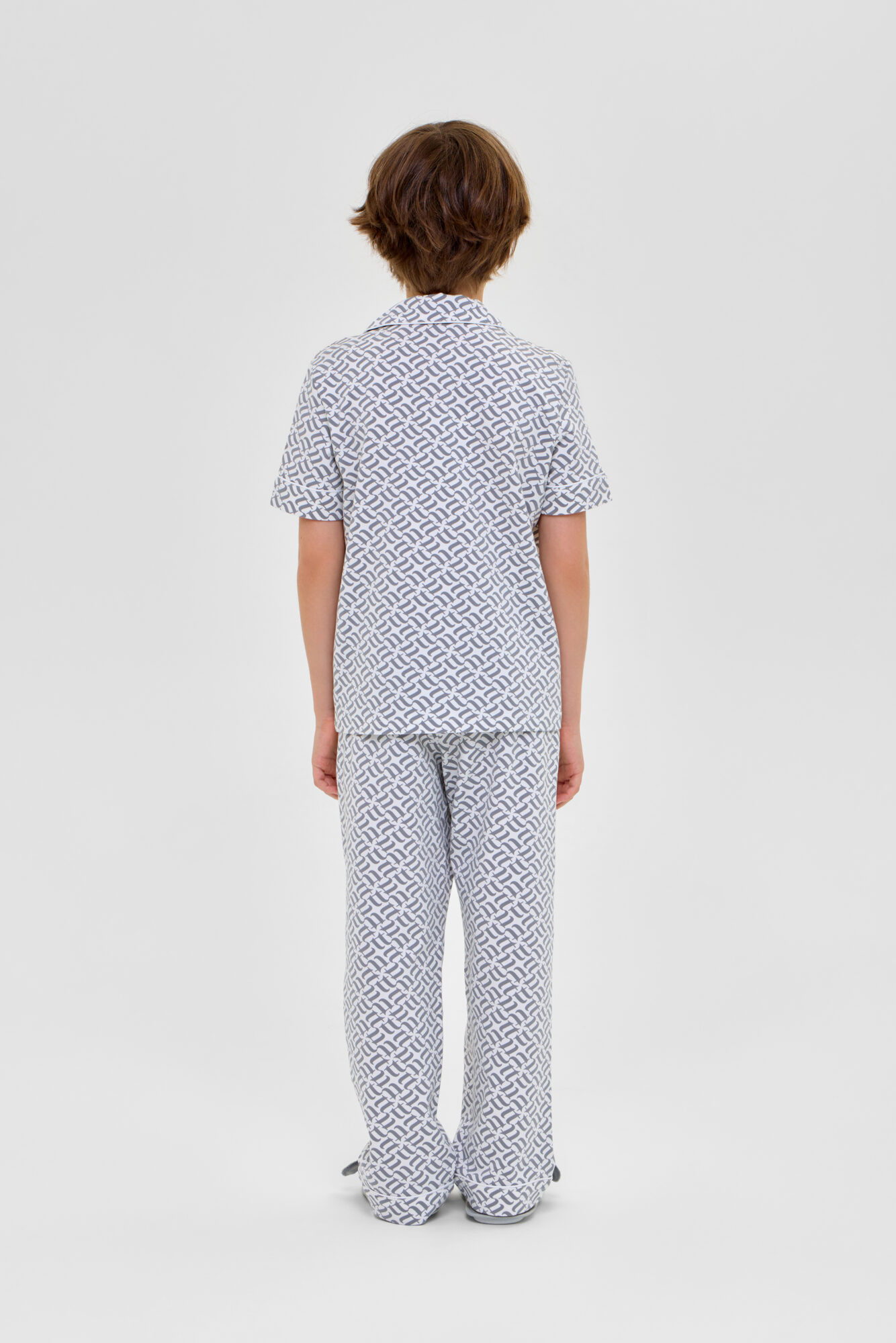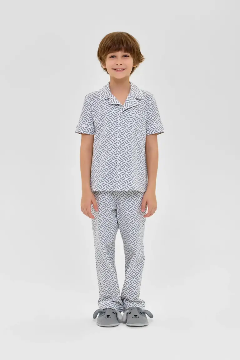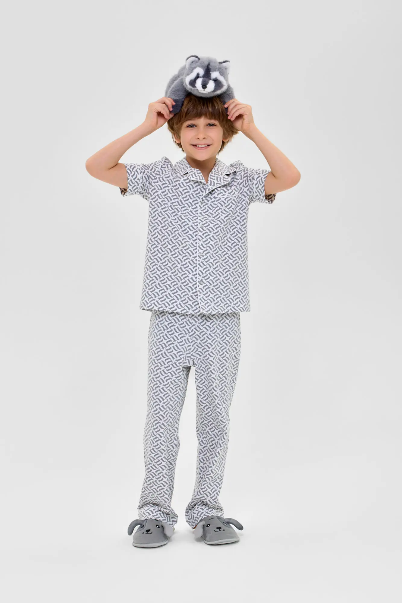 Практичный домашний комплект для мальчика включает в себя хлопковую рубашку с отложным воротником и короткими рукавами, а также широкие брюки на эластичной резинке.