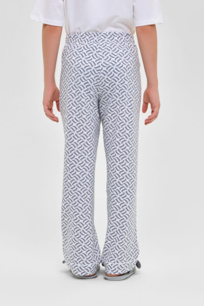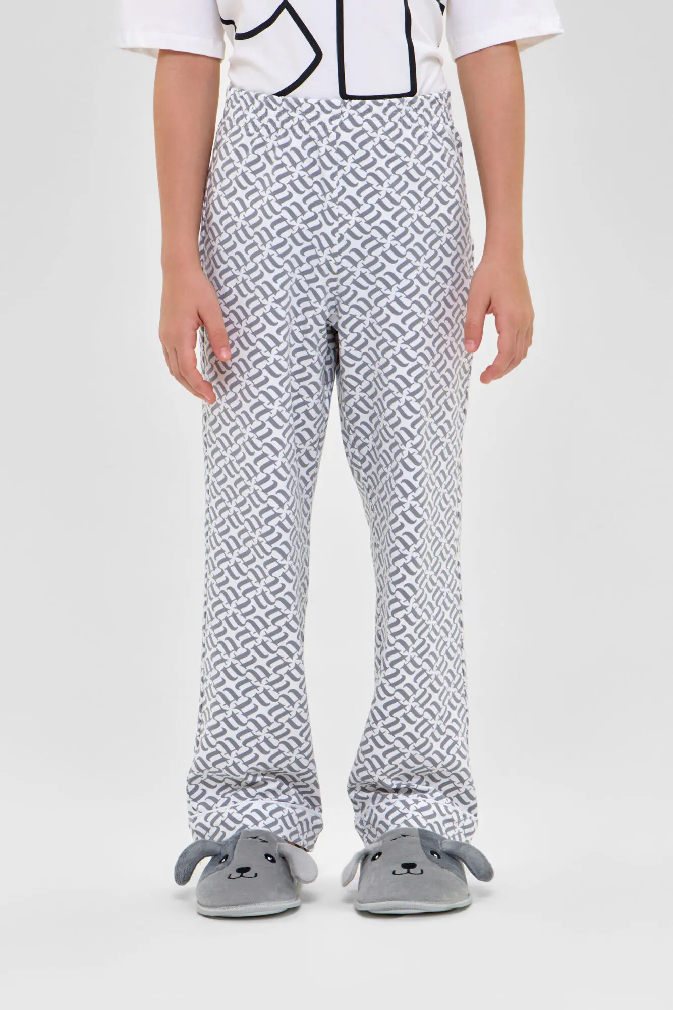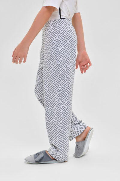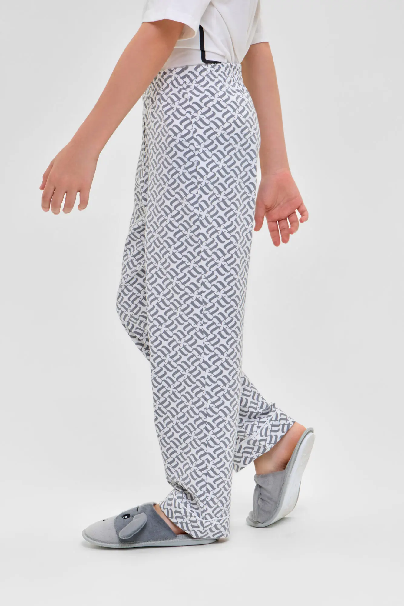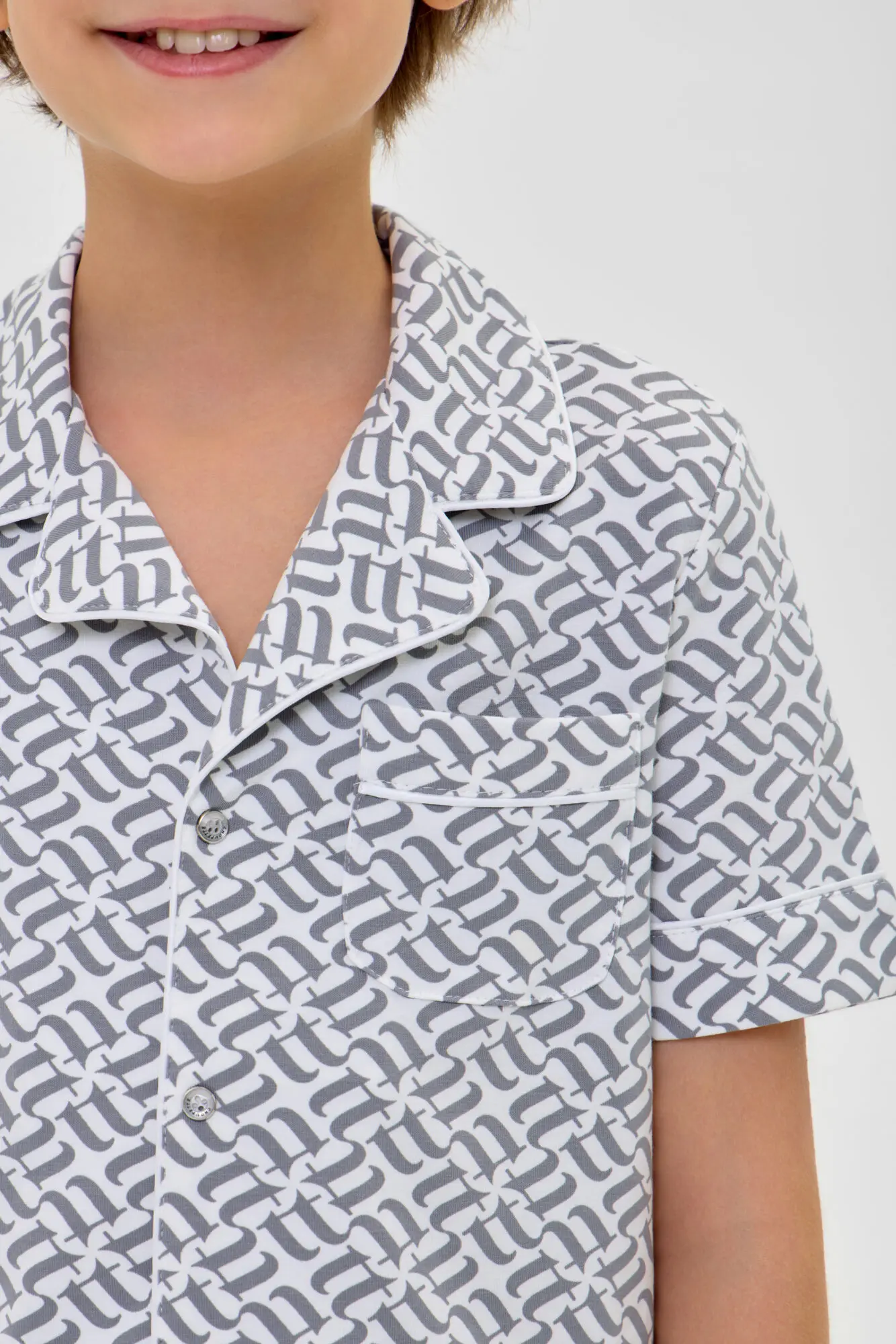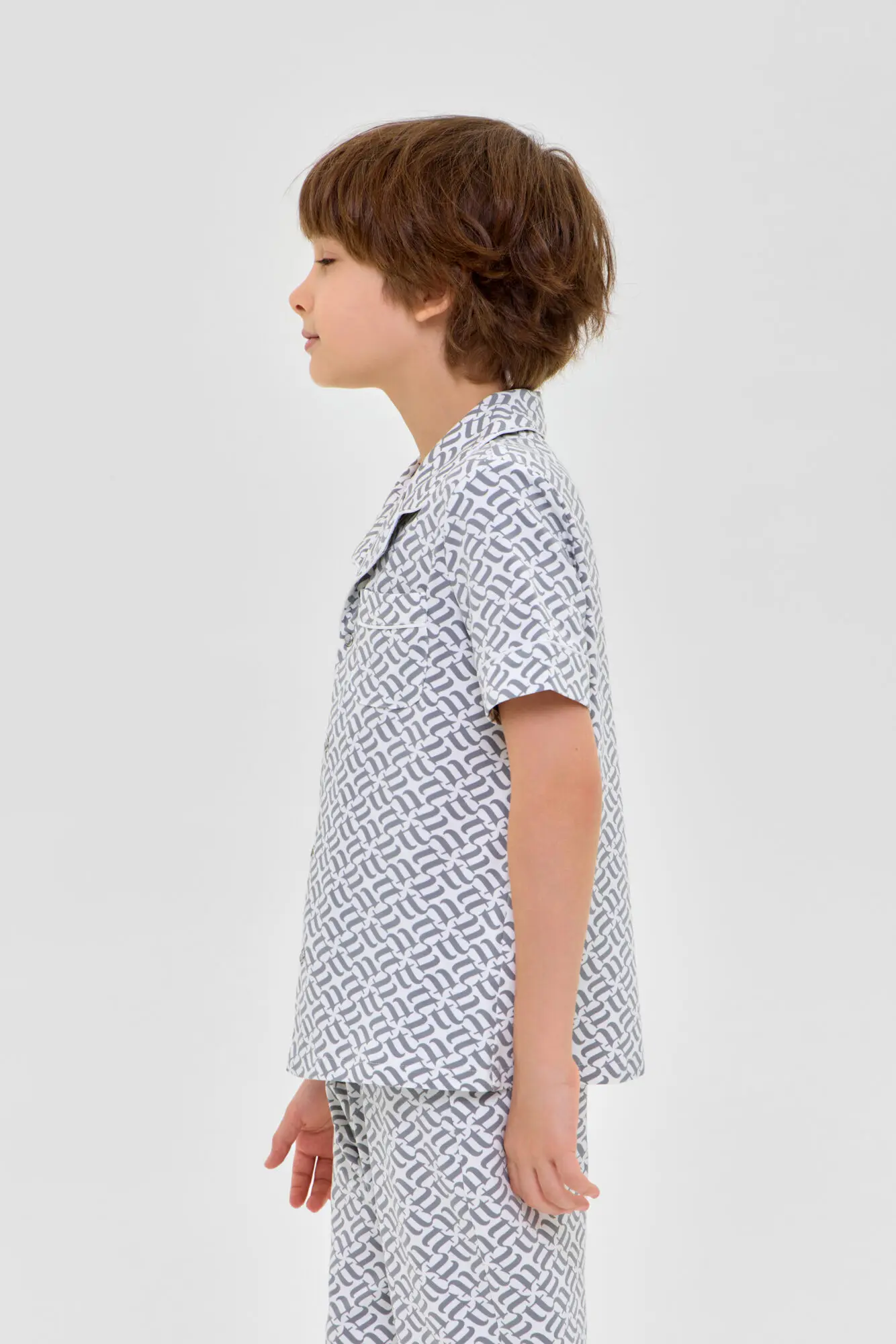 Практичный домашний комплект для мальчика включает в себя хлопковую рубашку с отложным воротником и короткими рукавами, а также широкие брюки на эластичной резинке.