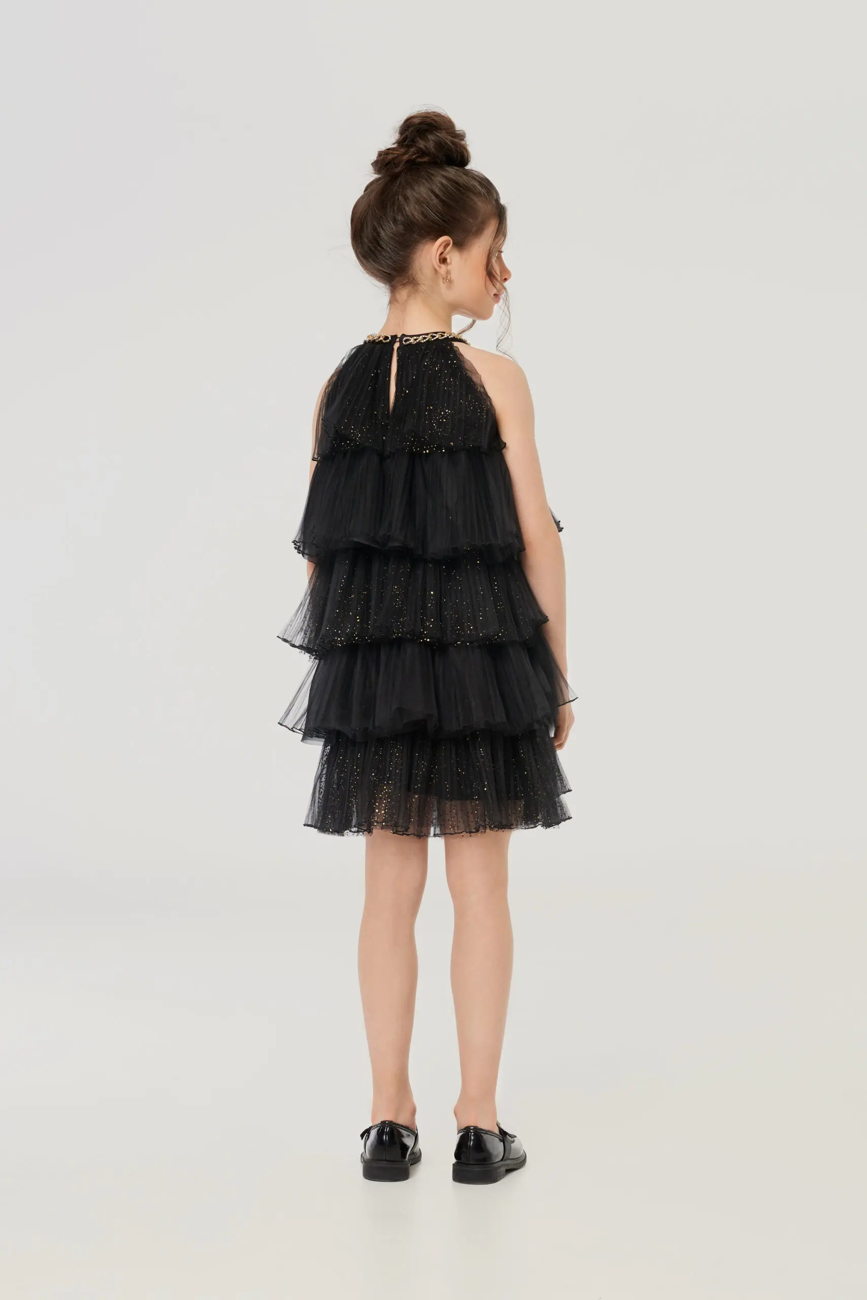 Нарядное коктейльное платье для девочки - идеальный выбор для юбилеев, торжеств и других памятных событий. Свободный крой и безрукавный силуэт обеспечивают свободу движений, а длина, чуть ... выше колен, придает наряду легкость и изящество. Каскады струящихся объемных воланов, выполненных из плиссированной ткани, создают волшебный эффект. Мерцающий глитер, аккуратно распределенный по поверхности, добавляет наряду особой искры, делая его настоящим украшением любого праздника. Золотая цепочка, изящно обвивающая горловину, завершает этот великолепный образ, придавая ему нотку роскоши. Внутренний подклад из натурального хлопка заботится о комфорте, позволяя коже дышать и не создавая дискомфорта в течение долгого времени ношения.