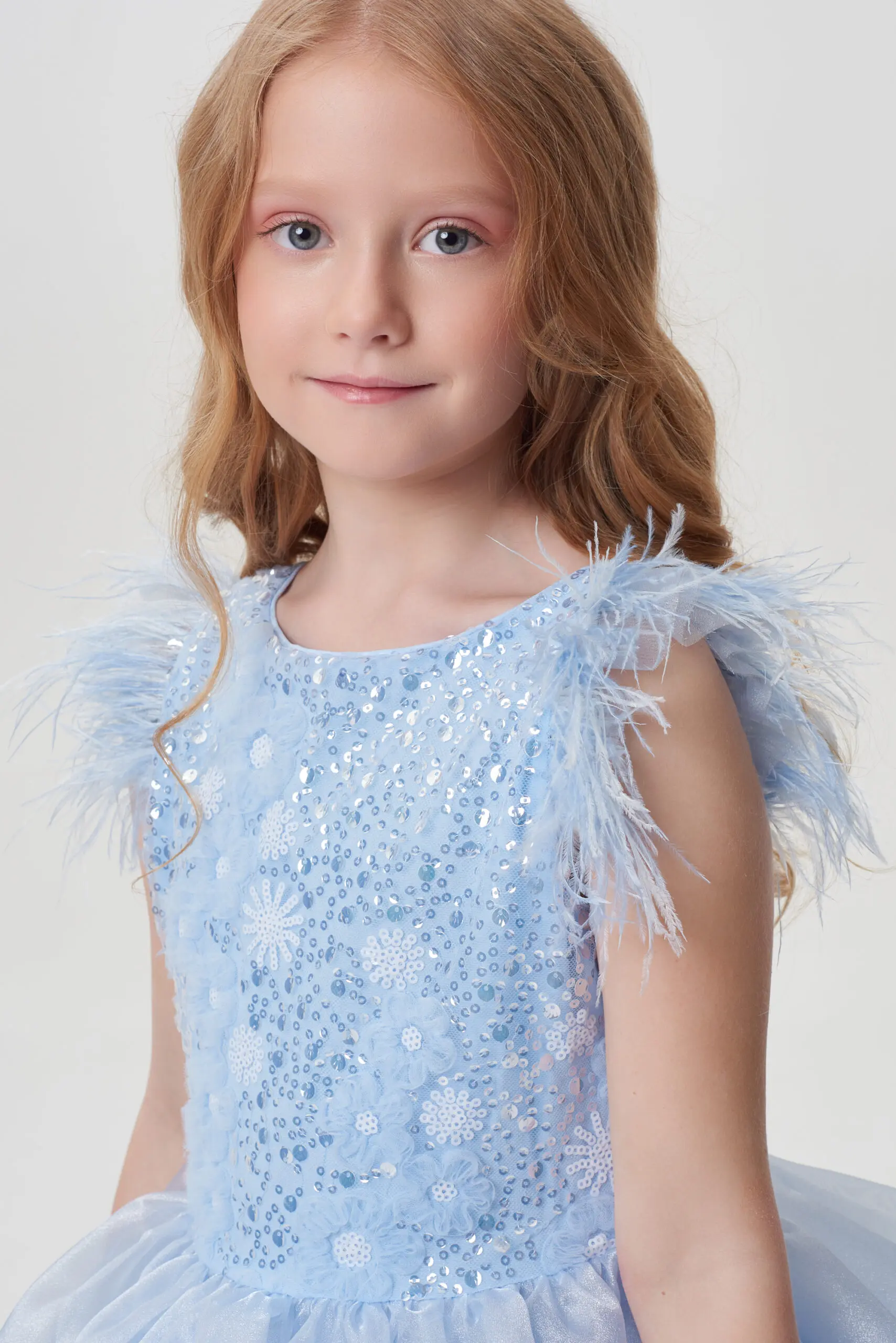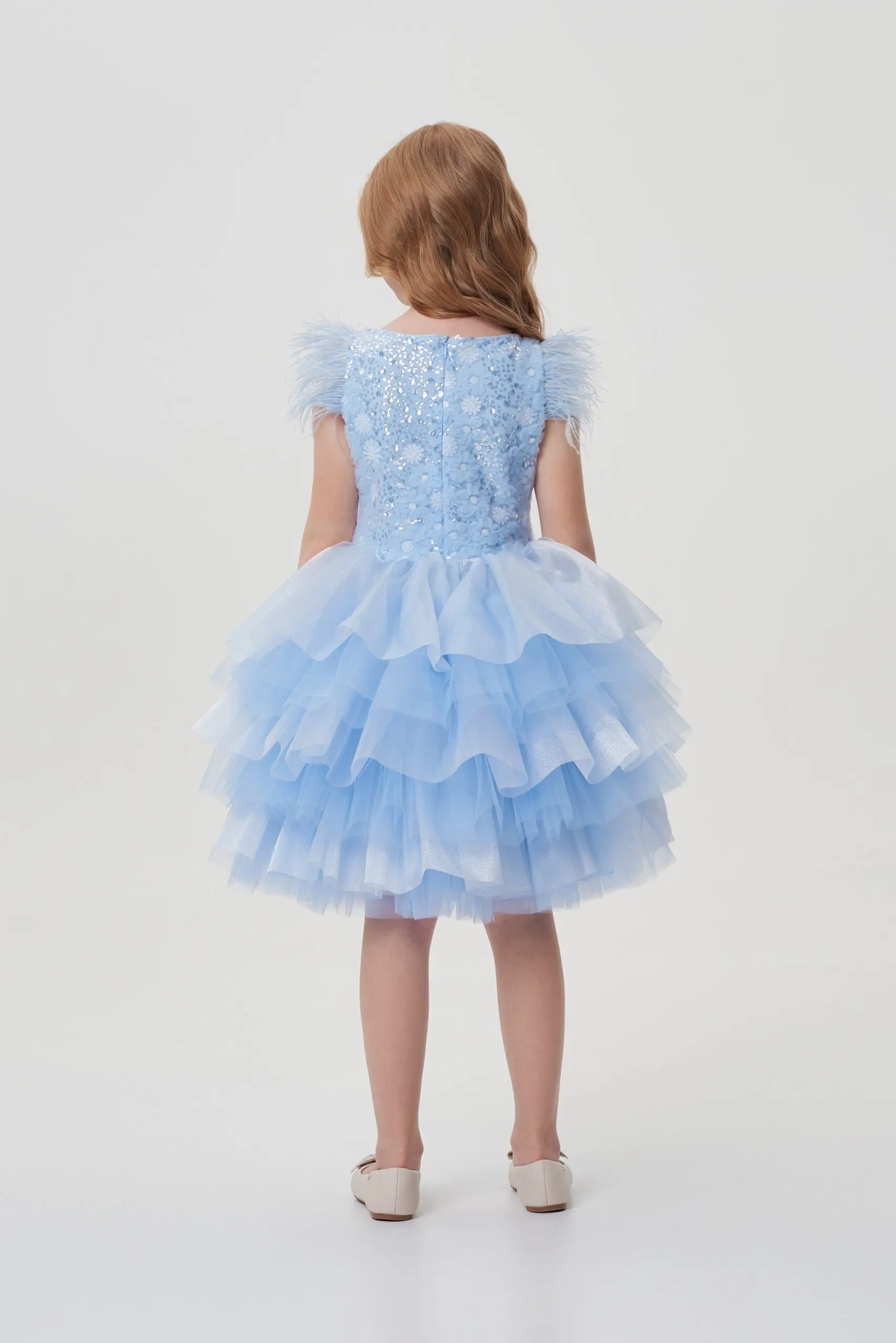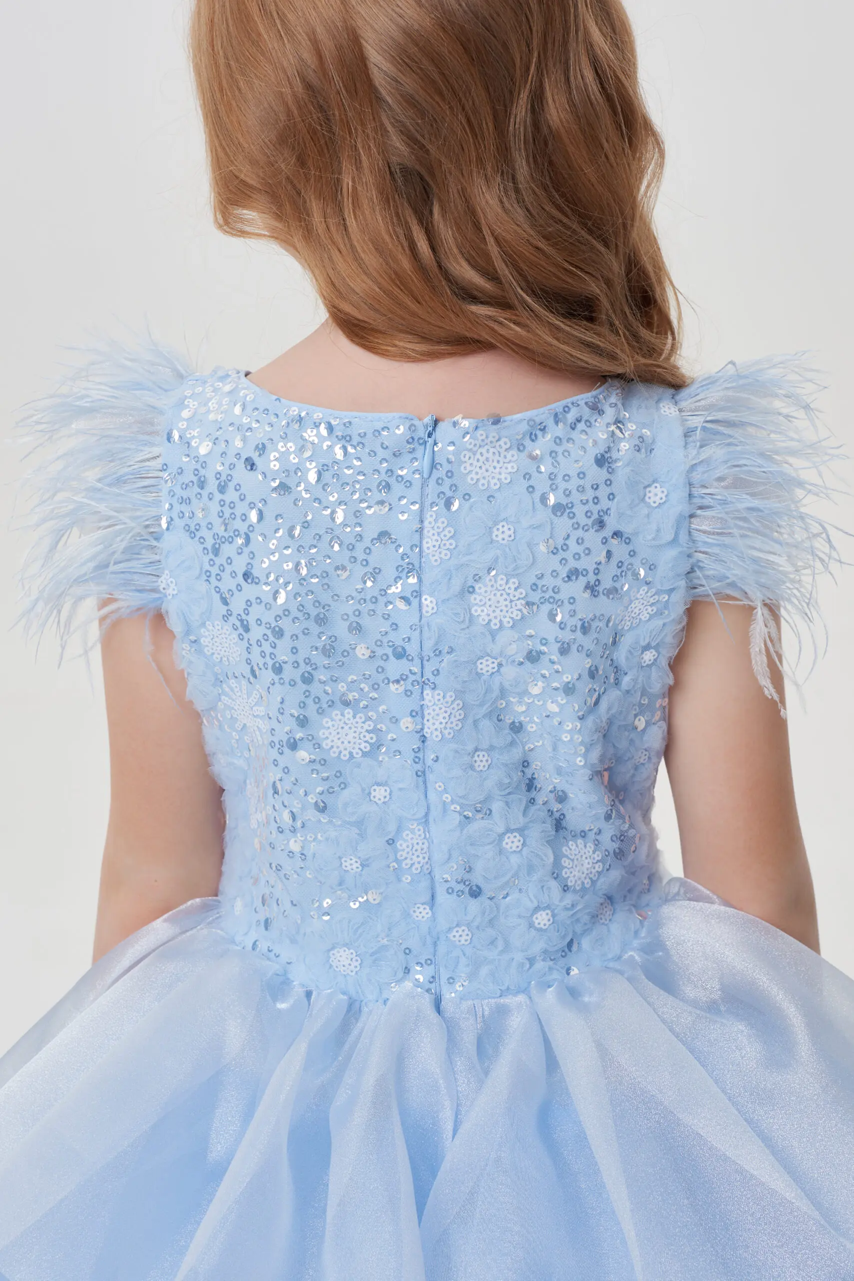 Рукава крылышки украшены мягкими перьями, добавляя платью воздушности и легкости.