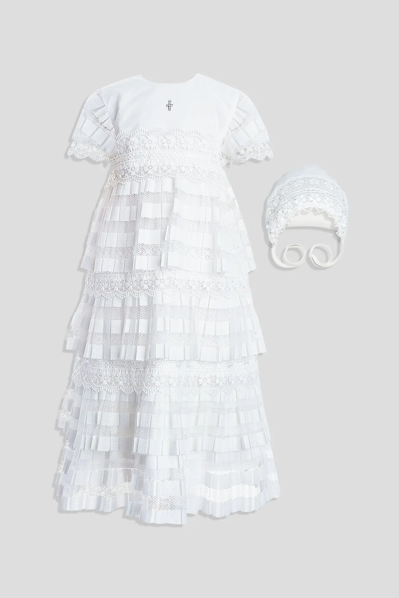 Хлопковый наряд свободного силуэта с застежкой на пуговицы украшен прошвами с кружевами. В комплекте − чепчик-капор с аналогичным декором.