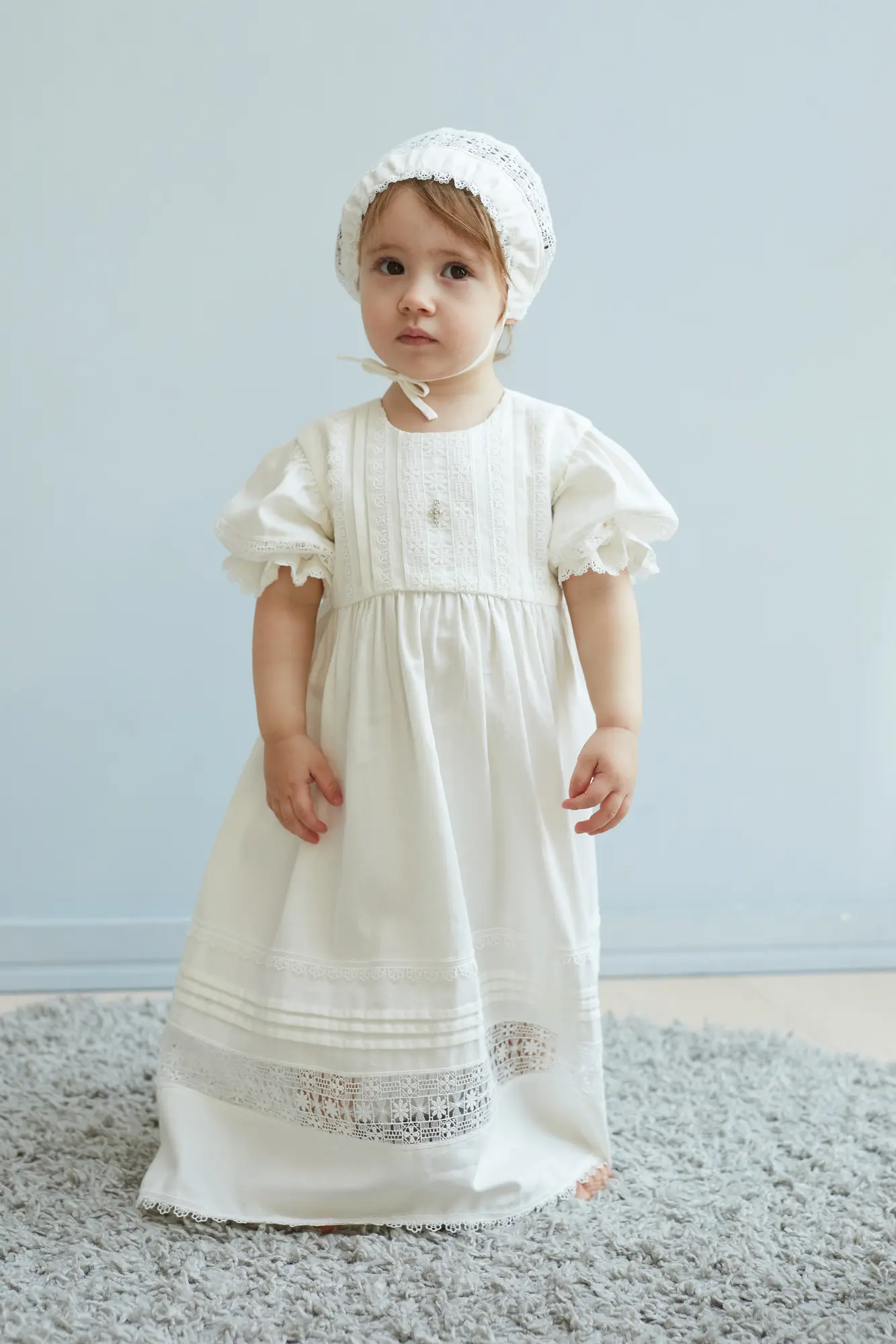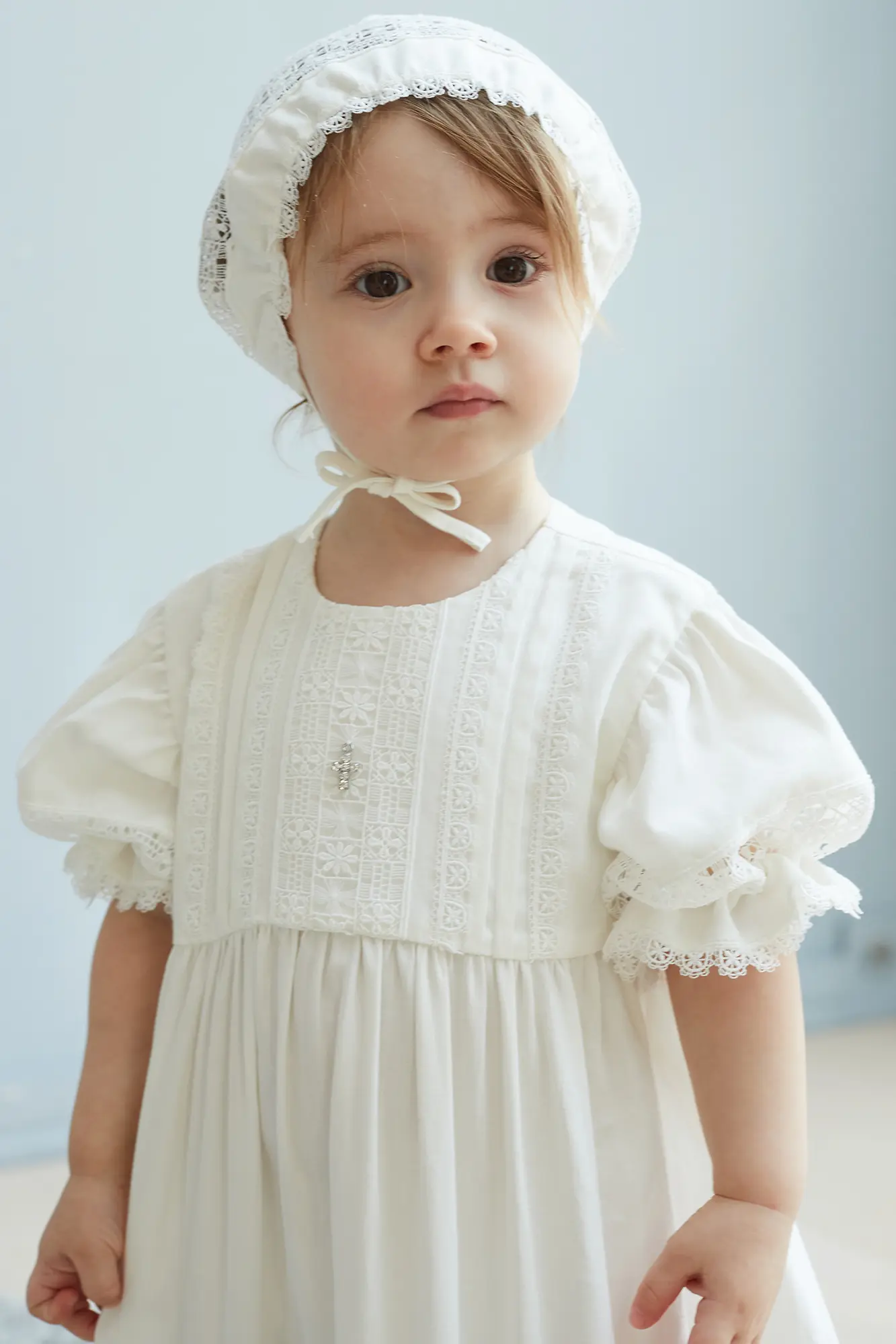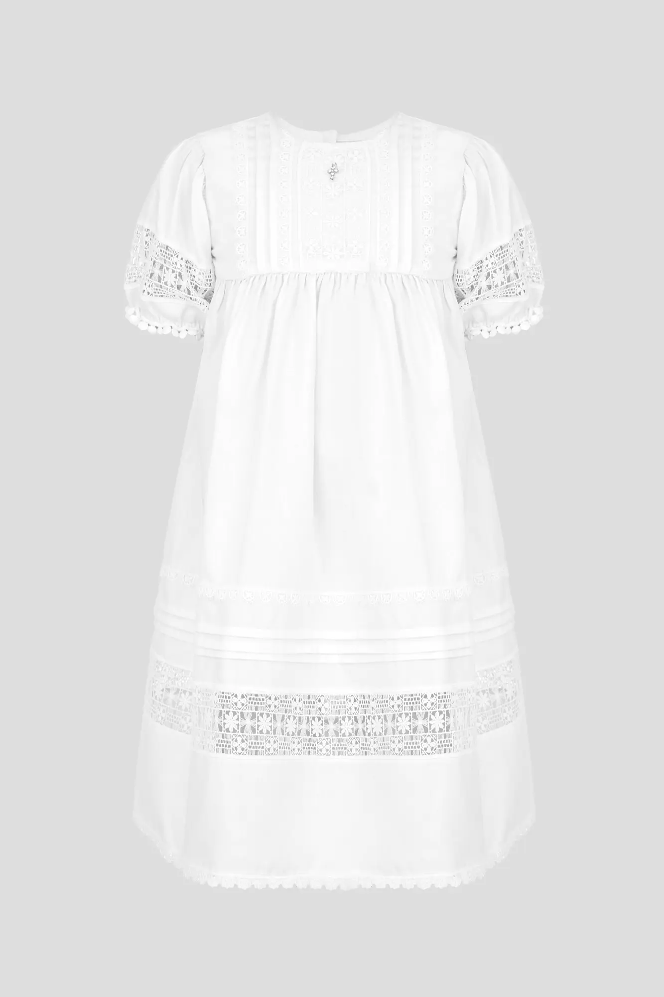 Крестильный наряд несет глубокий духовный смысл, его бережно хранят на протяжении всей жизни. Не менее важно, чтобы одеяние было удобным в использовании, младенцу должно быть комфортно ... на таинстве. Модель цвета слоновой кости − лидер продаж в нашей коллекции, это восхитительное платье покоряет с первого взгляда. Хлопковый костюм свободного кроя с застежкой на пуговицы украшен кружевной вышивкой. В наборе − шапочка-капор с идентичным украшением.