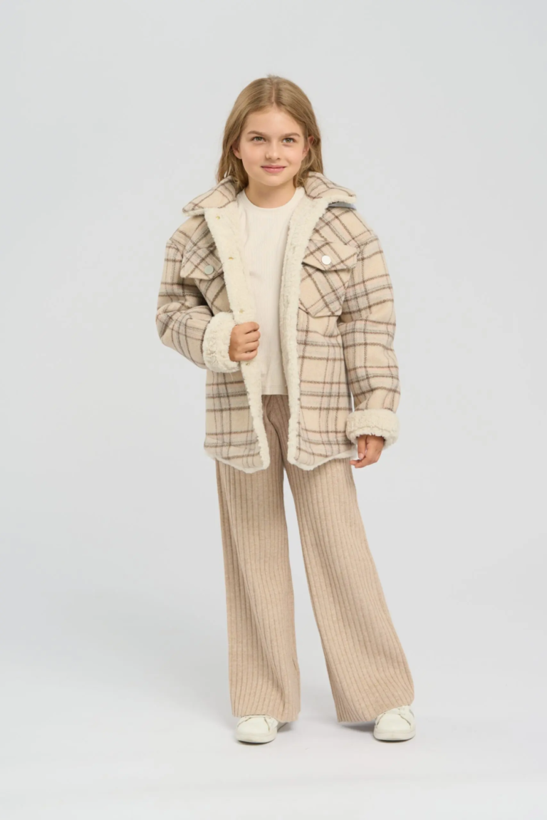 Куртка-рубашка бежевого оттенка идеально дополнит демисезонный образ девочки. Модель украшена актуальным рисунком в клетку. Трендовая отделка из меха-тедди украшает линию застежки и манжеты куртки. Фигурный край ... гармонично продолжает дизайн. Комфортный прямой силуэт не сковывает движения ребенка и позволяет носить с курткой одежду объемной вязки. Куртка дополнена съемным однотонным воротником. Застежка на кнопки удобна в эксплуатации.