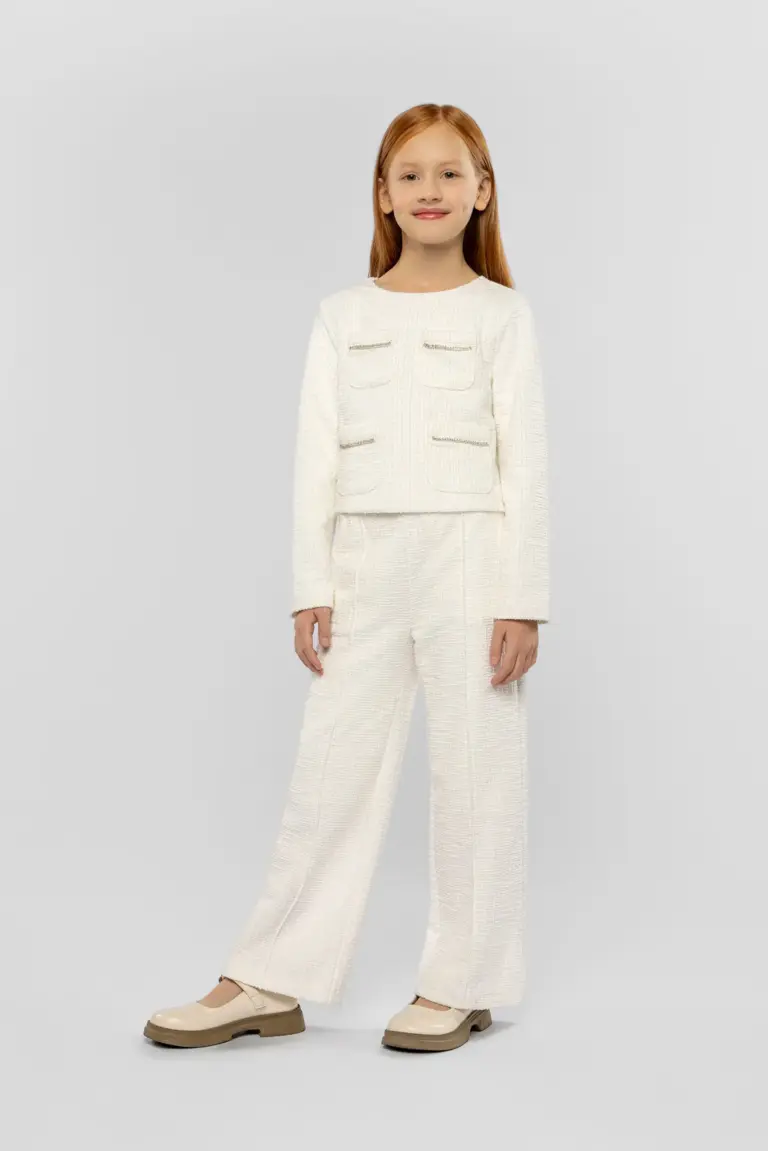 Трикотажные брюки для девочки в модном тепло-белом оттенке – это не только стильный, но и практичный выбор для юных модниц. Модель прямого кроя со стрелками придаёт ... образу аккуратность и изысканность. Эластичная контрастная резинка черного цвета на поясе обеспечивает идеальную посадку по фигуре. Сзади брюки украшены карманом-обманкой. Данная модель идеально сочетается с топами различных оттенков, кофточками и нейтральными блузами. В сочетании с жакетом из той же коллекции, они формируют гармоничный ансамбль.