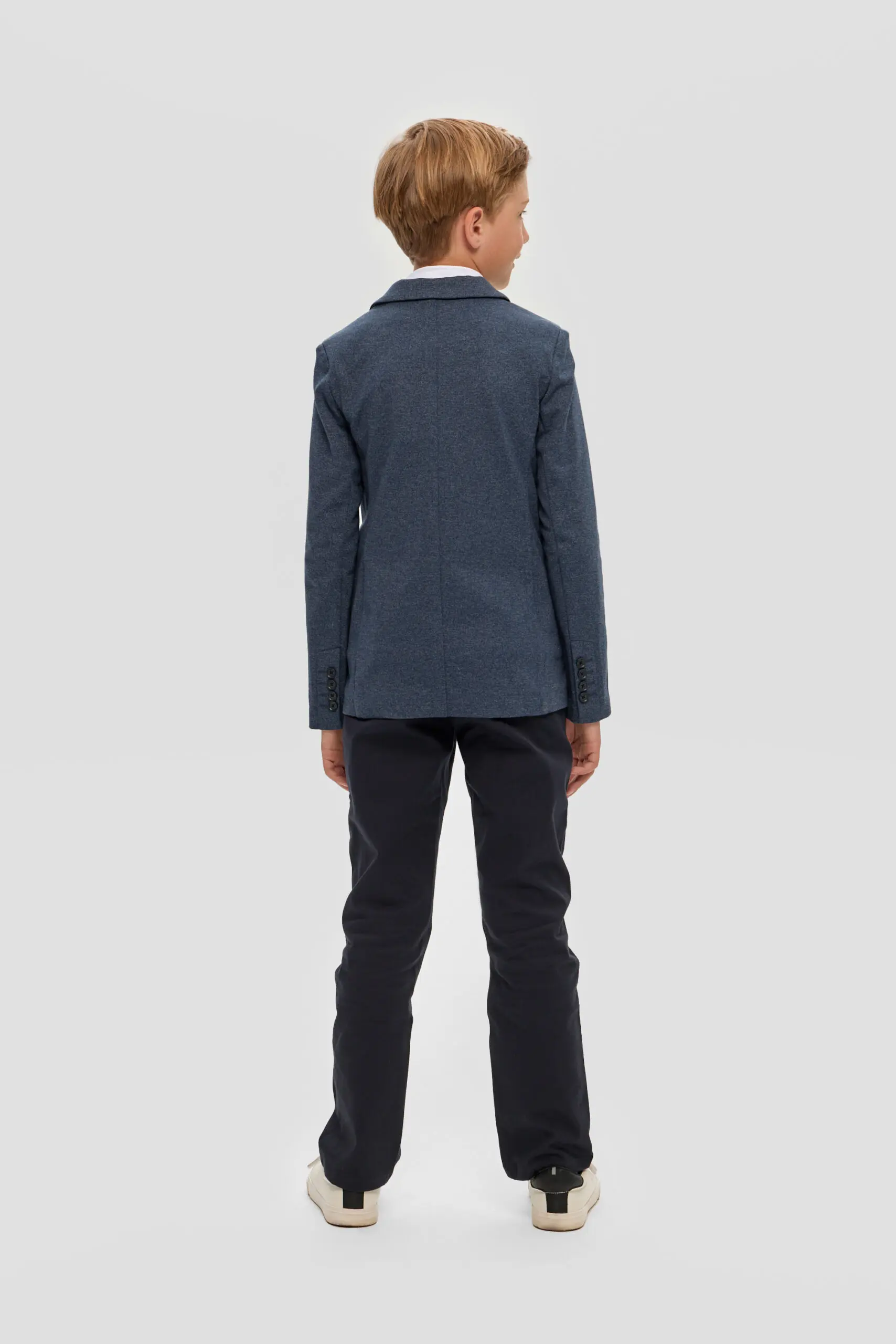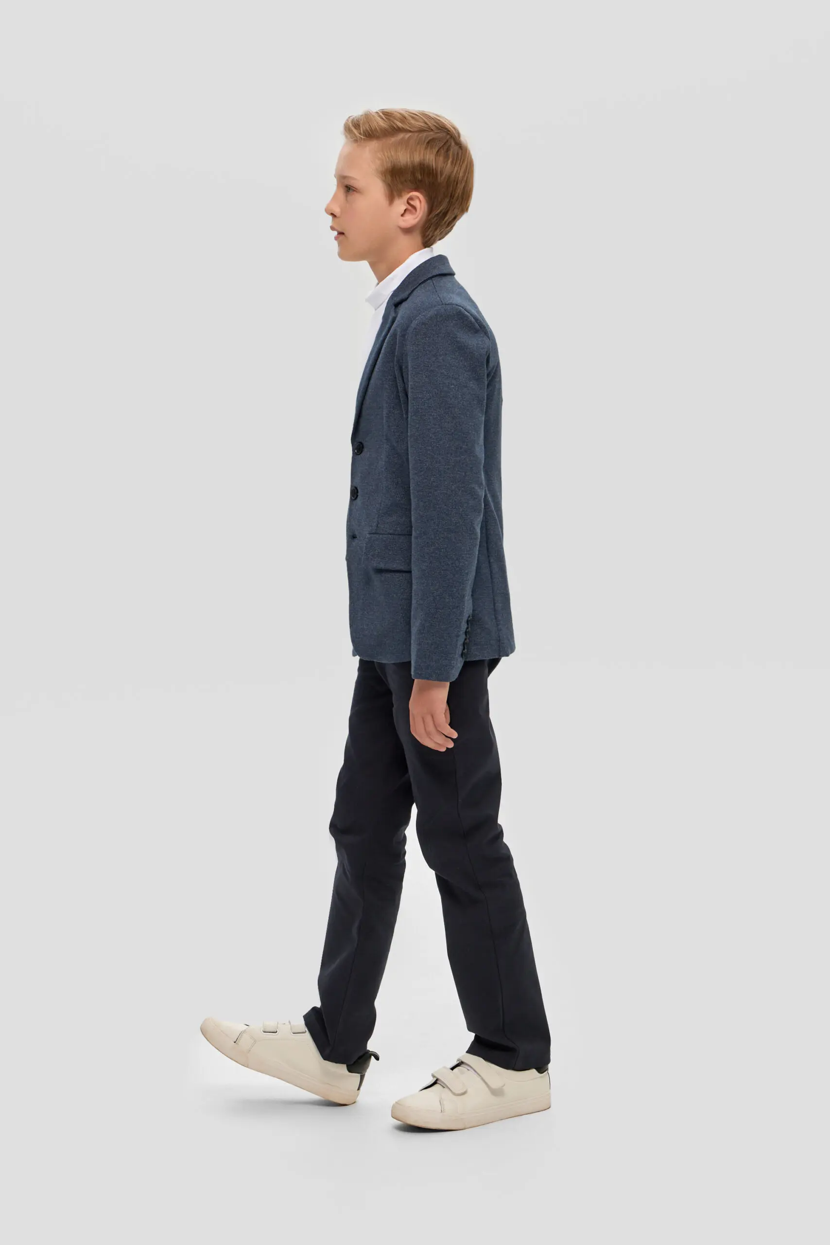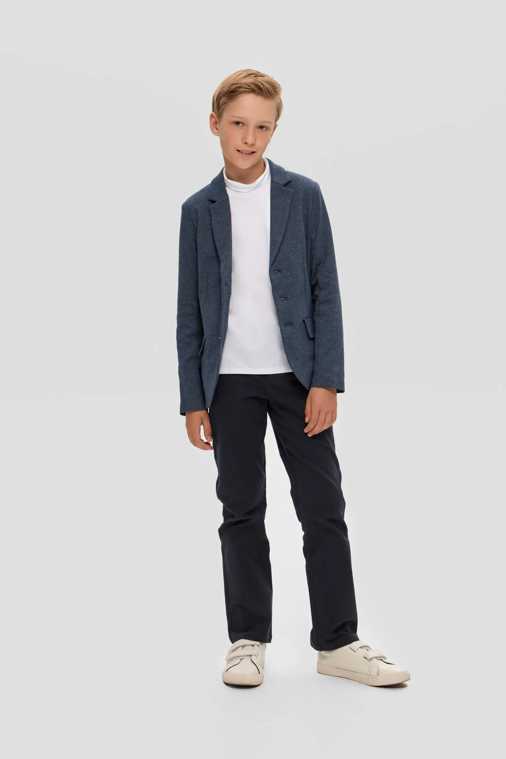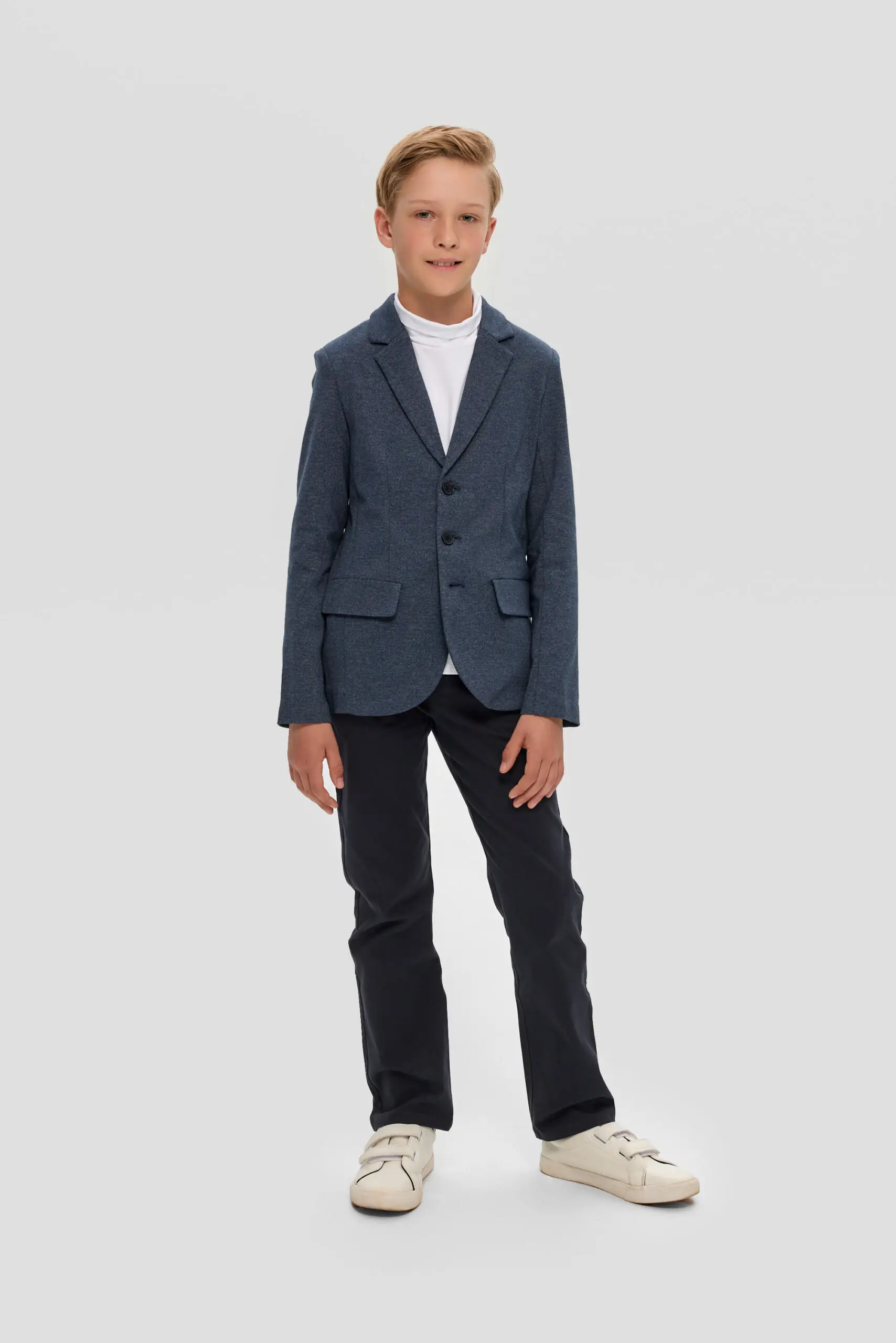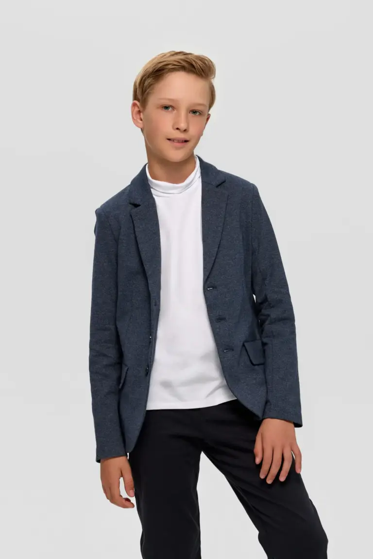 Пиджак из трикотажного полотна – многофункциональный элемент гардероба для юного ученика, который в тандеме со светлой сорочкой или тонким свитером создает нарядный и эффектный внешний вид. ... Отличное решение для торжественного события. Модная и удобная модель из футера в синей гамме имеет традиционный фасон: карманы с клапанами, лацканы на воротнике, шлица сзади. Декоративный элемент – несколько пуговиц на манжетах.