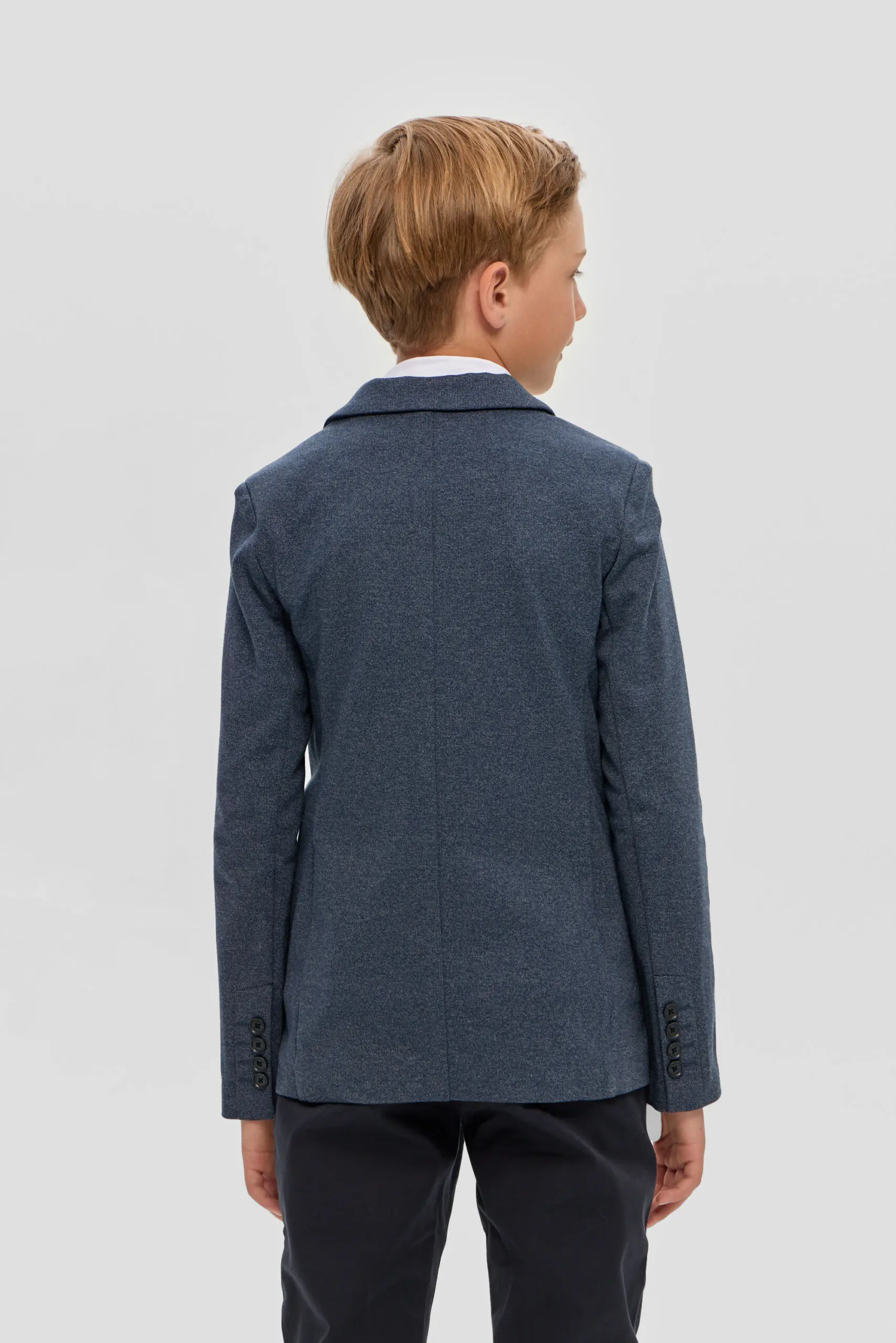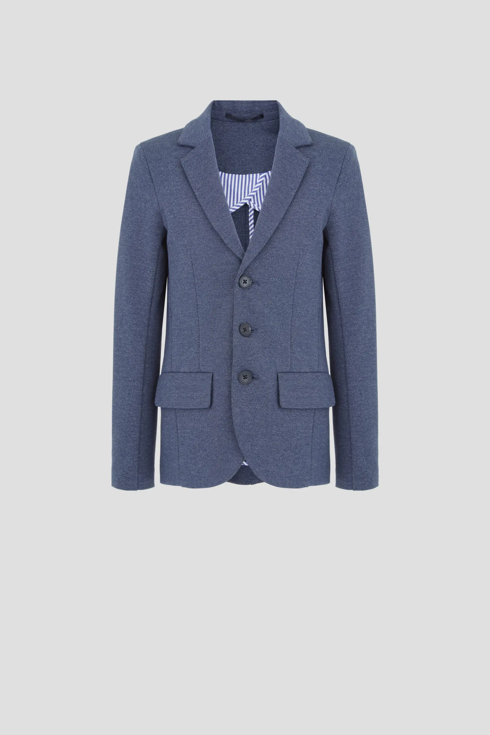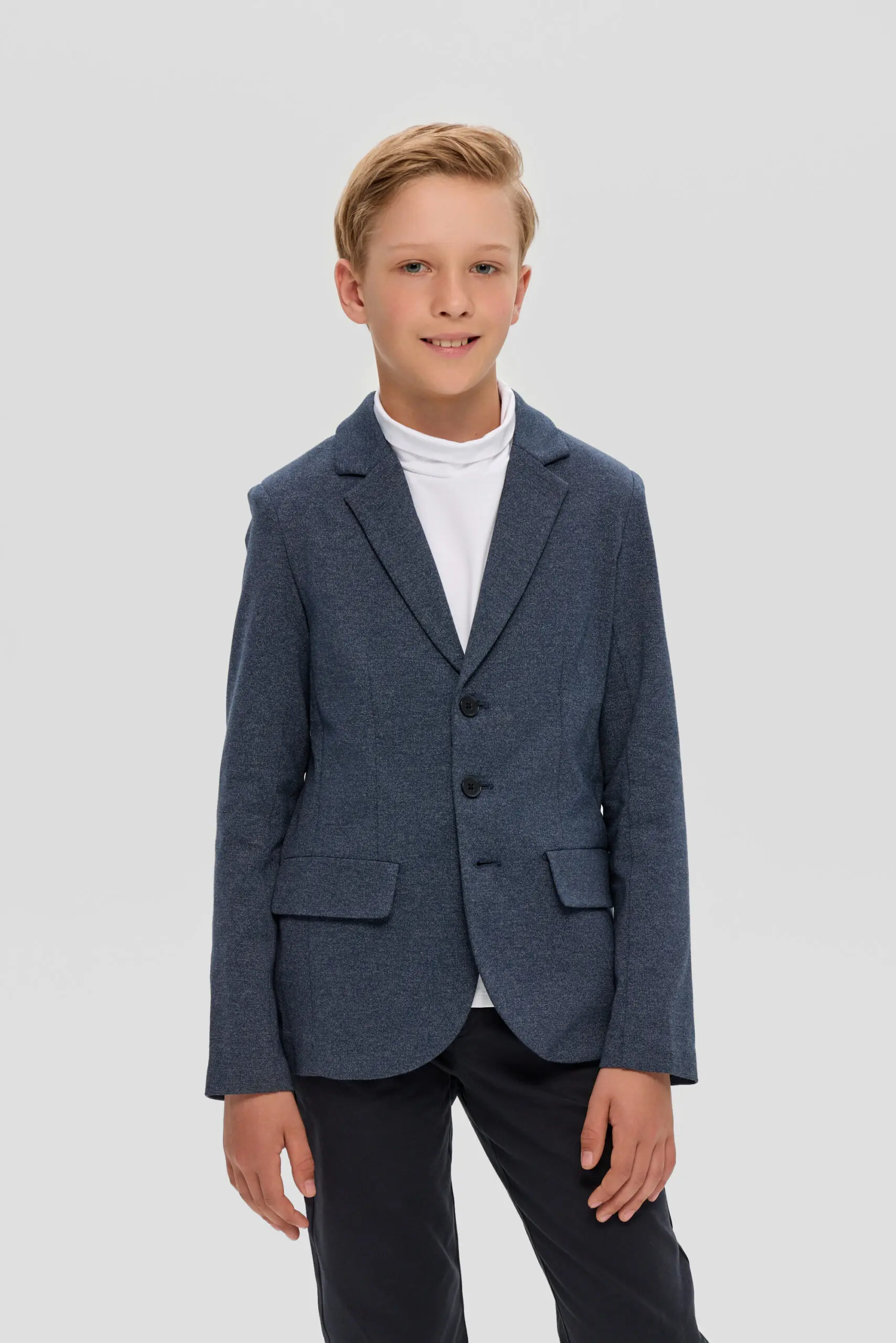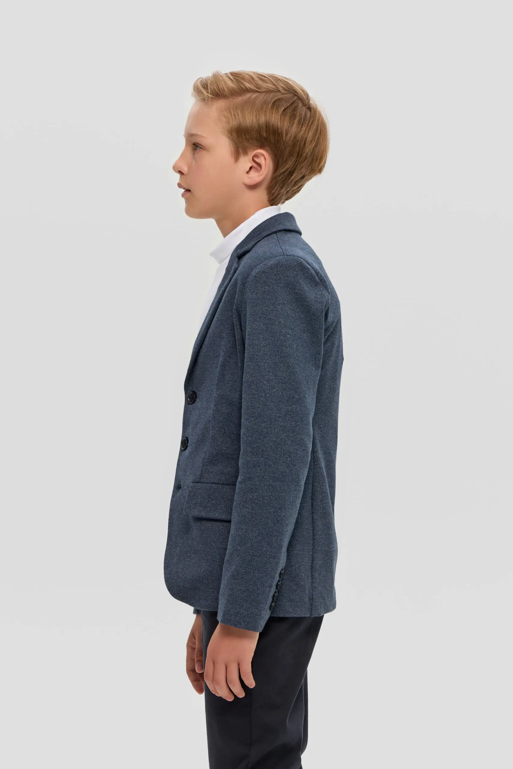 Пиджак из трикотажного полотна – многофункциональный элемент гардероба для юного ученика, который в тандеме со светлой сорочкой или тонким свитером создает нарядный и эффектный внешний вид. ... Отличное решение для торжественного события. Модная и удобная модель из футера в синей гамме имеет традиционный фасон: карманы с клапанами, лацканы на воротнике, шлица сзади. Декоративный элемент – несколько пуговиц на манжетах.