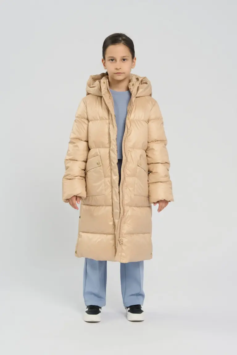 Длинное утепленное пальто для девочки выполнено в актуальном бежевом оттенке, который придаёт изделию универсальность и стильный вид. Поперечная стежка добавляет поверхности красивыВсе товарый рельеф. Двойная застёжка ... на молнию и кнопки обеспечивает надежную защиту от ветра и холода. Капюшон добавляет дополнительный комфорт, защищая от дождя и снега. Разрезы по бокам на кнопках позволяют ребенку легко двигаться. Данная модель не только защитит ребенка от ветра и холода, но и украсит любой модный образ. В качестве наполнителя в изделии используется синтепух - легкий и воздухопроницаемый, но при этом обладающий высокими теплоизоляционными свойствами материал.