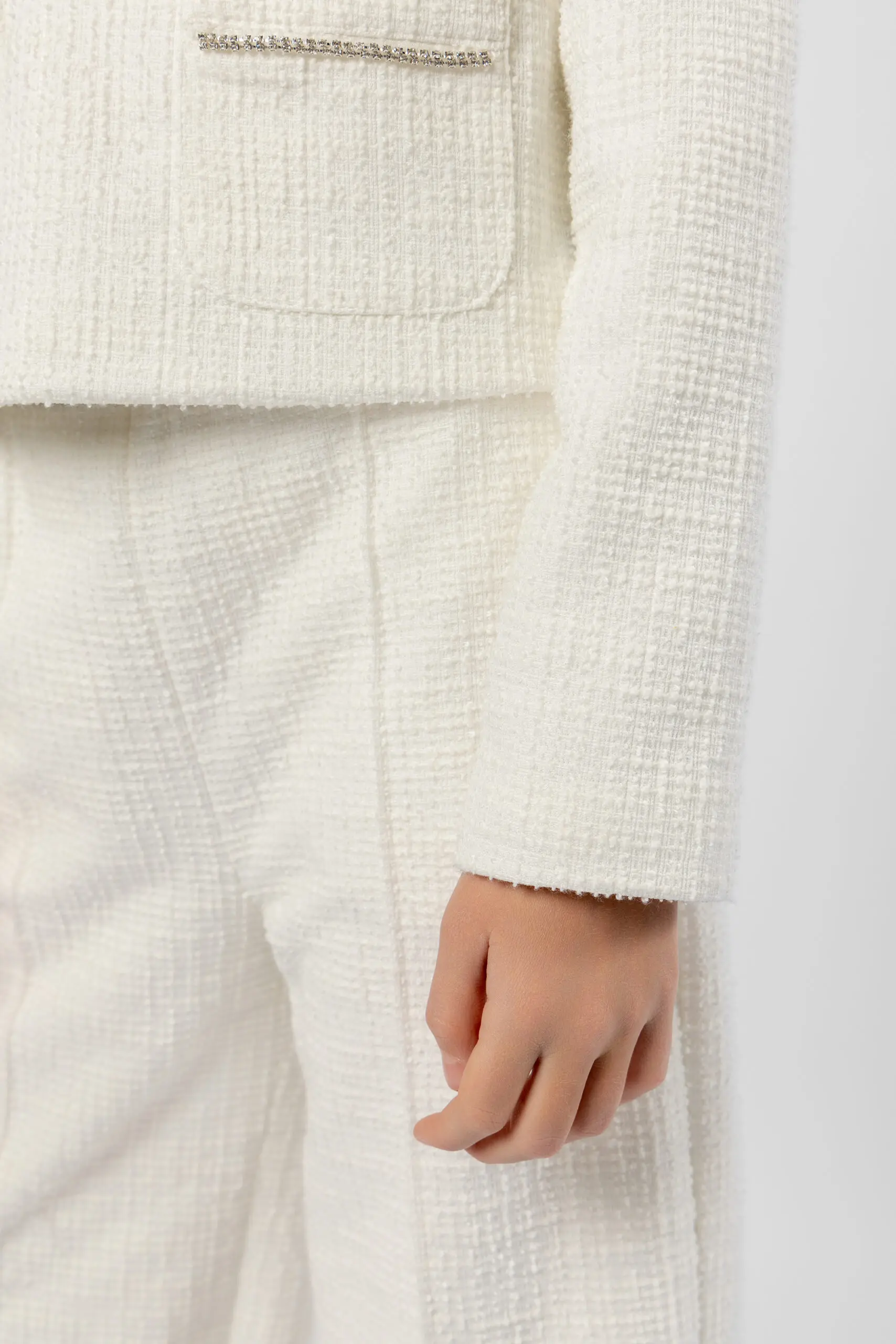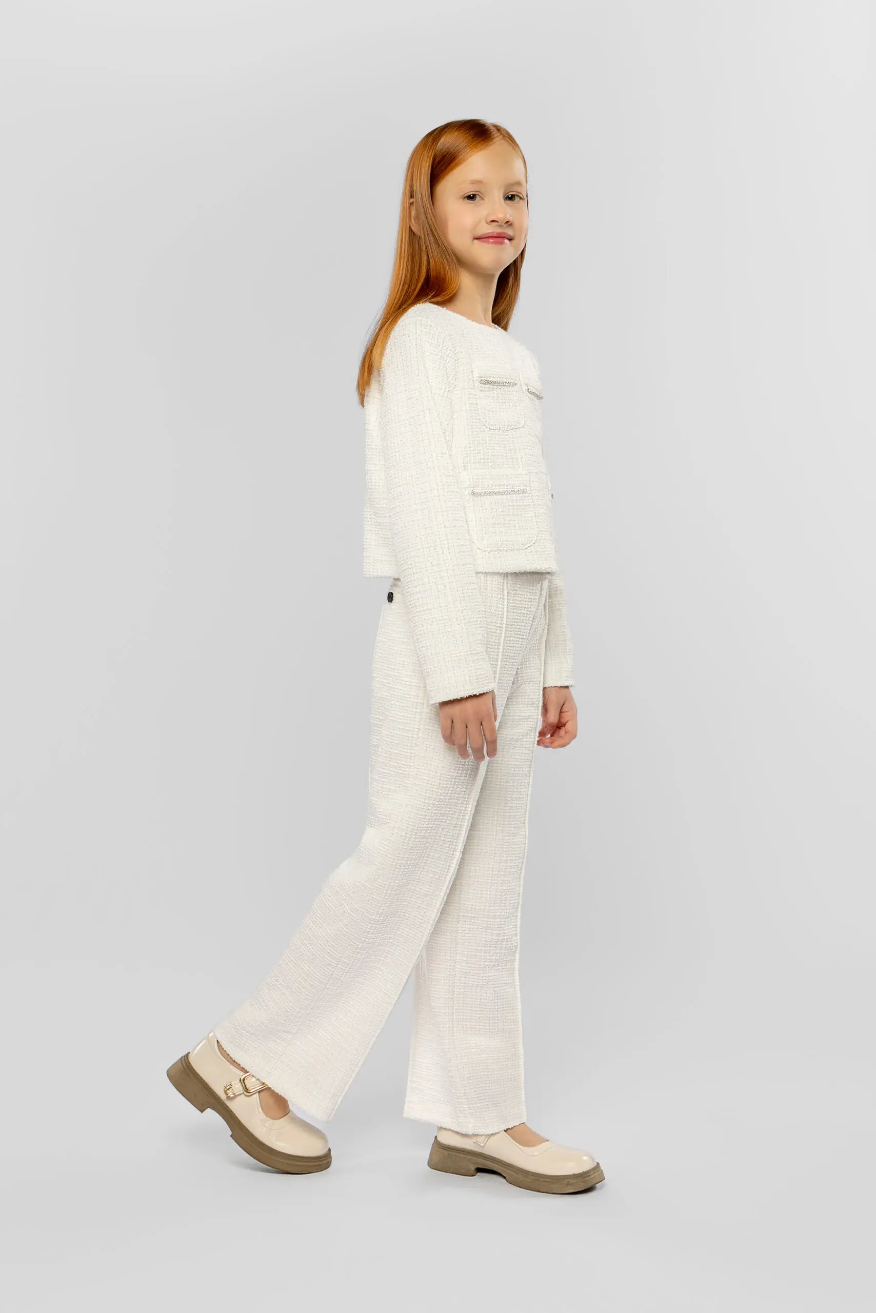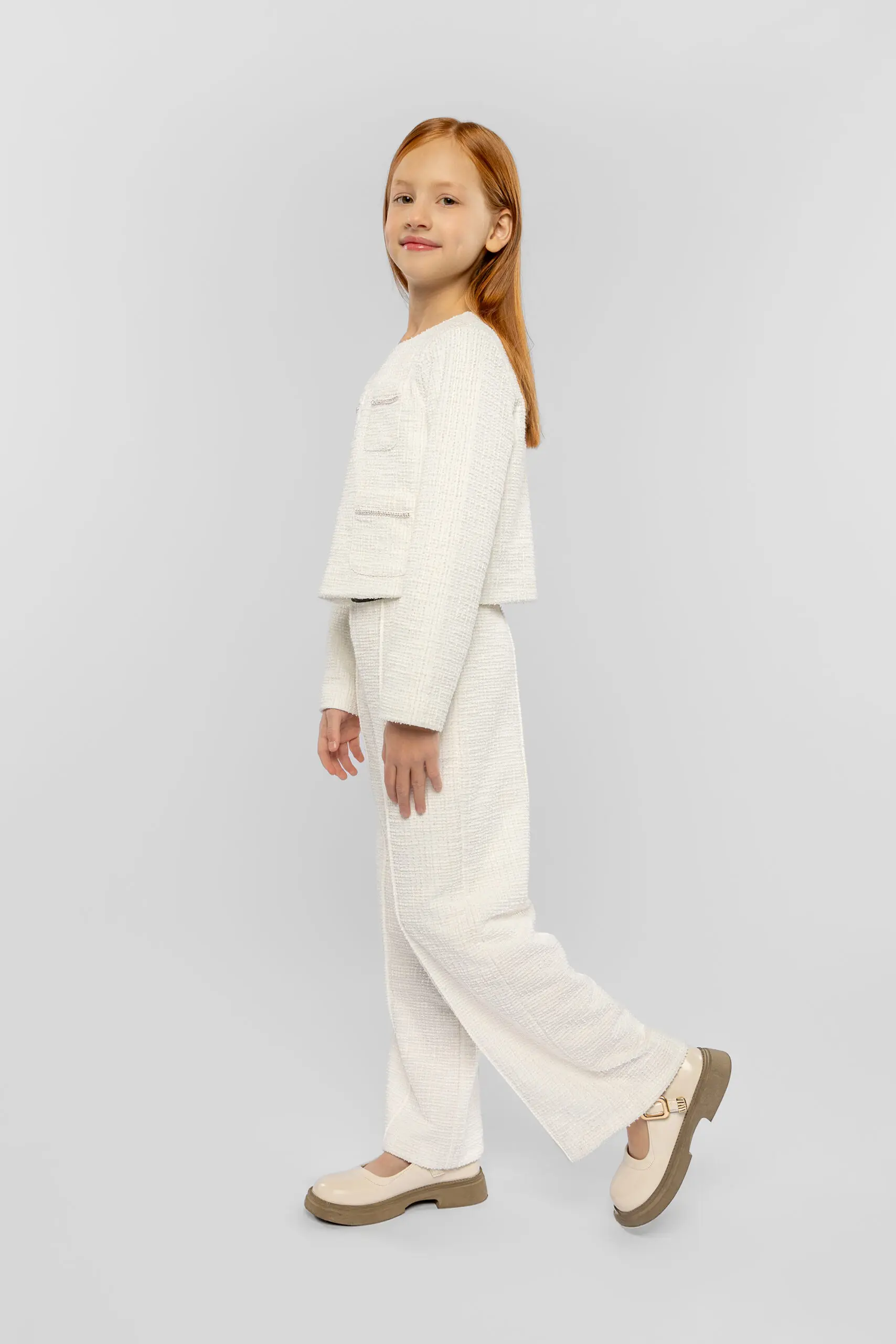 Нарядный жакет для девочек в теплом белом оттенке не только подчеркнет индивидуальность , но и станет универсальным элементом гардероба. Свободный крой модели смотрится стильно и очень ... элегантно. Особым акцентом становятся стильные карманы-обманки, декорированные изящной золотистой цепочкой. Сзади застежка на молнию по всей длине. Такой жакет легко сочетать с различными нарядами, а в комплекте с брюками из этой же коллекции составит единый ансамбль.