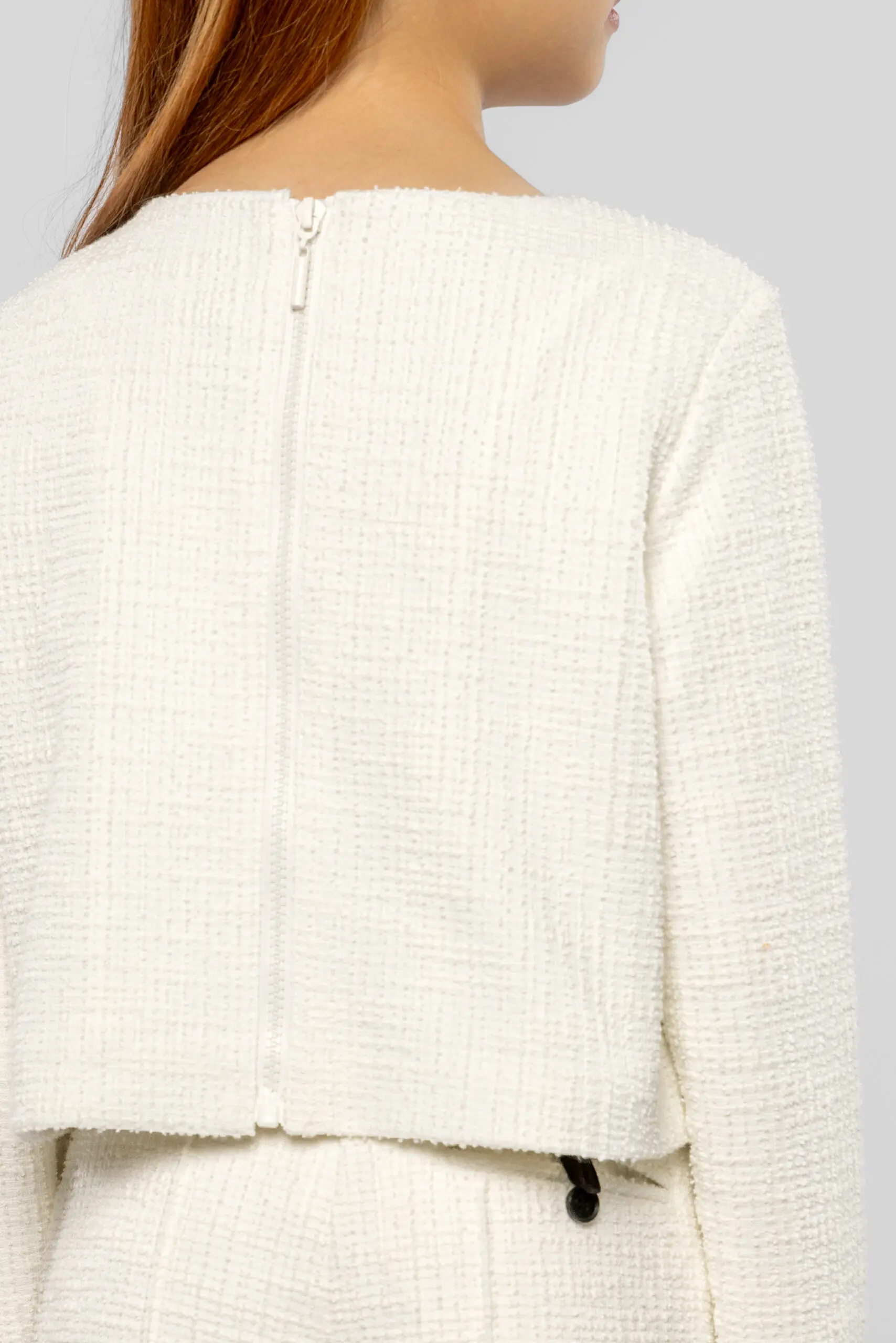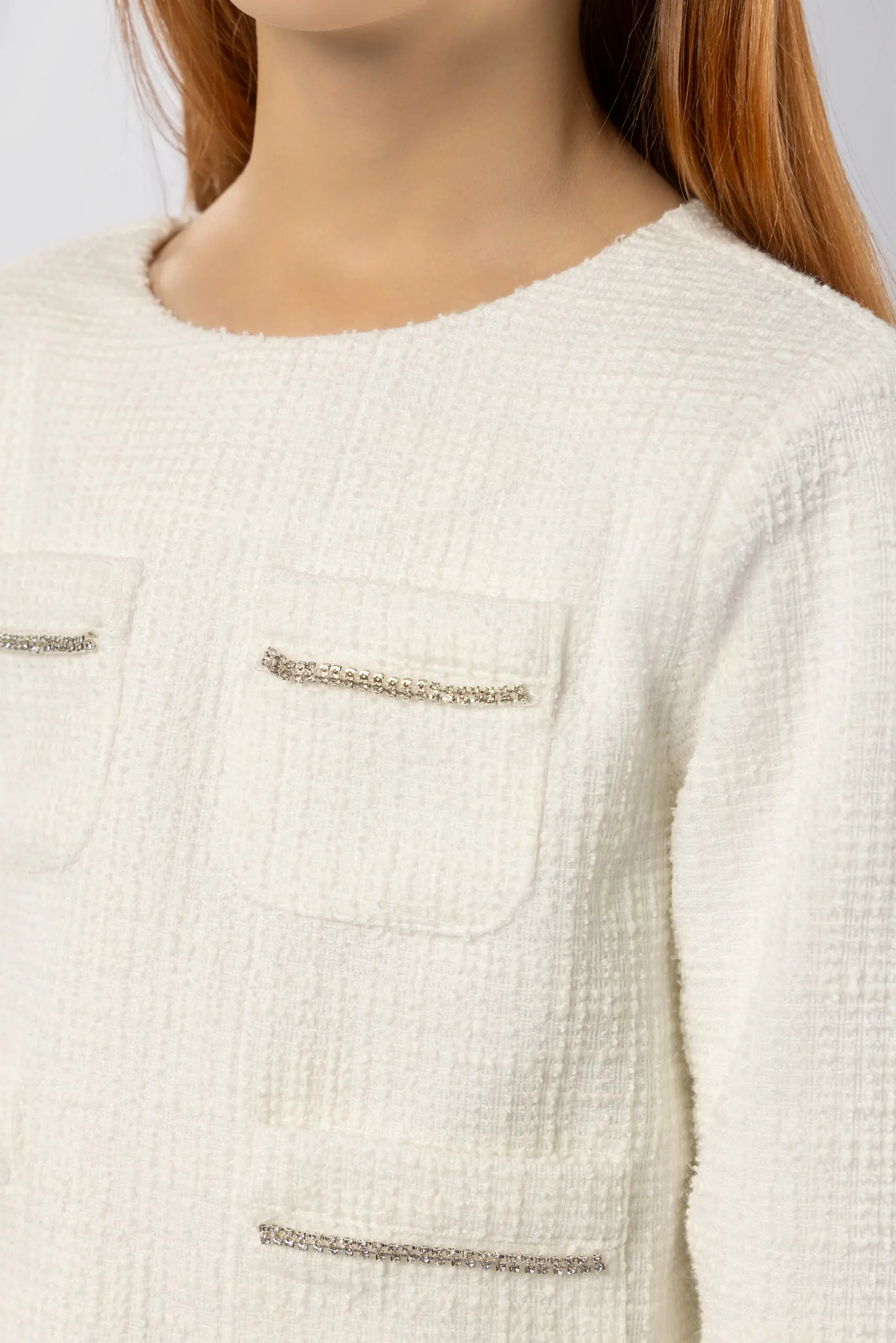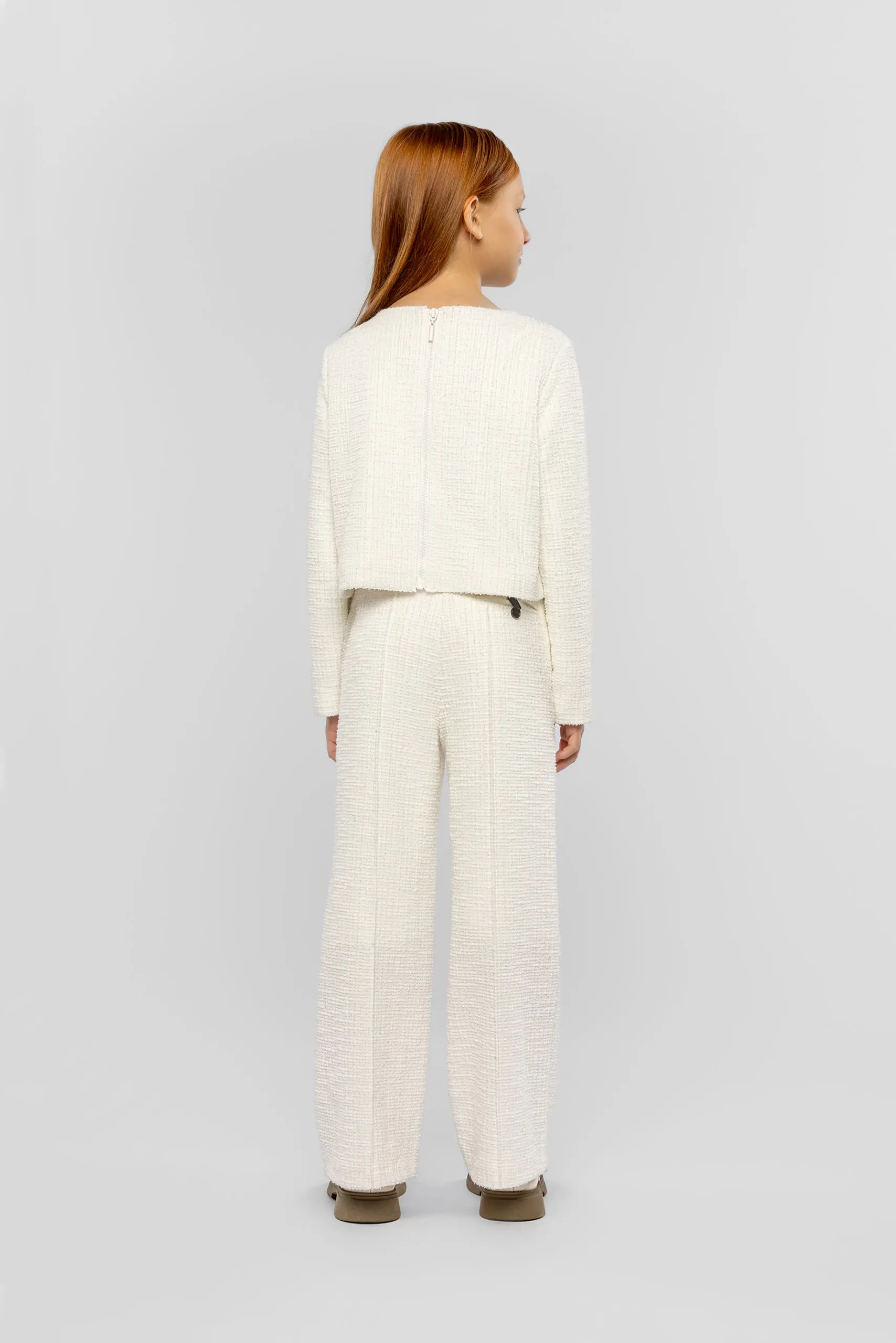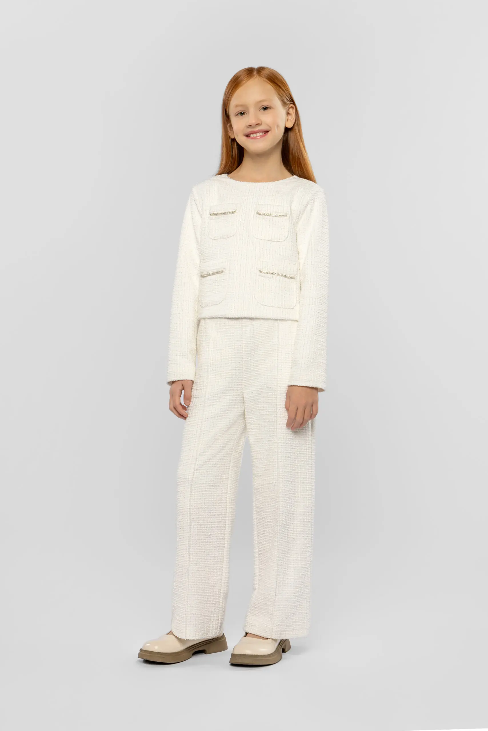 Нарядный жакет для девочек в теплом белом оттенке не только подчеркнет индивидуальность , но и станет универсальным элементом гардероба. Свободный крой модели смотрится стильно и очень ... элегантно. Особым акцентом становятся стильные карманы-обманки, декорированные изящной золотистой цепочкой. Сзади застежка на молнию по всей длине. Такой жакет легко сочетать с различными нарядами, а в комплекте с брюками из этой же коллекции составит единый ансамбль.