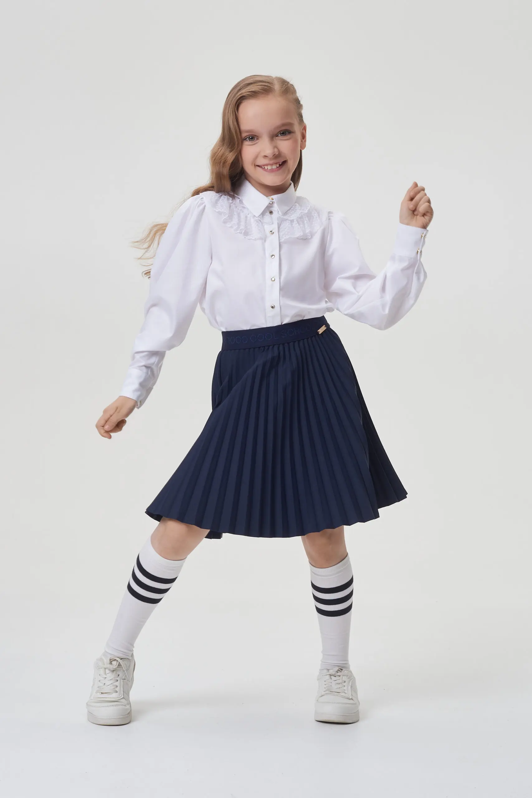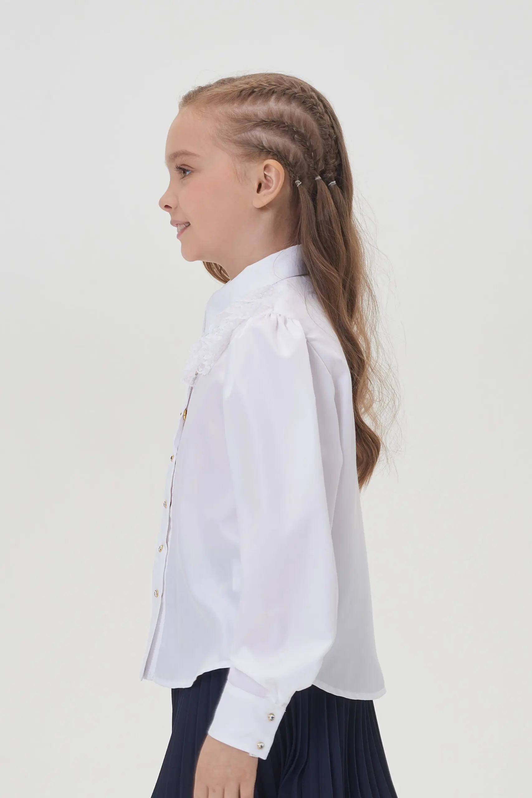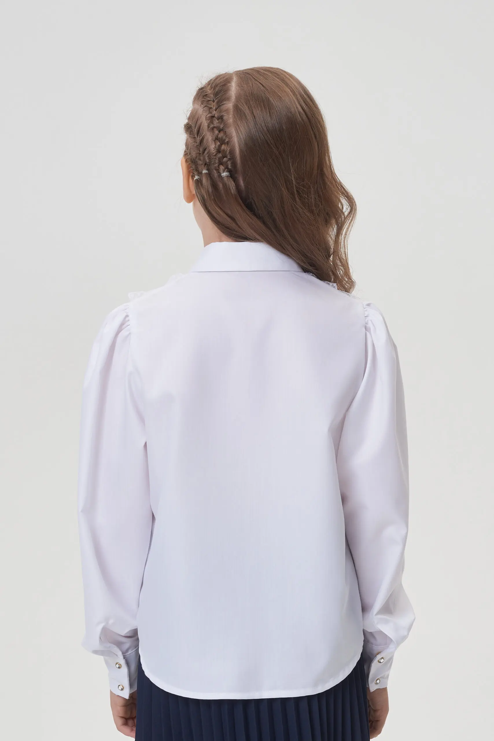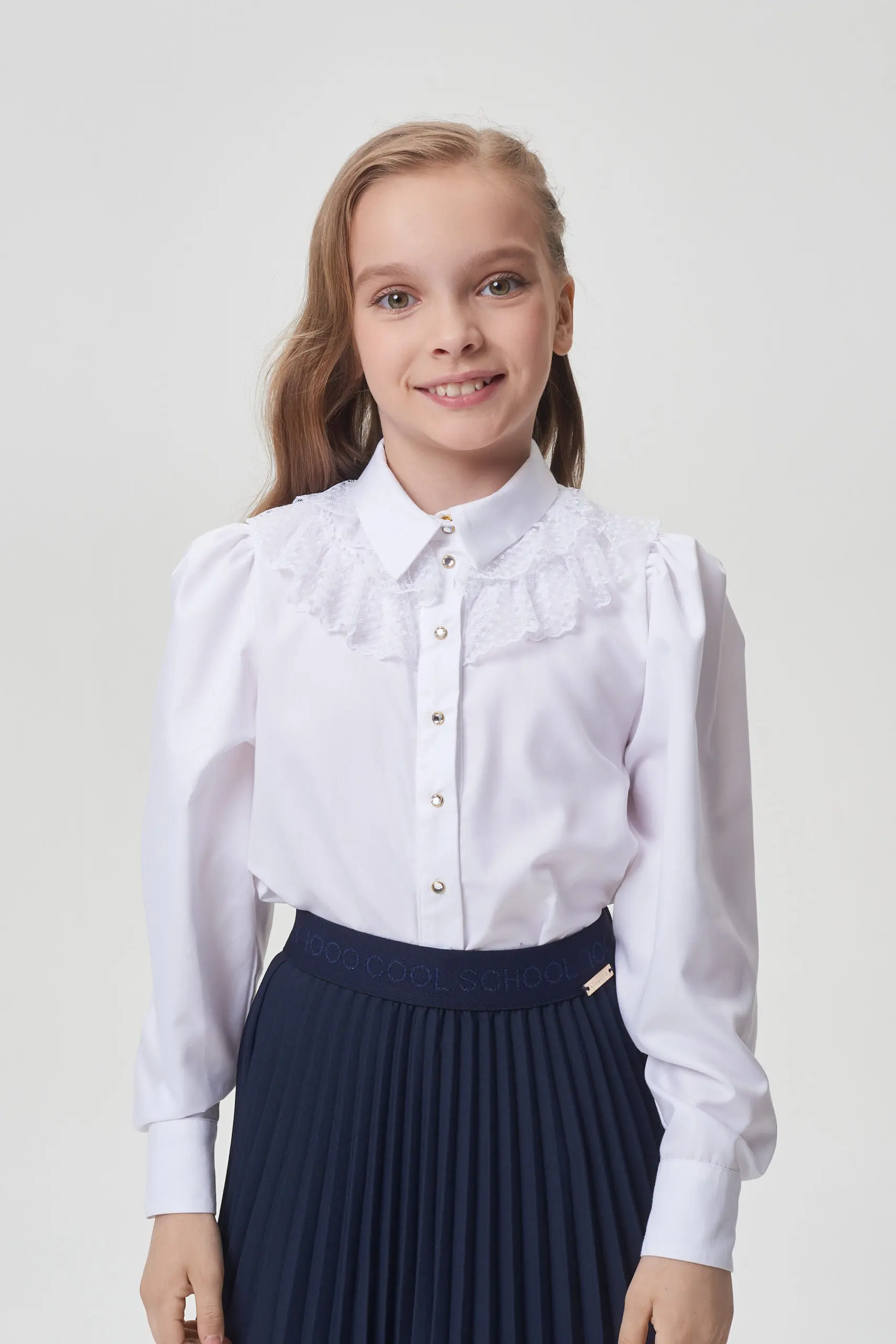 Элегантная блузка для школы станет прекрасным дополнением как к будничному школьному образу, так и к праздничному наряду. Свободный крой модели не сковывает движений, позволяя девочке чувствовать ... себя комфортно на протяжении дня. Длинные рукава с манжетами на пуговицах предоставляют возможность регулировки и добавляют образу изысканности. Застежка спереди на оригинальных пуговицах акцентирует внимание и создает цельный образ. Округлый нижний край блузки – это не только стильный элемент дизайна, но и практичное решение. Блузку можно носить как навыпуск, так и заправленной в юбку или брюки. Особую привлекательность модели придает кружевной декор. Эта универсальная блузка легко сочетается с любыми элементами школьной формы.
