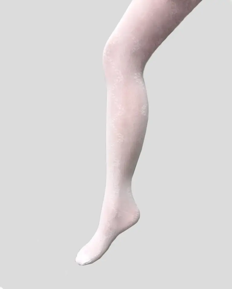 Белые колготки для девочек ростом от 122 до 152 см. По всей длине идет оригинальный орнамент. Выполнены из мягкого материала плотностью 40 ден. Комфортны в носке. ... Аккуратно садятся по ноге, не сползают. Такие колготки незаменимы для праздничного наряда на 1 сентября. Прекрасно подойдут и для повседневного гардероба. Нарядная и удобная модель понравится каждой девочке.