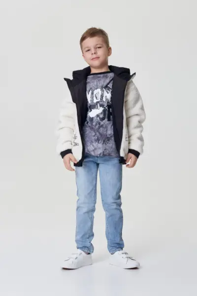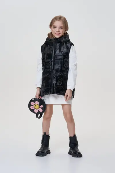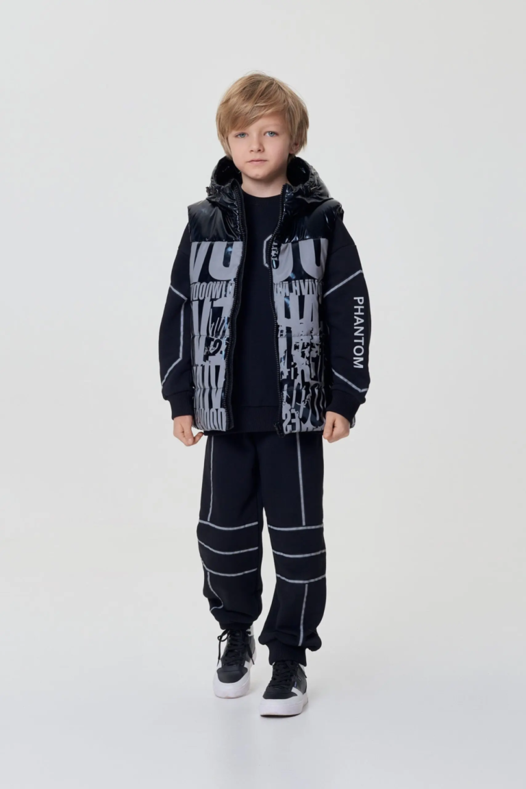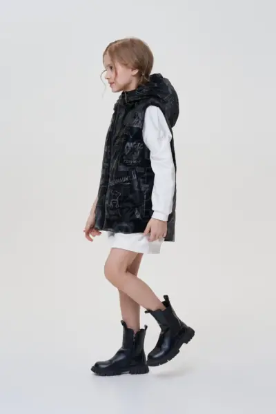 Ультрамодный жилет для мальчика. Оригинальная модель выполнена из водонепроницаемой ткани «металлик» со светоотражающим эффектом. Легкий и тёплый наряд с капюшоном и застежкой-молнией украшен дизайнерским текстовым принтом. ... Такая вещь − простая в уходе, идеальный вариант для повседневного лука подростка. Можно создавать стильные образы со спортивными брюками, джинсами, толстовками и худи.