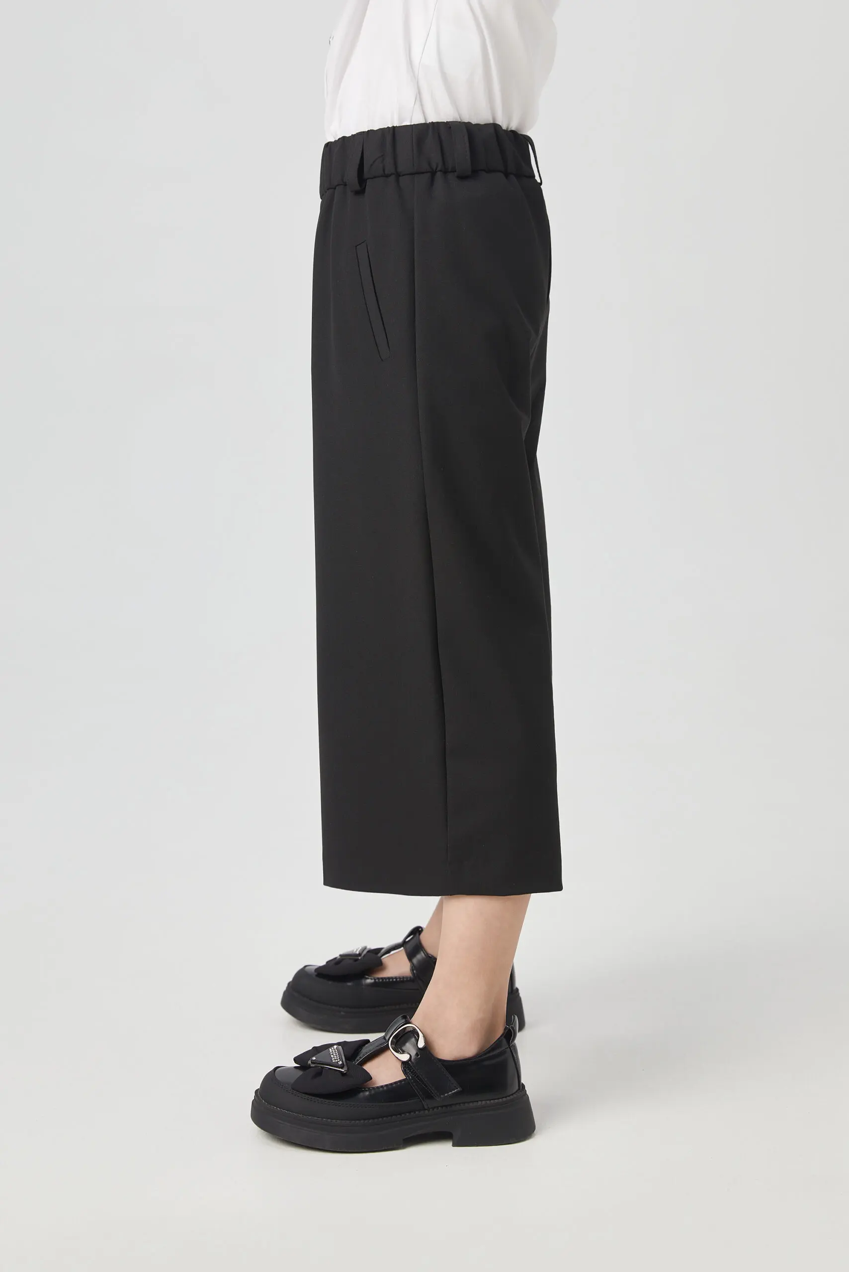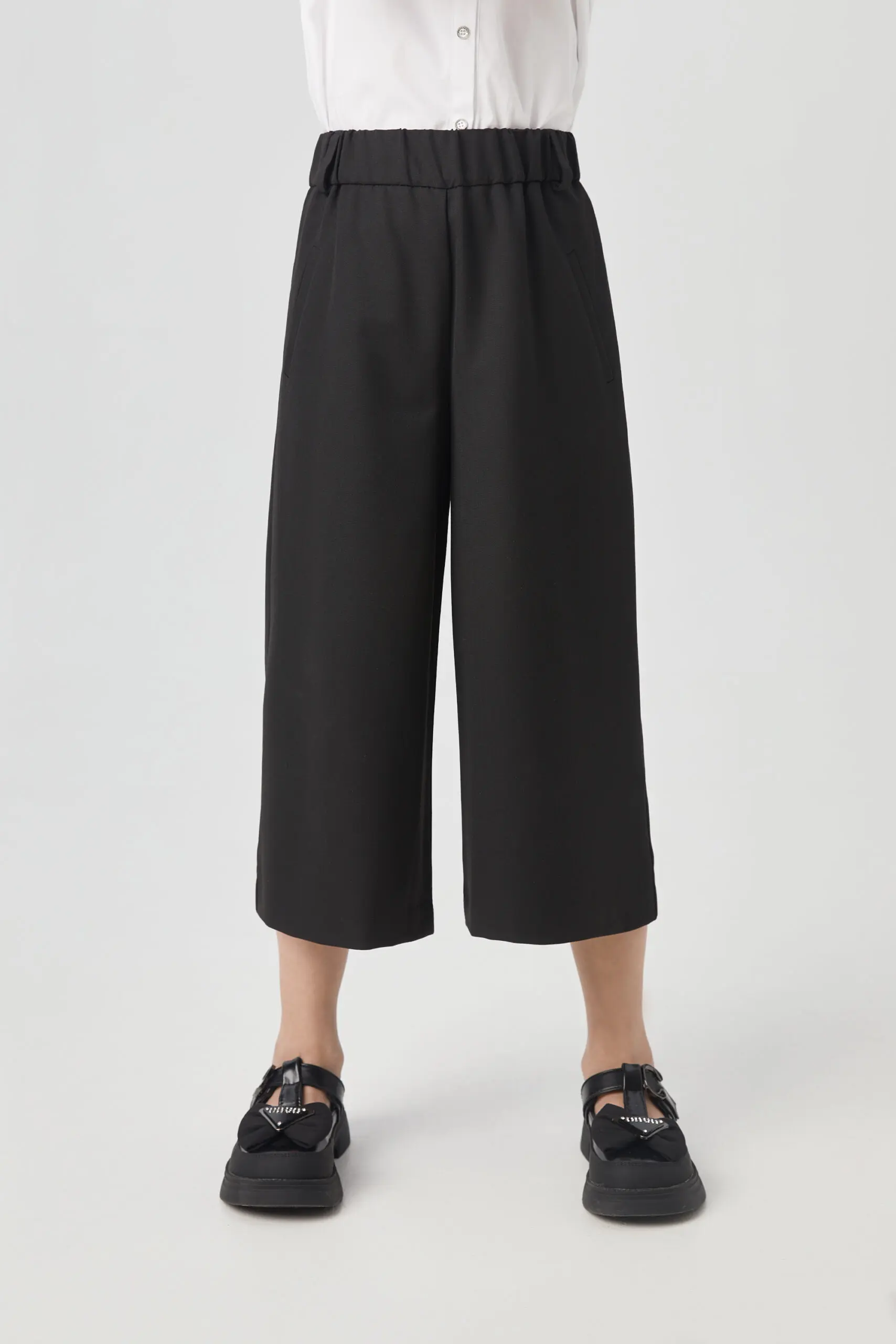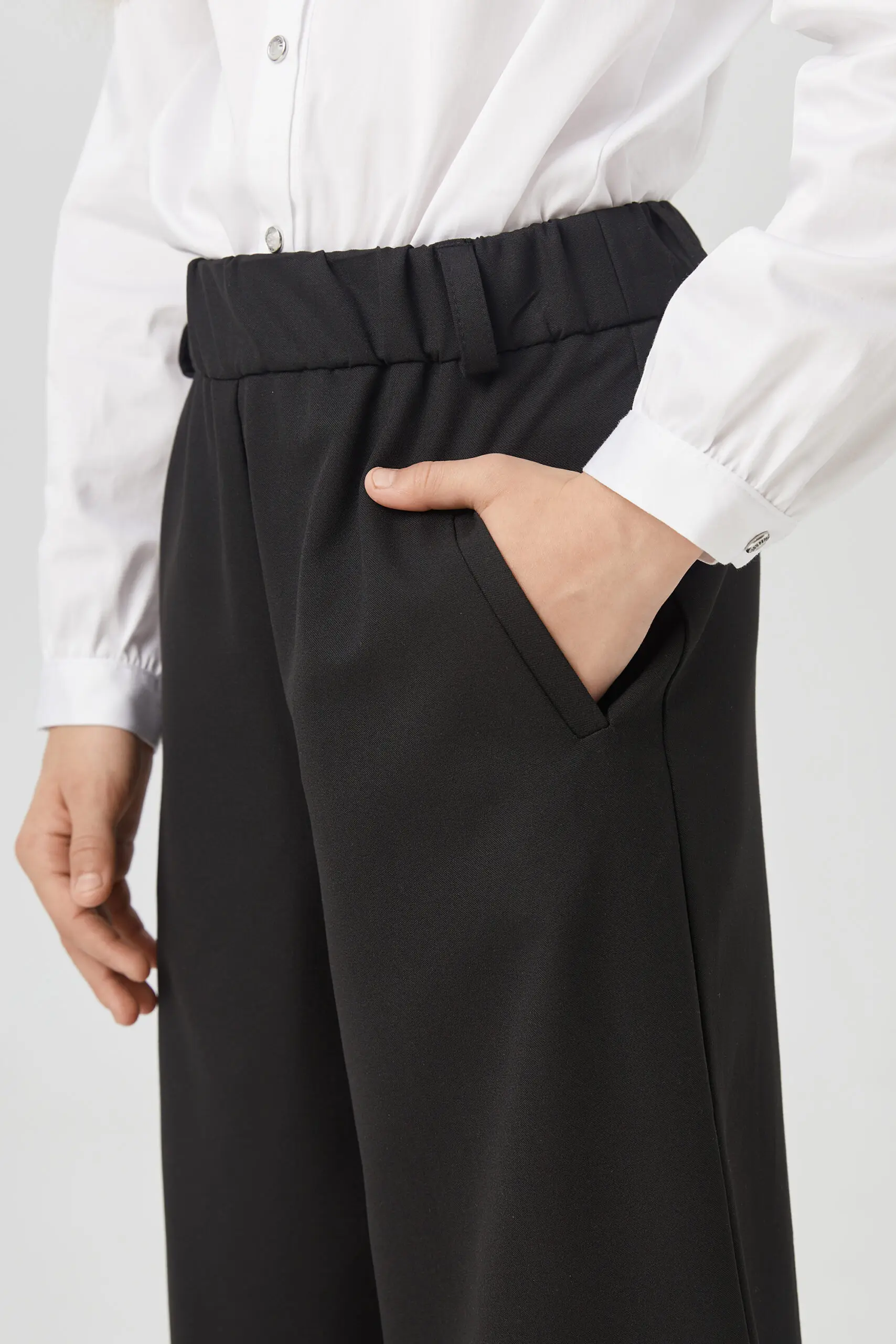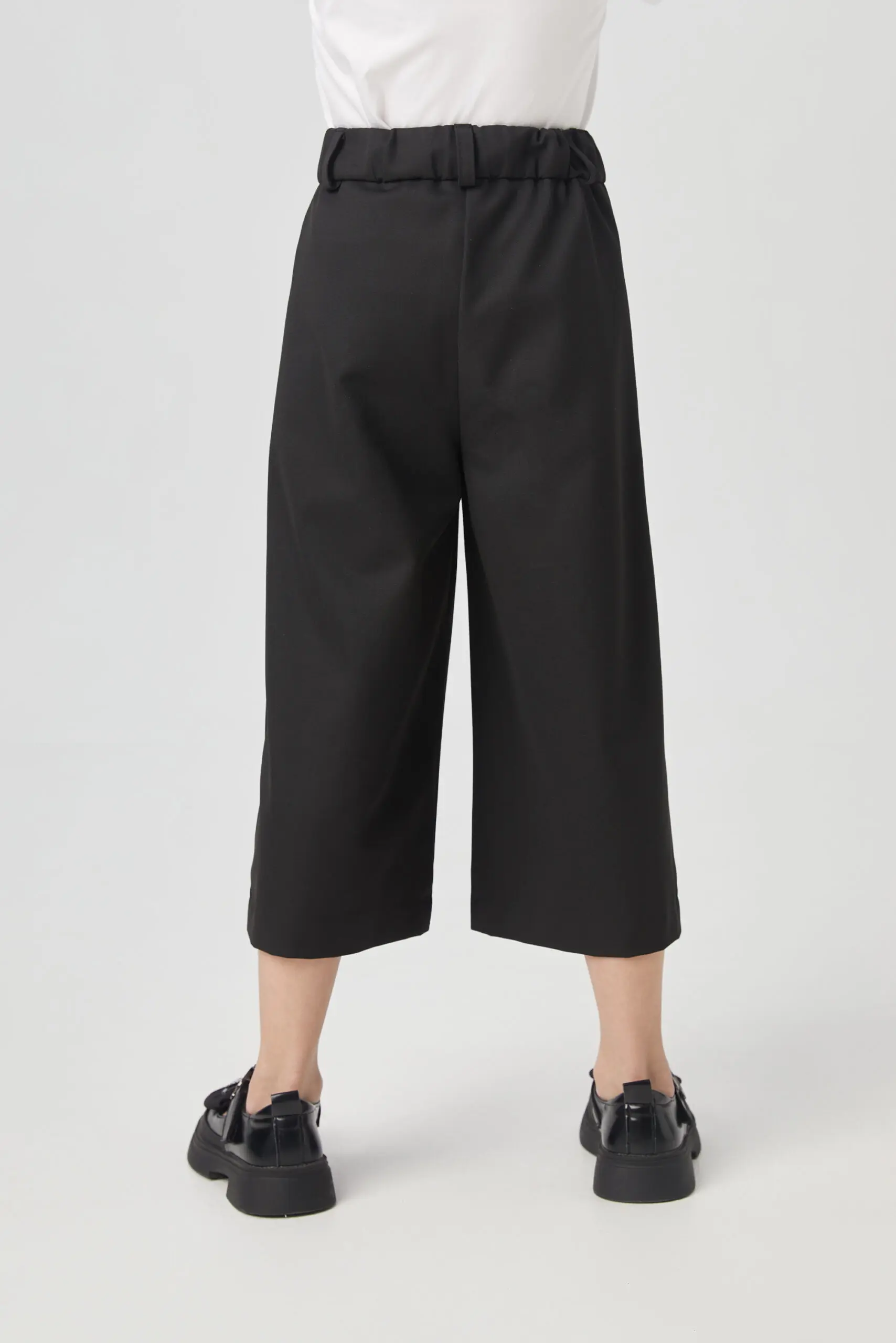 Черные кюлоты из костюмной ткани – отличное решение для школьного гардероба, подходящее как для торжественных мероприятий, так и для будней. Благодаря своей износостойкости и прочности, материал ... прост в уходе и почти не мнется. Боковые карманы и эластичный пояс с шлевками для ремня добавляют удобства. Подкладка из вискозы гарантирует приятные ощущения при контакте с кожей и комфорт в течение всего дня. Эти широкие укороченные брюки легко сочетаются с разной одеждой, а завышенная талия позволяет носить их с блузками или рубашками средней длины, заправленными внутрь
