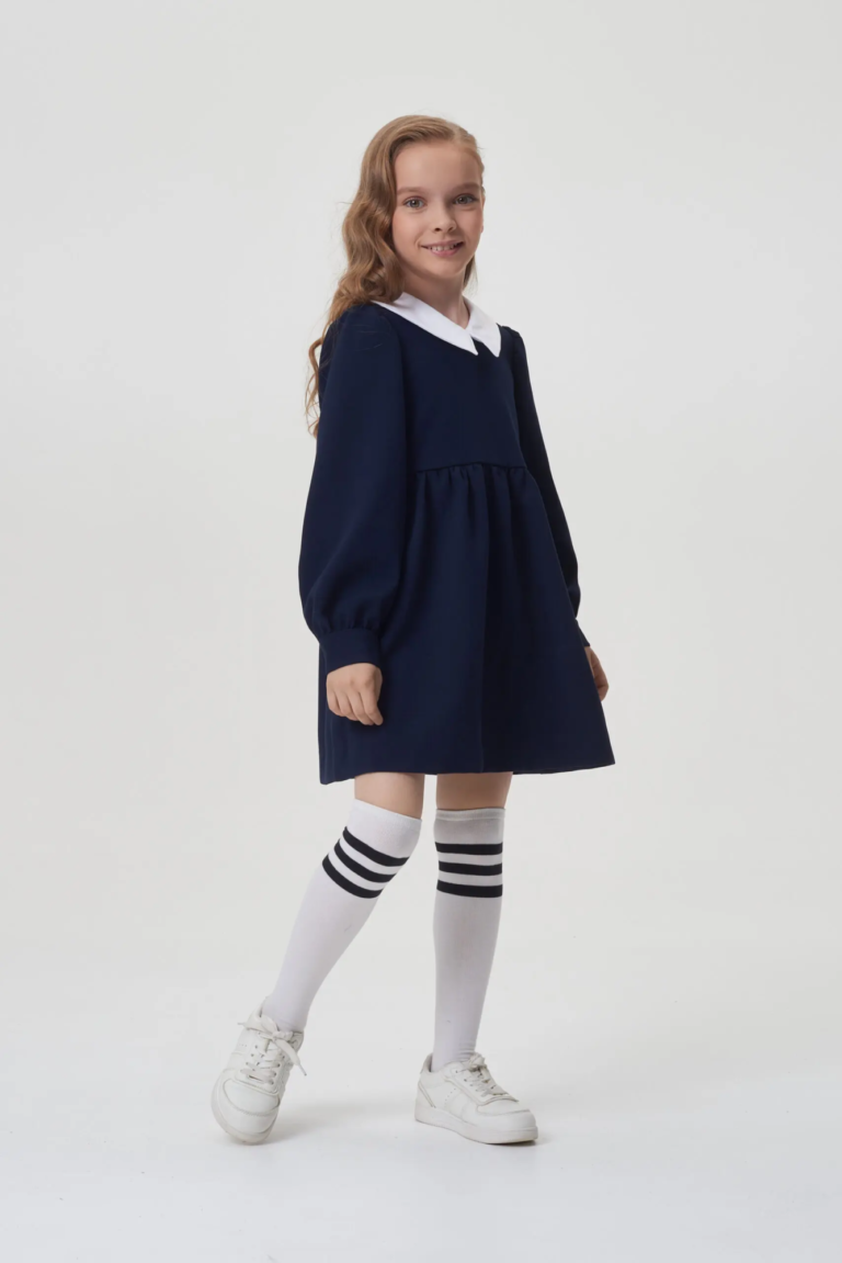 Школьное платье из костюмной ткани синего цвета для девочки.