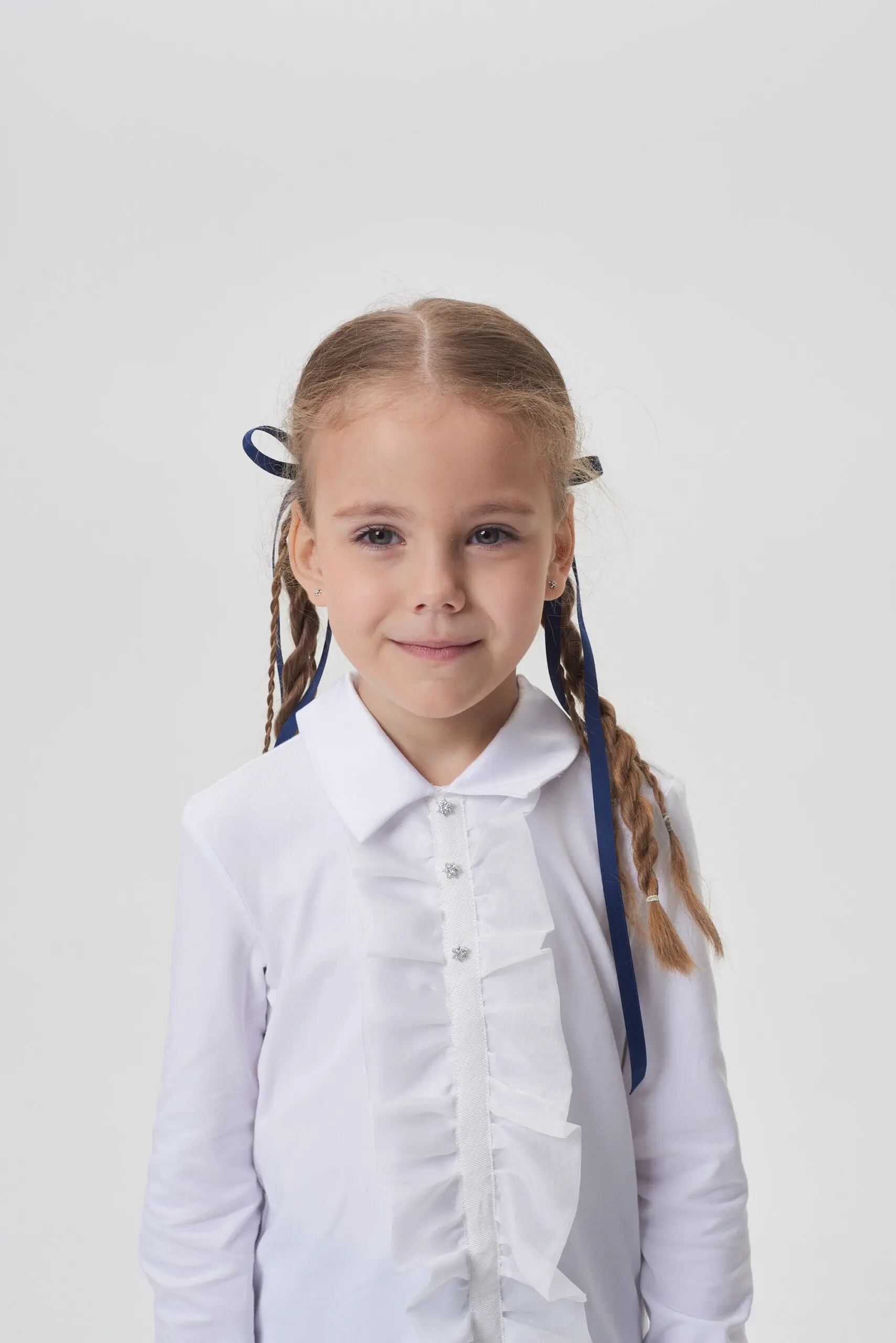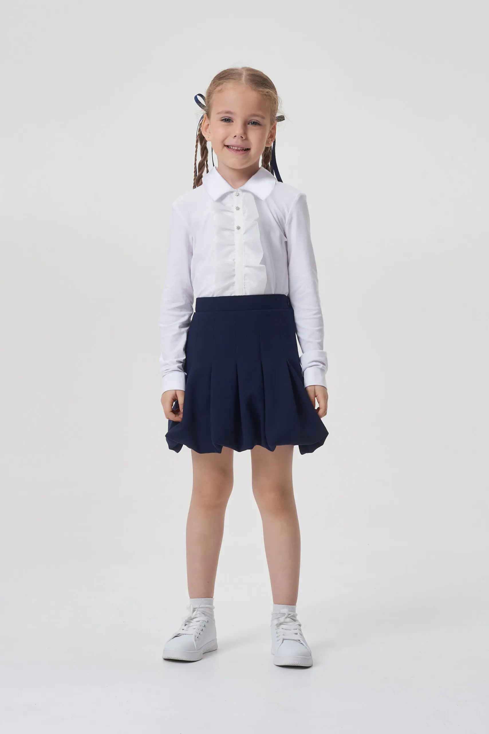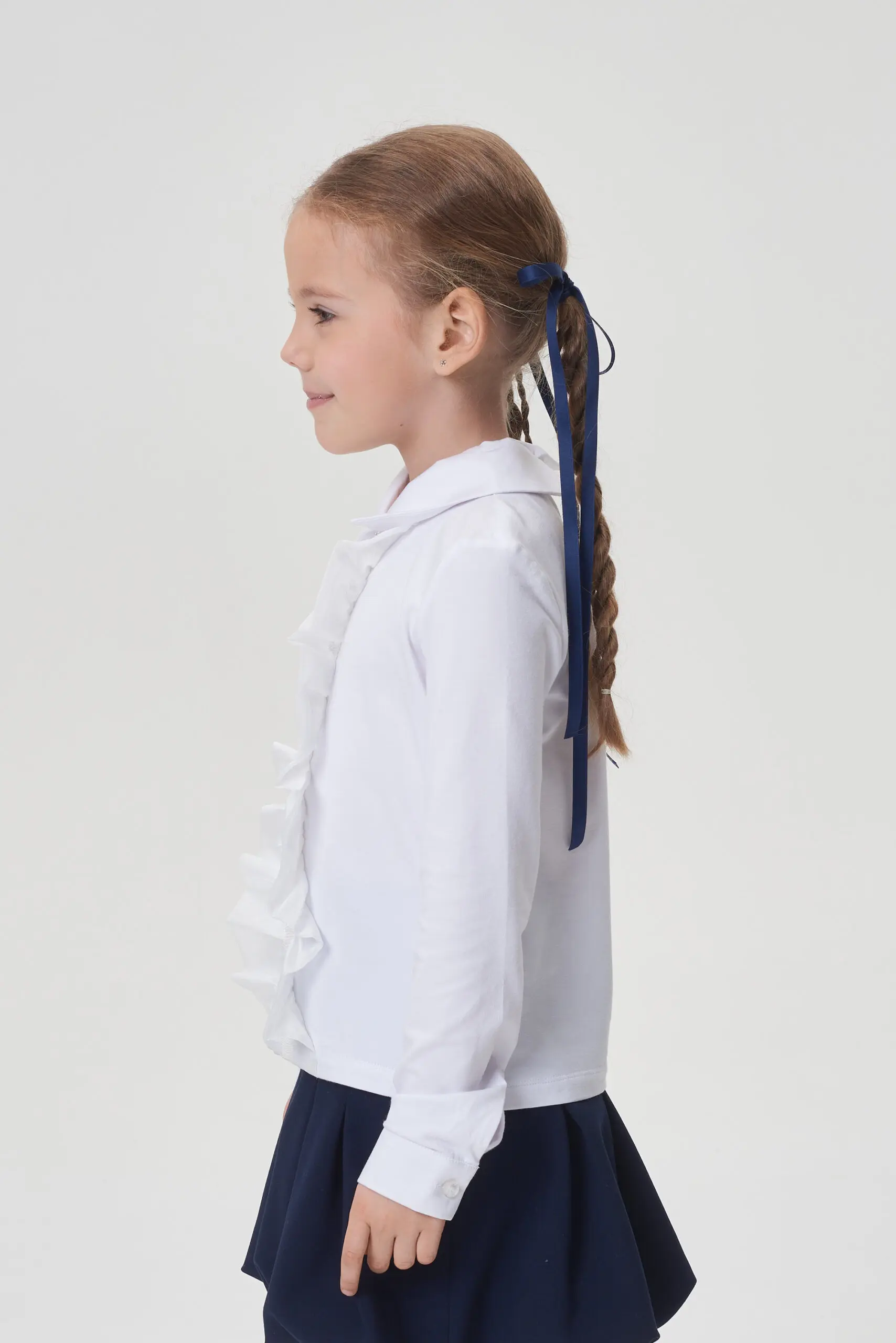 Нарядная блузка для школы – отличный выбор как для будней, так и для торжественных мероприятий. Подбирая одежду для нарядного лука школьницы рекомендуется учитывать наличие привлекательных деталей, ... таких как: красивая отделка, интересные рукава и другие выразительные элементы. Прелестная блуза с оборками выполнена из белоснежного хлопка. Застежка на оригинальные пуговицы привлекает внимание. В этой блузке девочка почувствует себя комфортно и уверенно на любом торжестве.