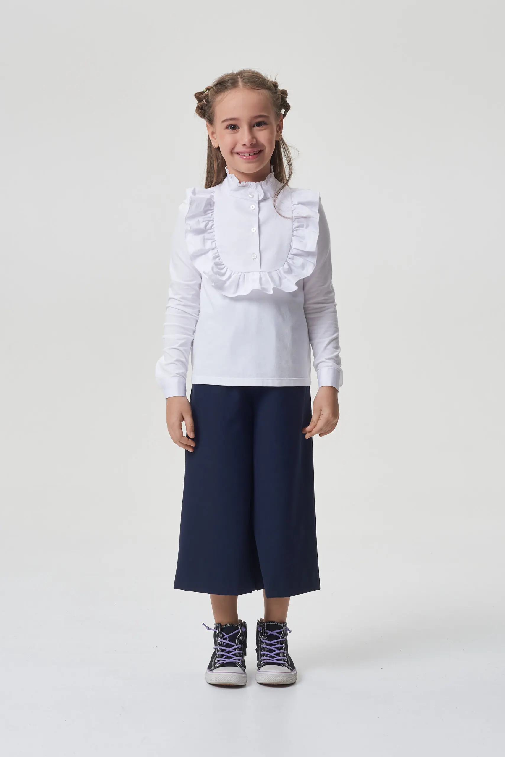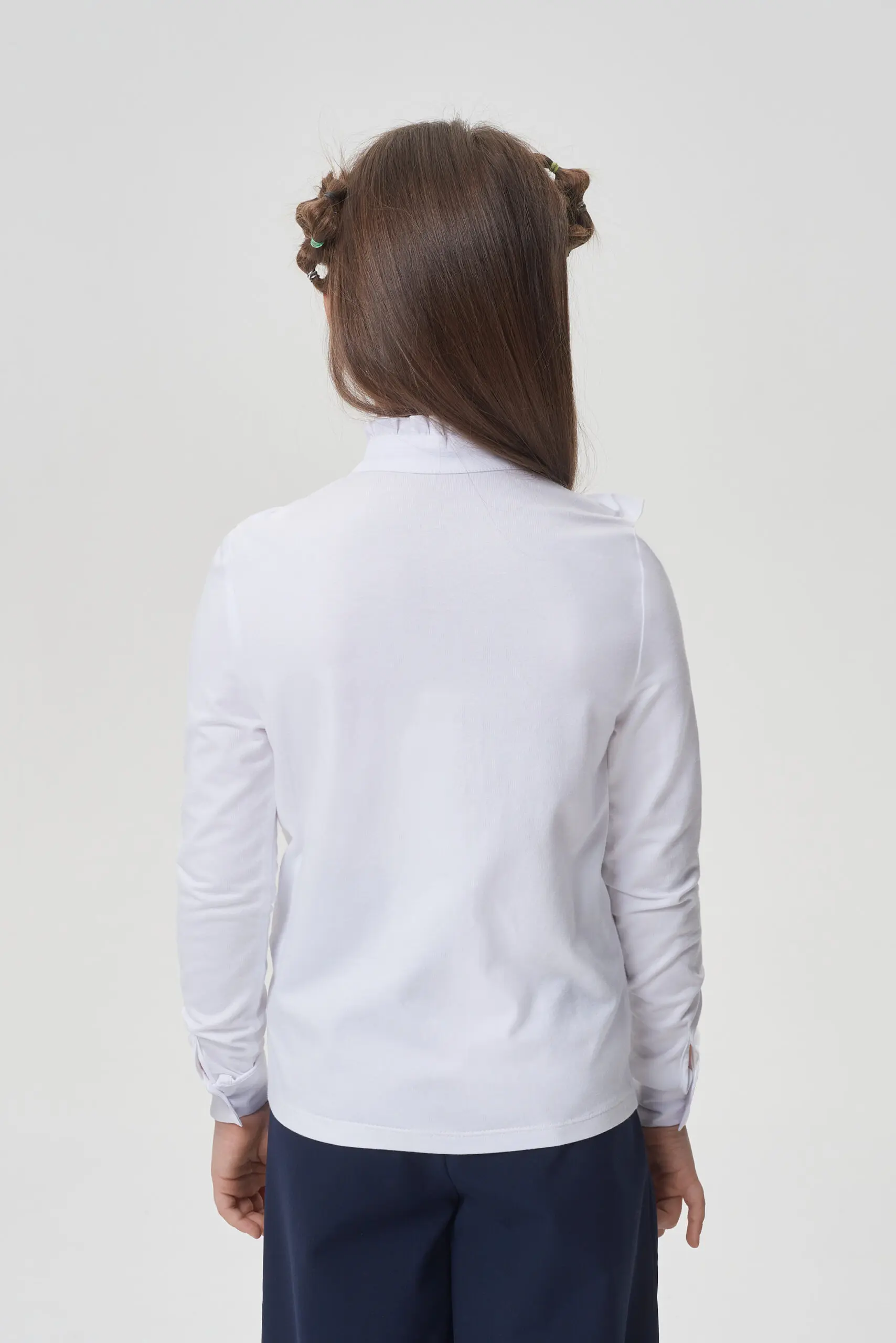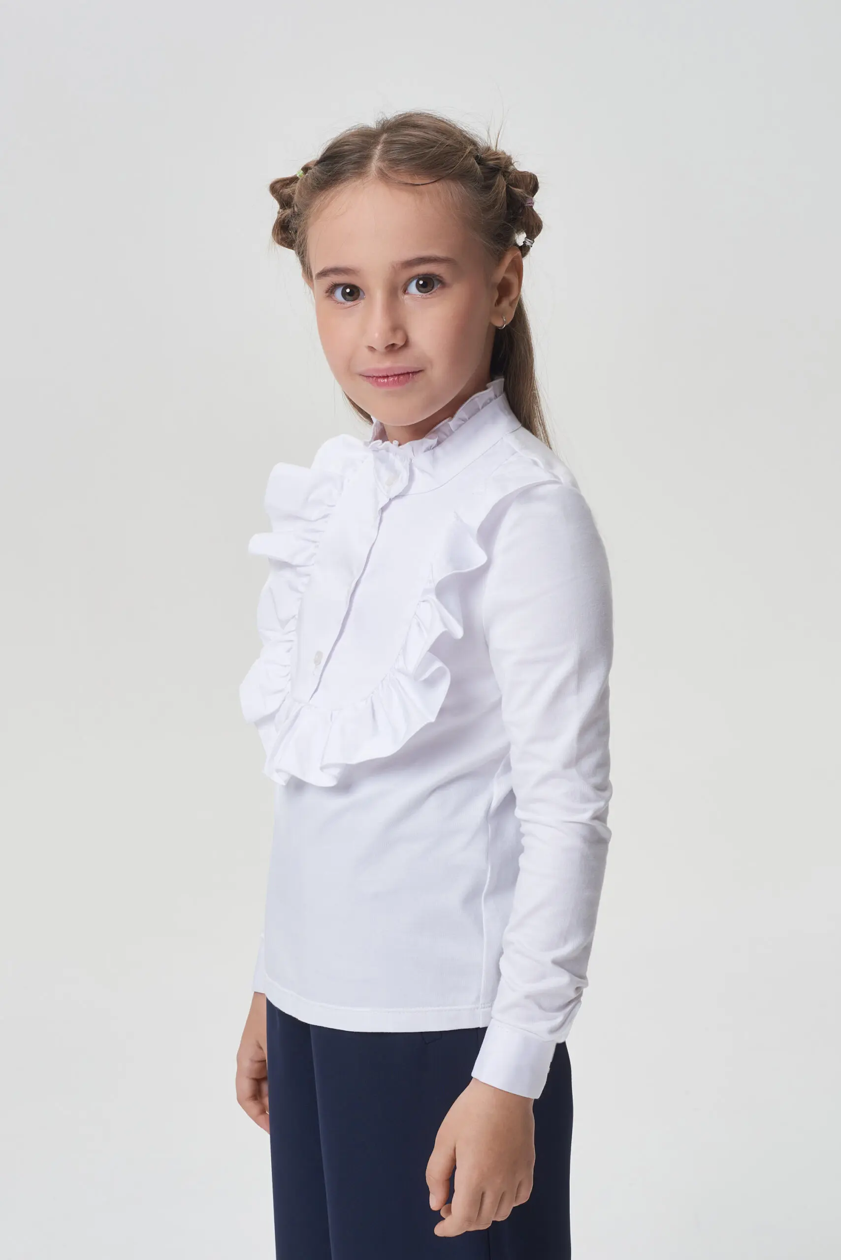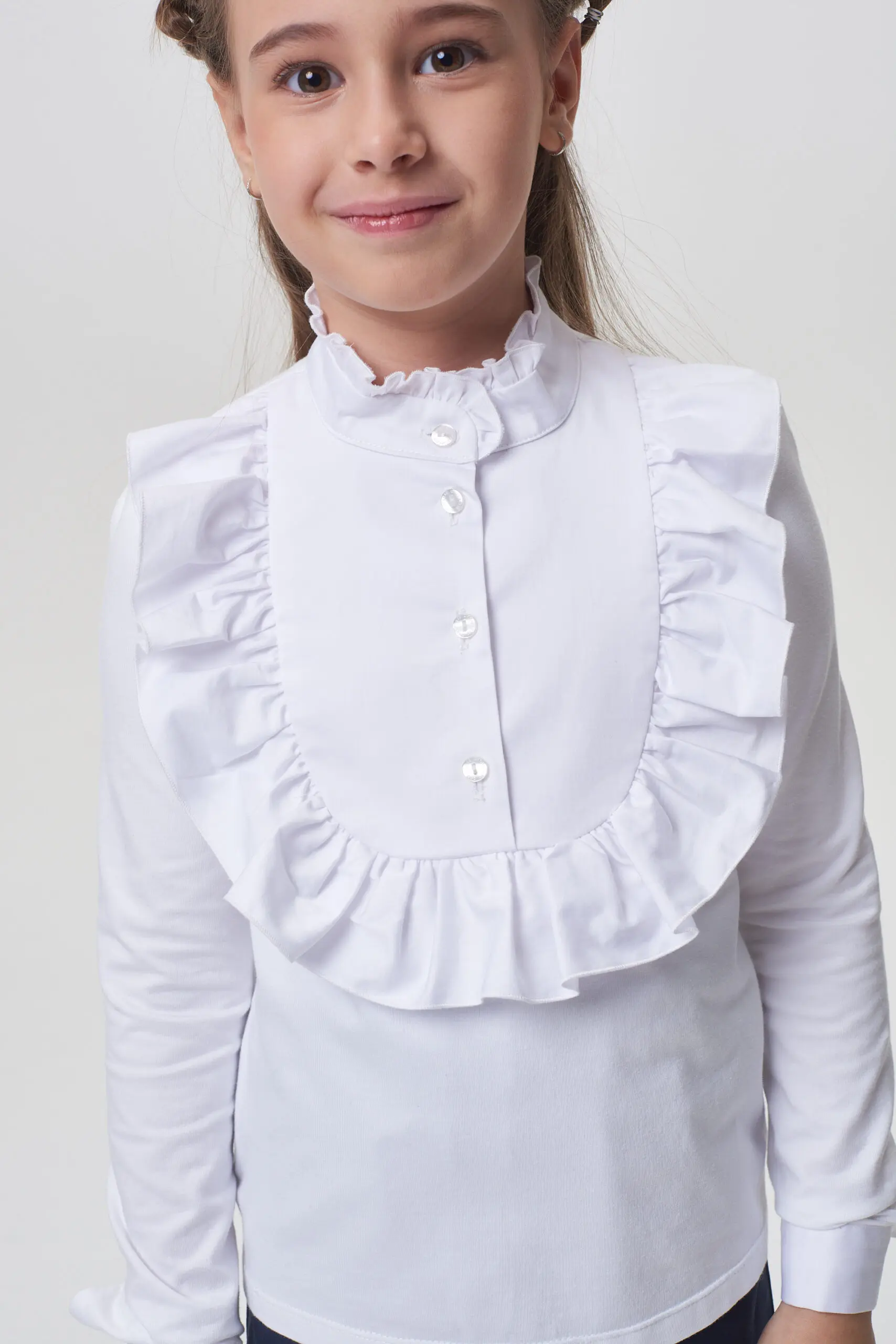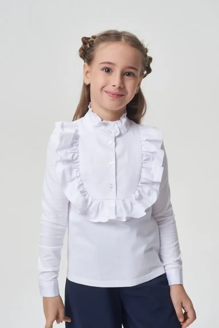 Блуза для девочки - практичный и удобный наряд для школы. Модель имеет полуприлегающий силуэт. Воротник-стойка украшен нежными рюшами. Украшающие переднюю часть оборки придают модели праздничный вид. ... Хлопковый материал высокого качества обеспечит удобство на протяжении всего учебного дня. Эта универсальная блузка легко сочетается с разнообразными элементами школьной формы.