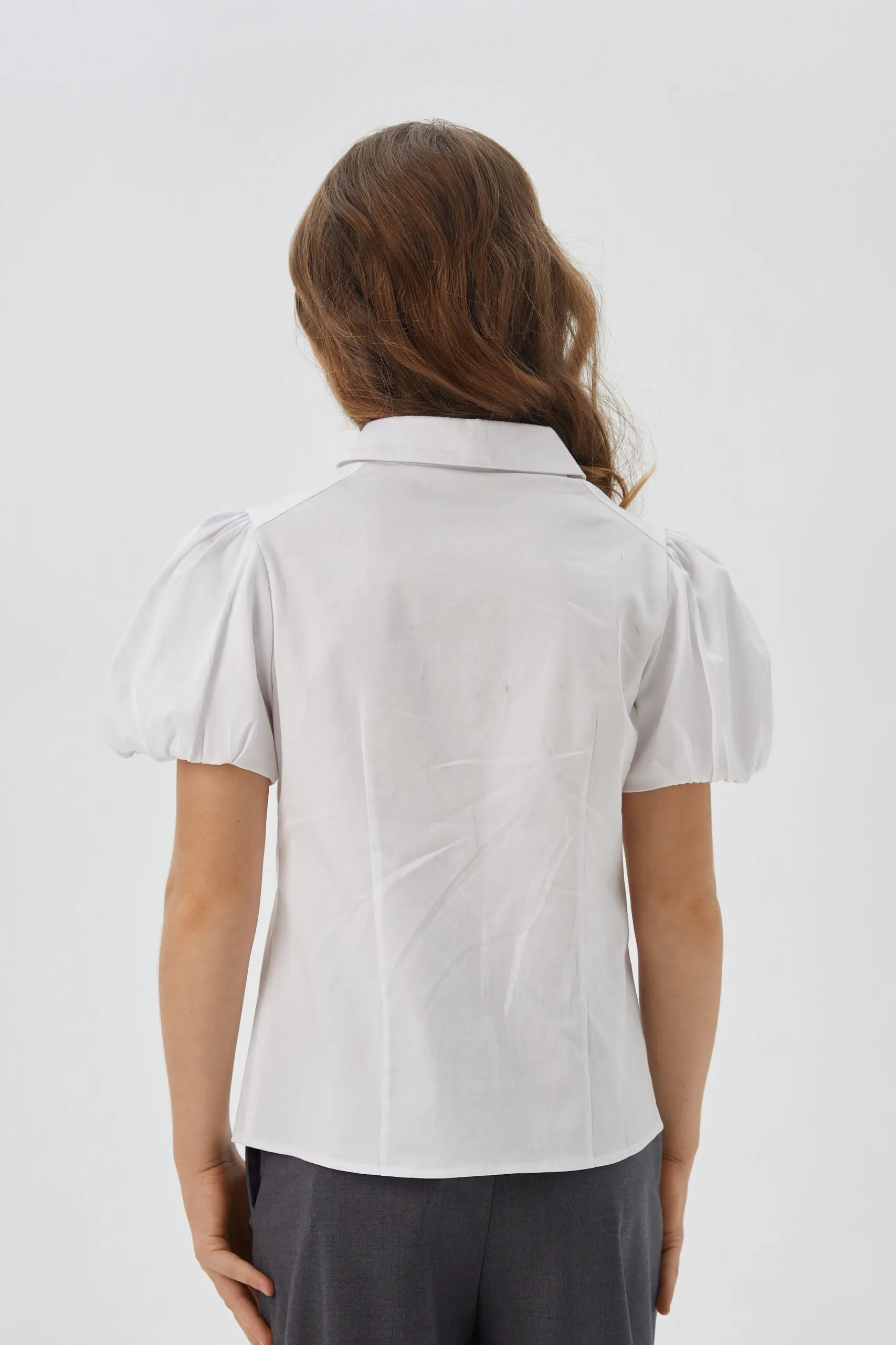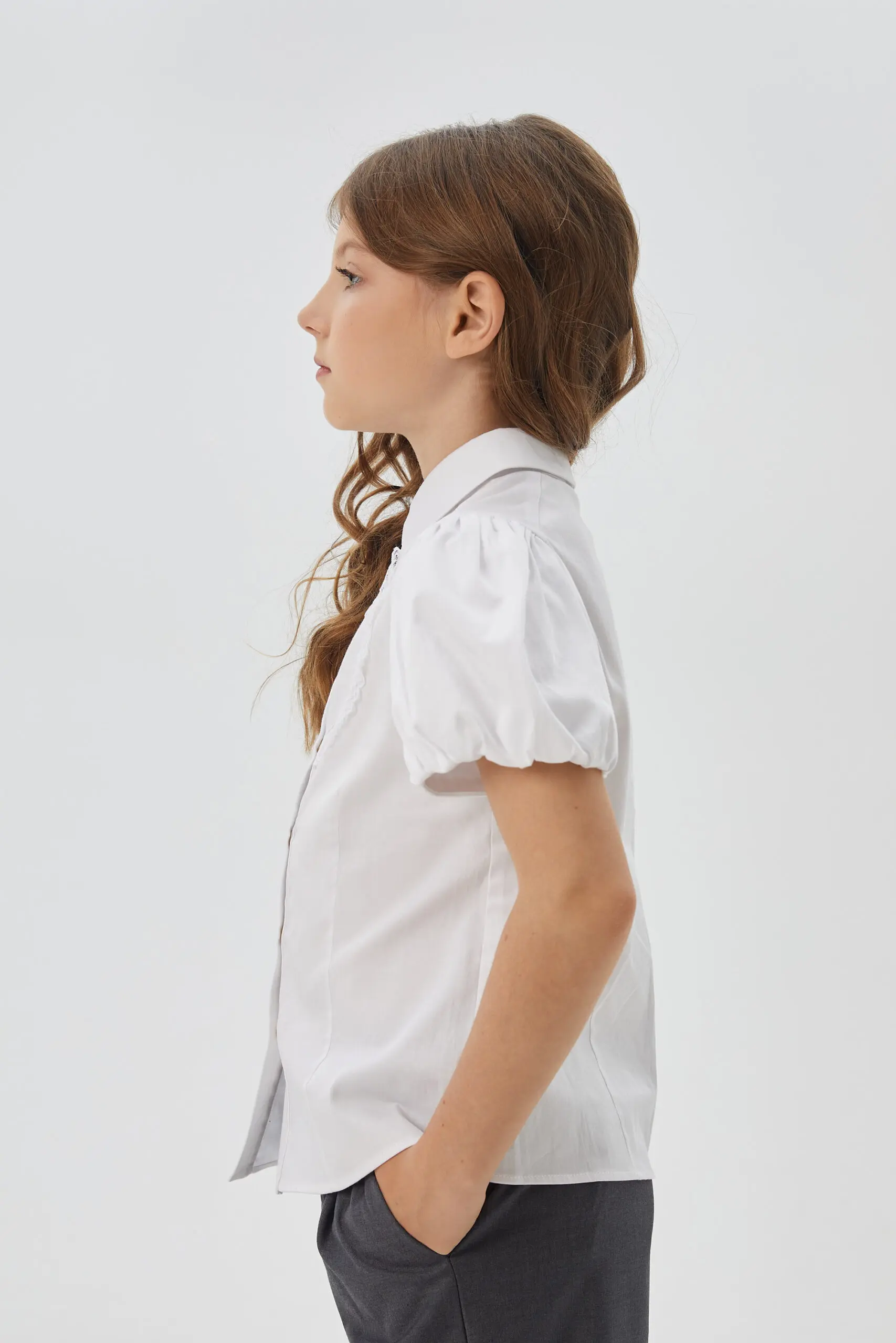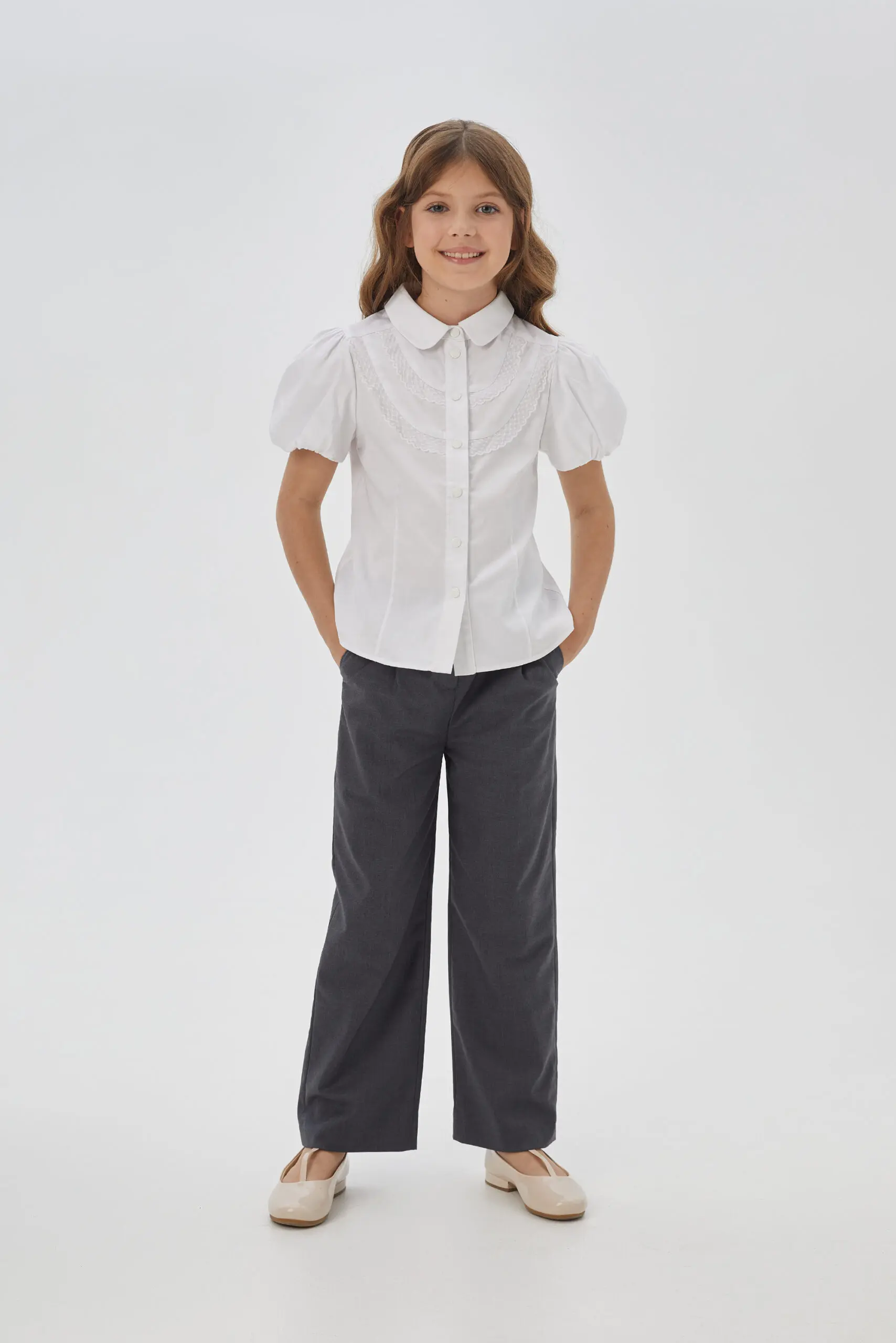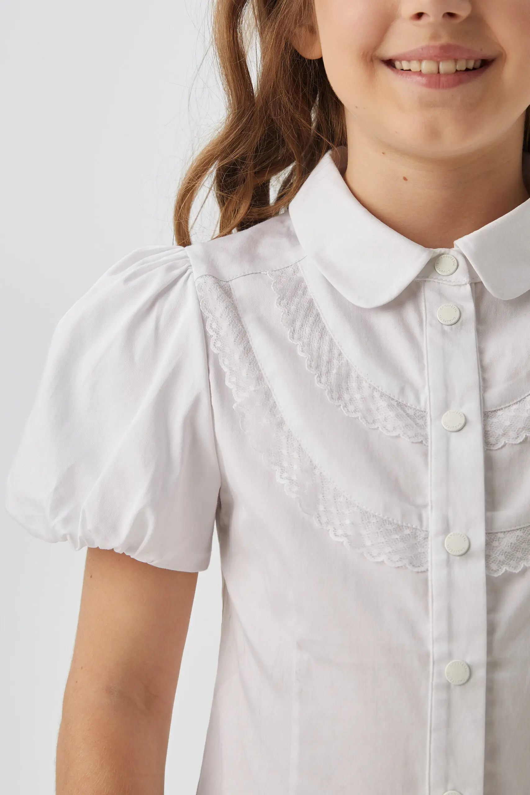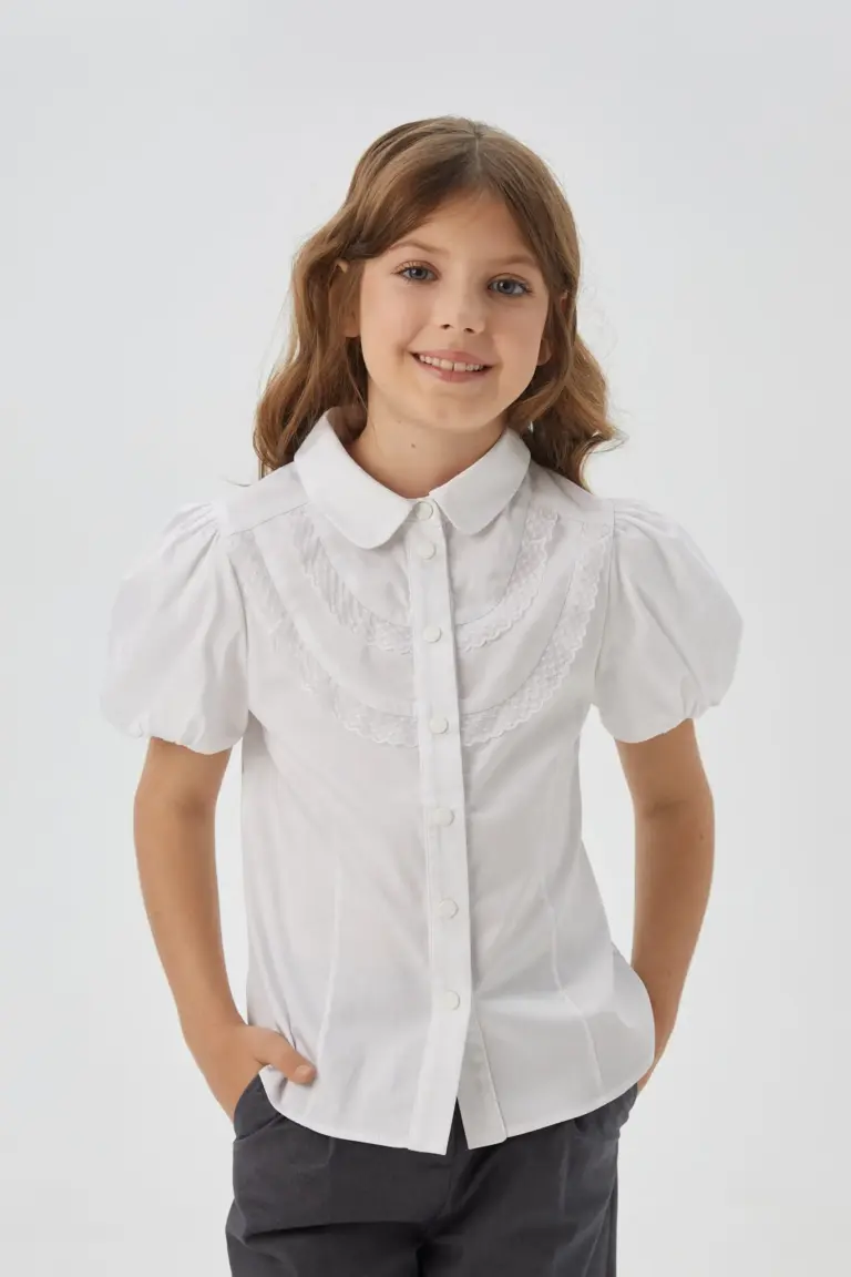 Белая блузка для девочки, с короткими рукавами-фонариками, станет прекрасным дополнением к школьному гардеробу. Данная модель имеет круглый отложной воротничок и украшена нежным кружевом. Застегивается на кнопки ... по всей длине, что делает ее удобной в использовании.