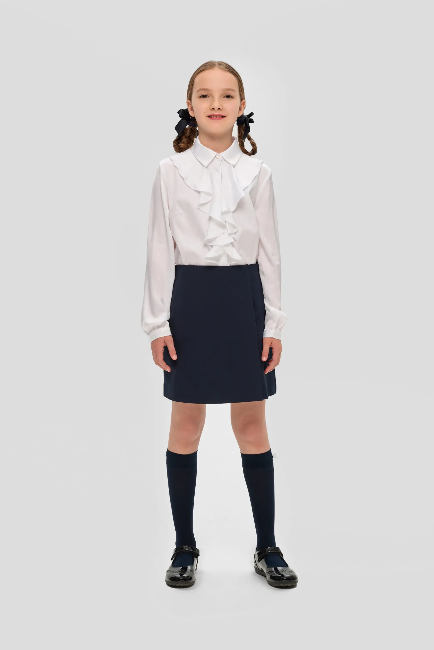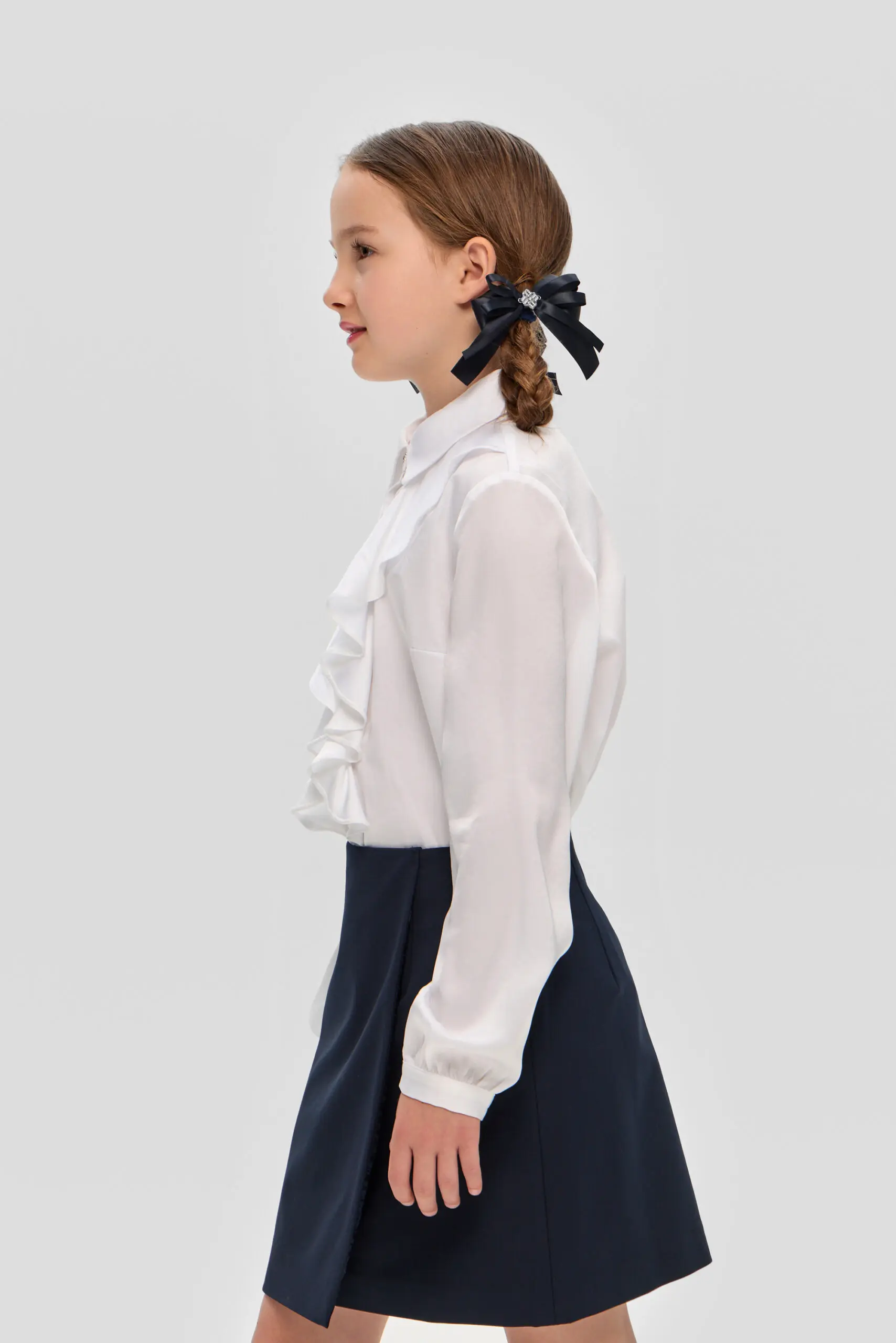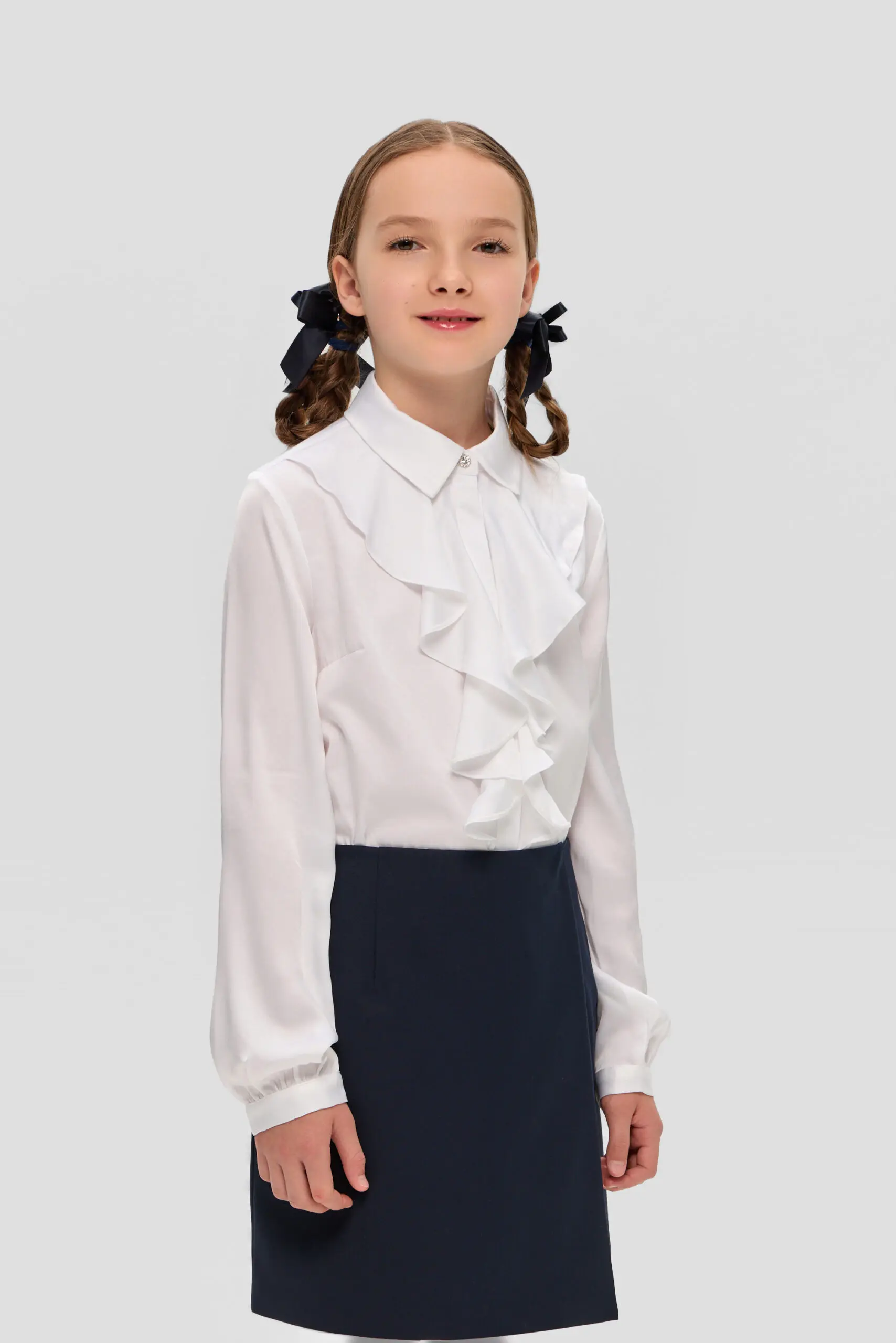 Нарядная школьная блузка для девочки. Свободный крой модели акцентирован объемным воланом. Классический отложной воротник фиксируется миниатюрной пуговкой. По всей длине блузки предусмотрена потайная застежка на пуговицы. ... Рукава длинные, на манжетах. Блузка станет прекрасным дополнением к торжественному наряду. Особенно эффектно она будет сочетаться с классическим жакетом и юбкой прямого кроя, либо с пиджаком в стиле оверсайз и широкими брюками.