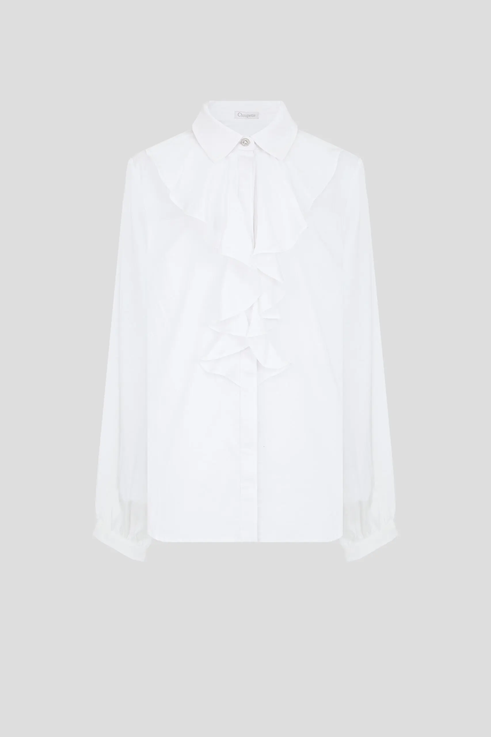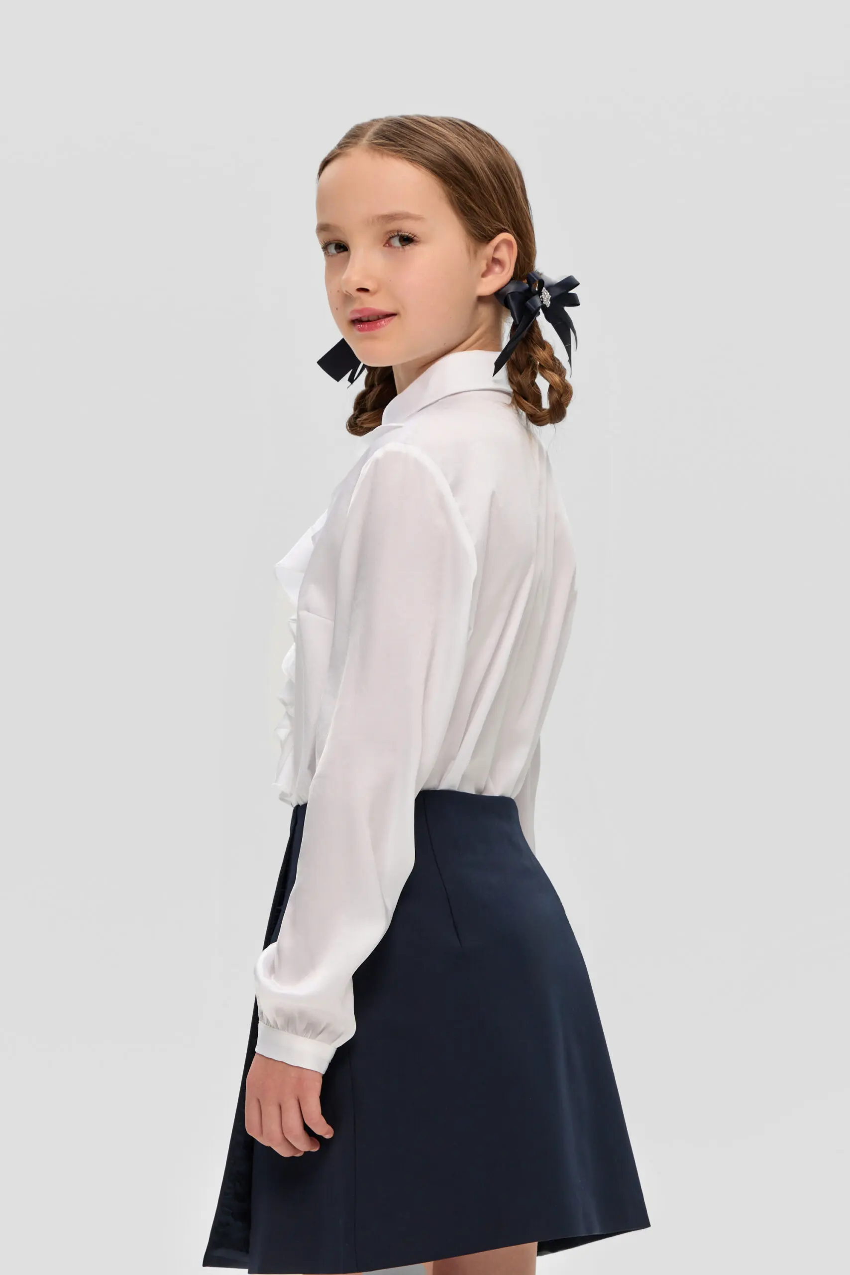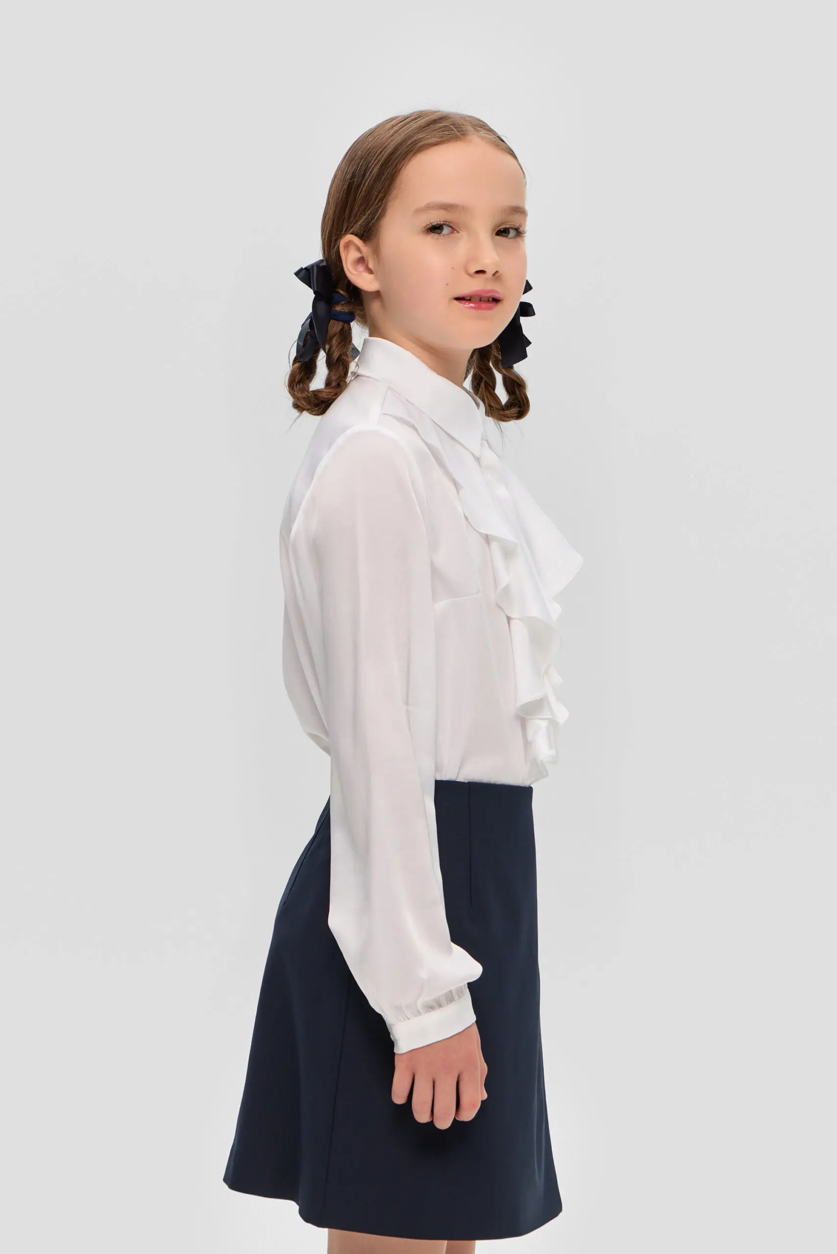 Нарядная школьная блузка для девочки. Свободный крой модели акцентирован объемным воланом. Классический отложной воротник фиксируется миниатюрной пуговкой. По всей длине блузки предусмотрена потайная застежка на пуговицы. ... Рукава длинные, на манжетах. Блузка станет прекрасным дополнением к торжественному наряду. Особенно эффектно она будет сочетаться с классическим жакетом и юбкой прямого кроя, либо с пиджаком в стиле оверсайз и широкими брюками.