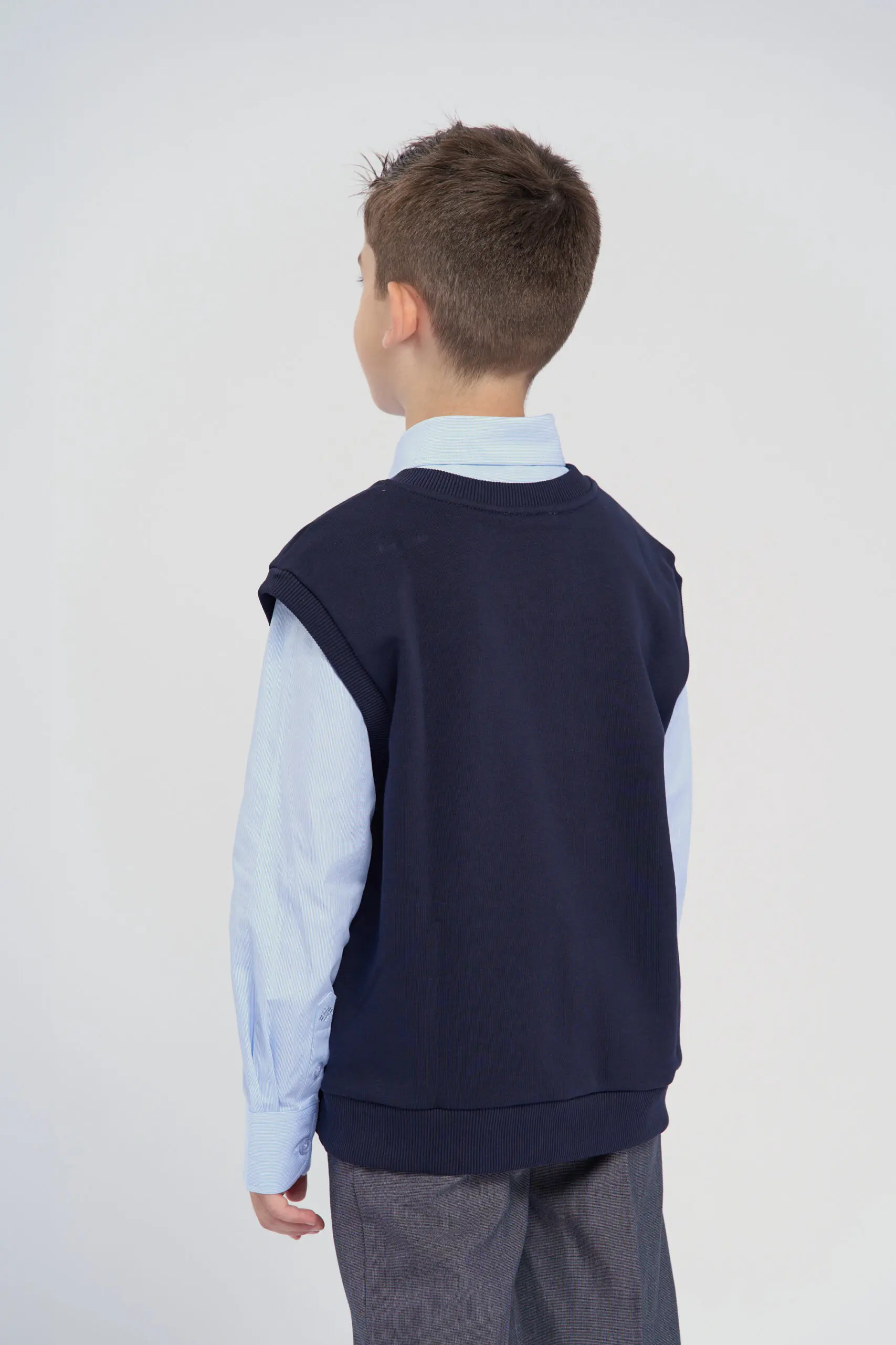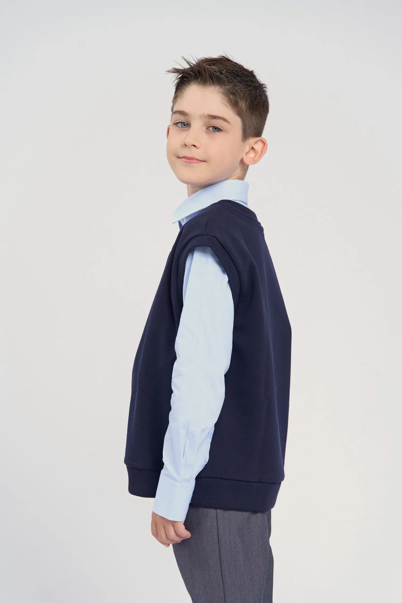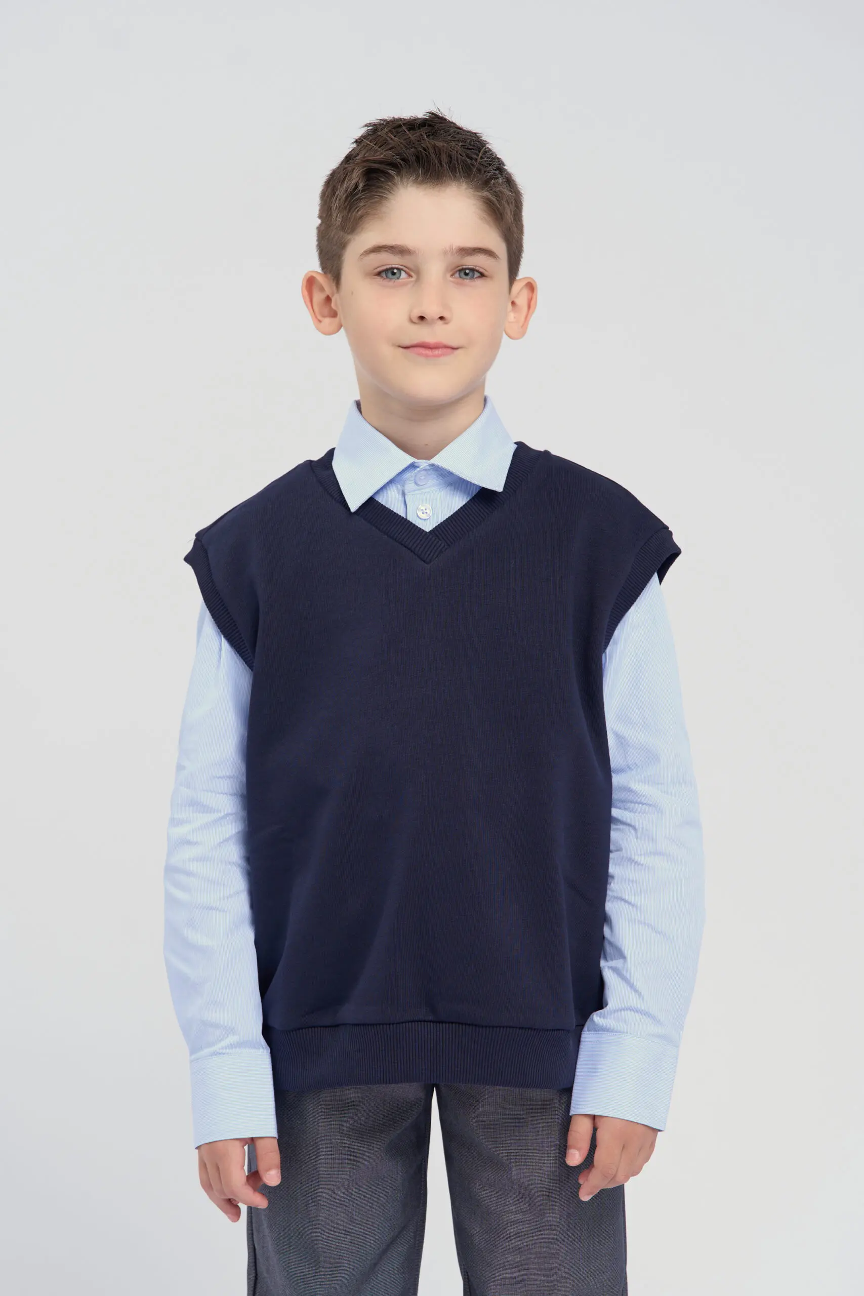 Вязаный школьный жилет для мальчика в синем цвете – прекрасный выбор для стильного ученика. Он изготовлен из высококачественного трикотажного полотна, благодаря чему долго сохранит свой безупречный ... внешний вид. Этот жилет легко сочетается как с официальной одеждой, например, брюками и пиджаком, так и с более непринужденными вещами в стиле кэжуал. V-образный вырез горловины и вязаная резинка по краям придают жилету неповторимый вид. Свободный силуэт и немного спущенная линия плеча не ограничивают движений, обеспечивая комфорт в течение всего дня в школе.