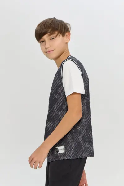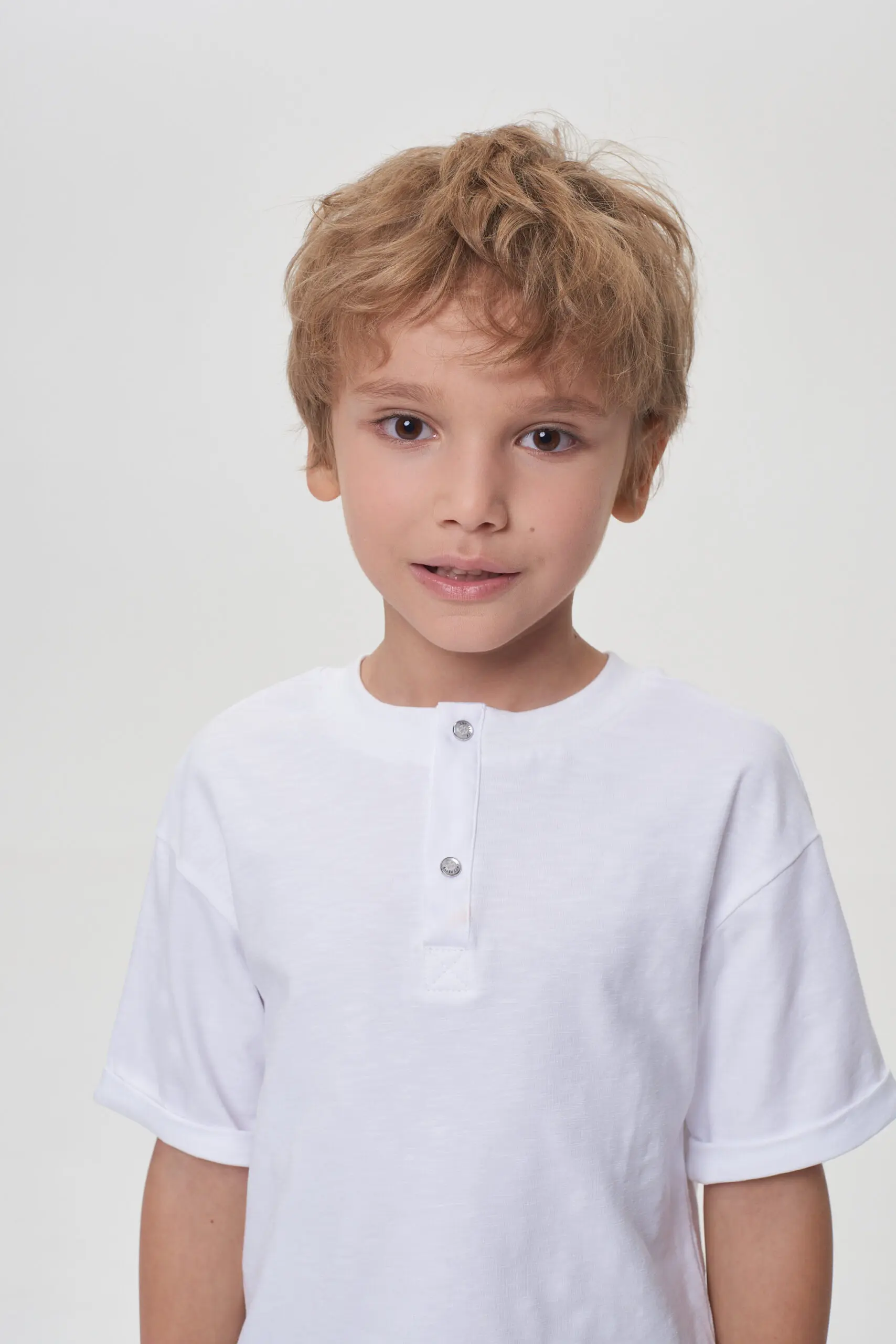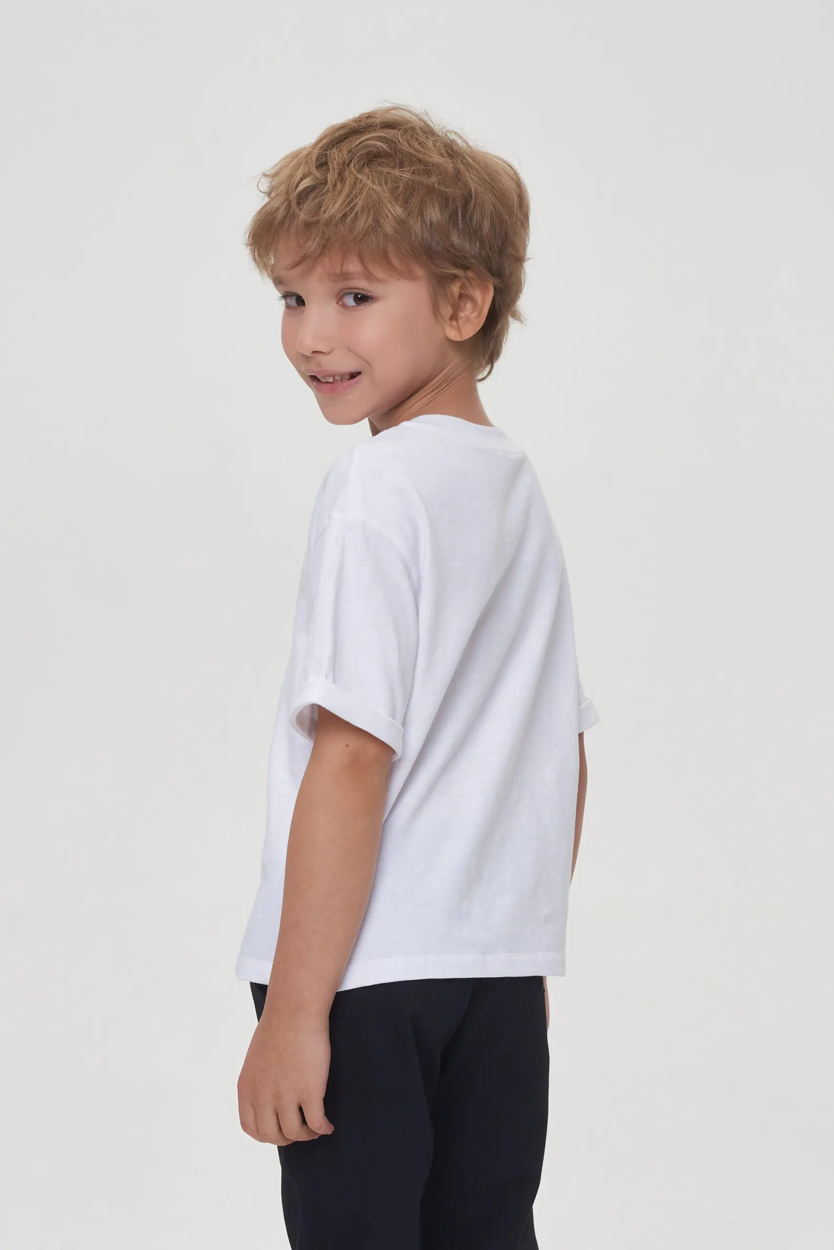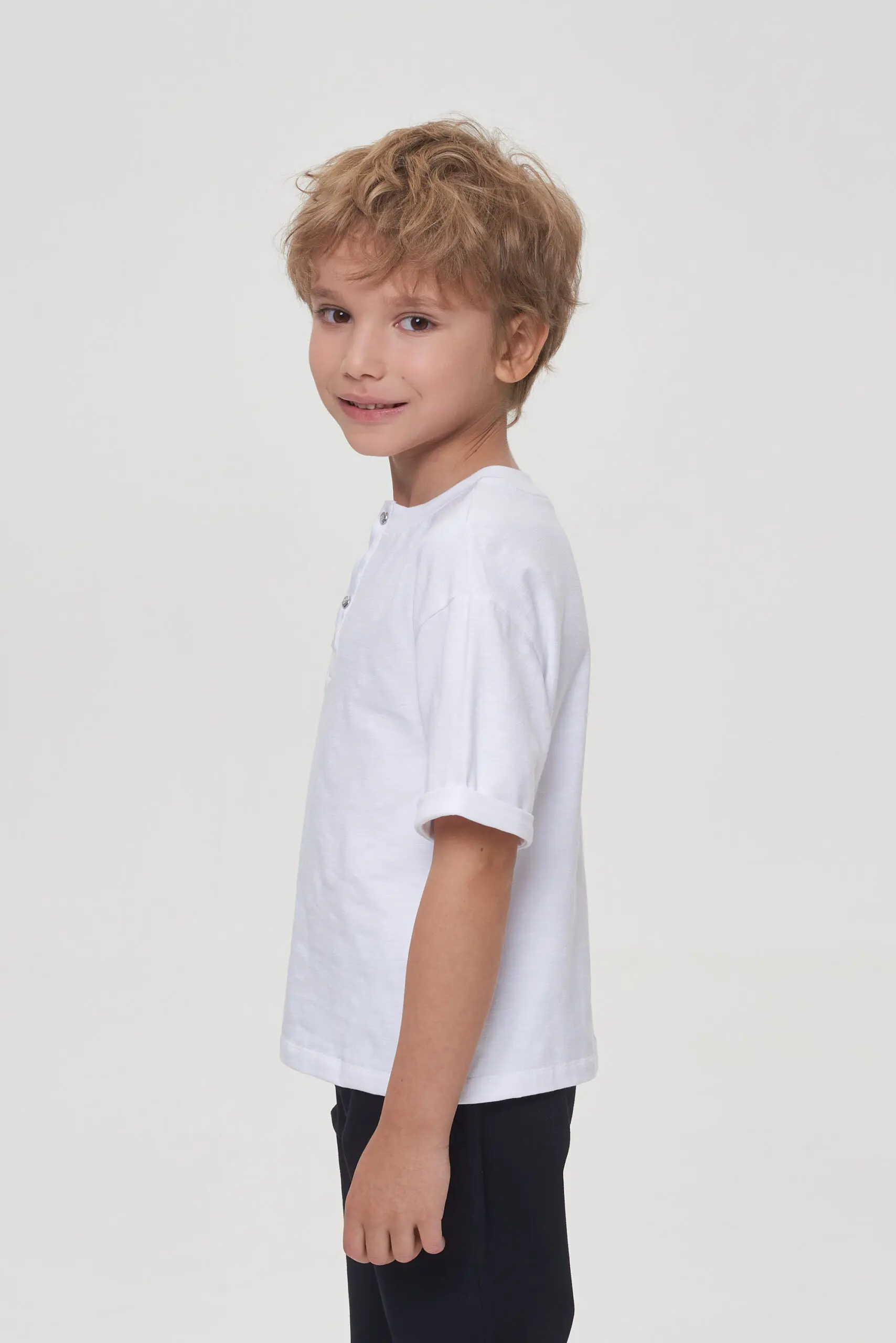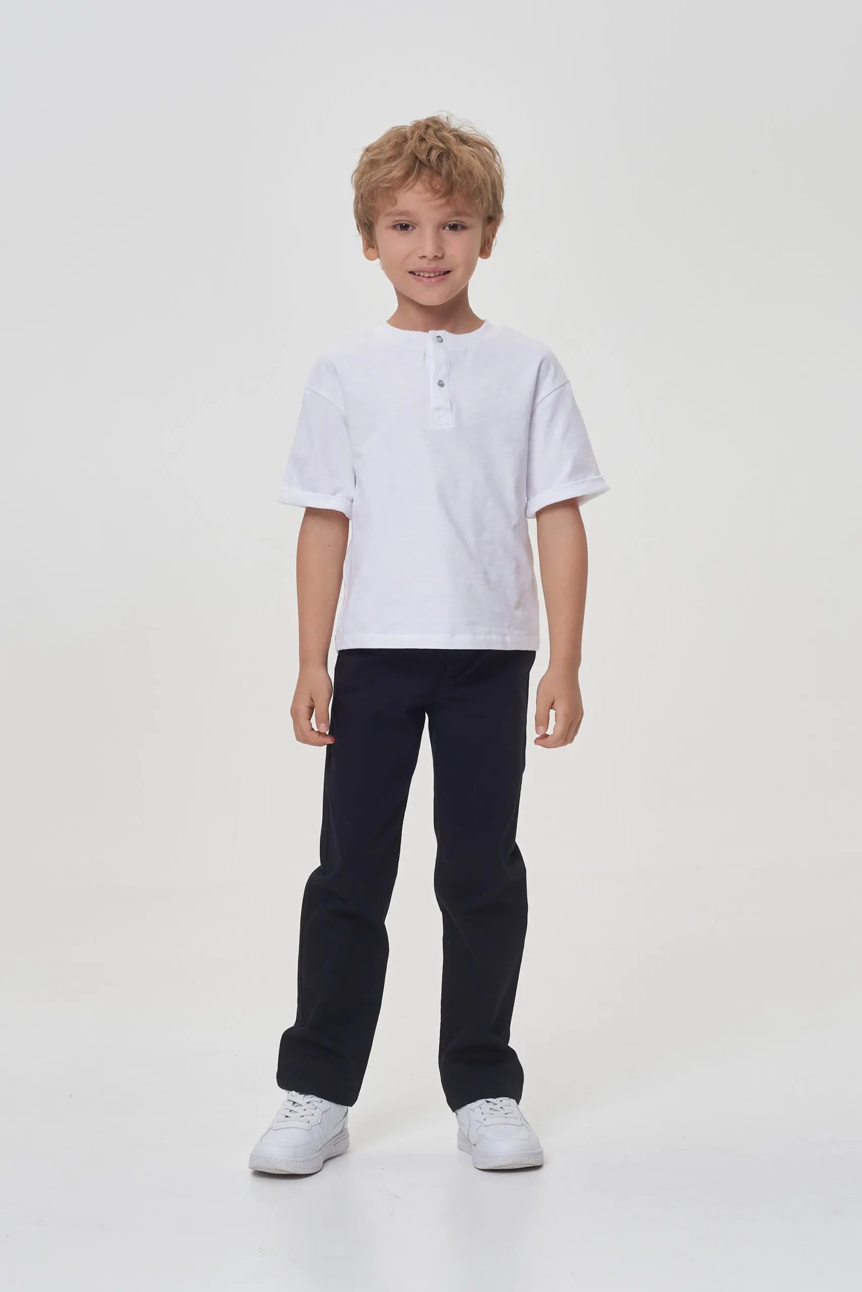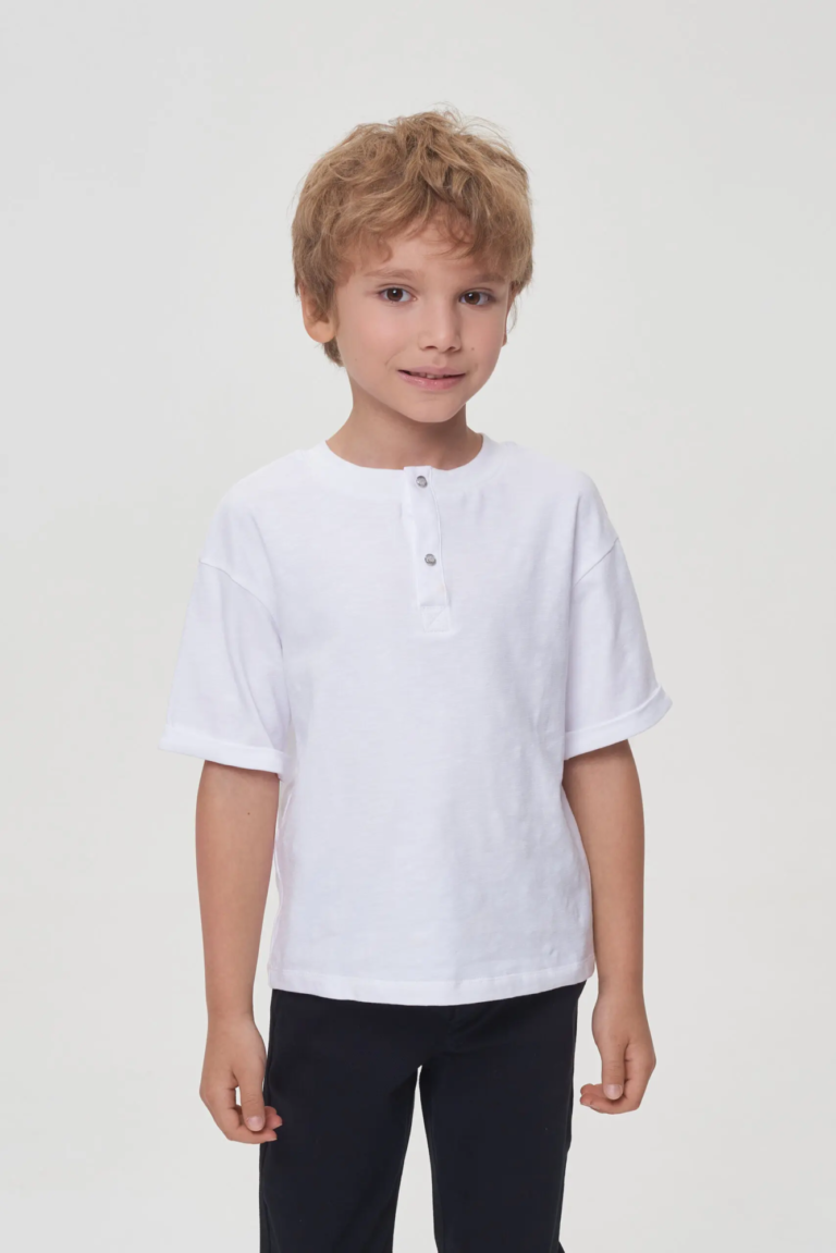 Белая футболка для мальчика – отличное решение для школьных будней. Свободный силуэт, короткие рукава со спущенной линией плеча обеспечивают комфорт. Оригинальная деталь – декоративная планка с ... пуговицами спереди. Футболка легко сочетается с пиджаками, кардиганами и толстовками.