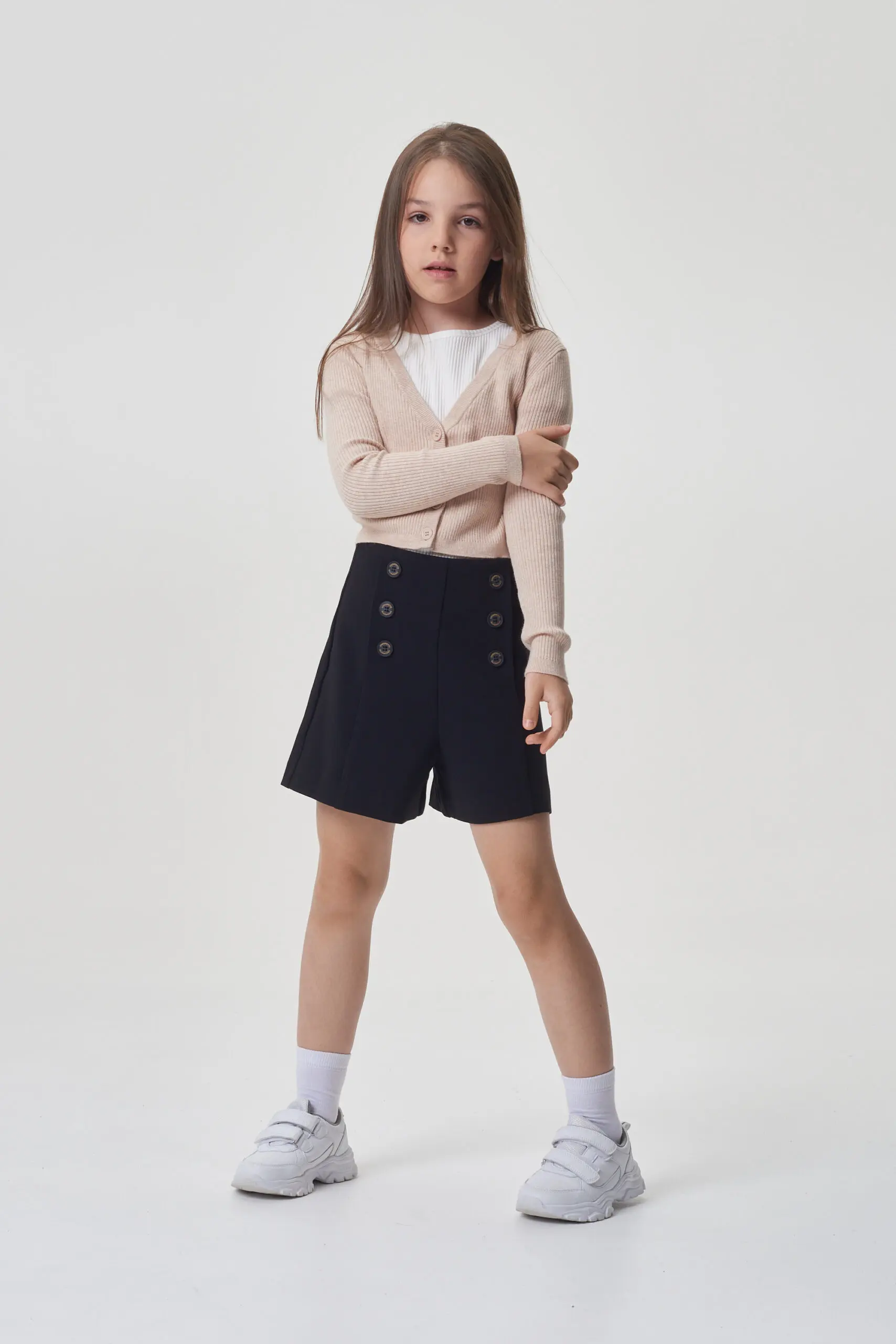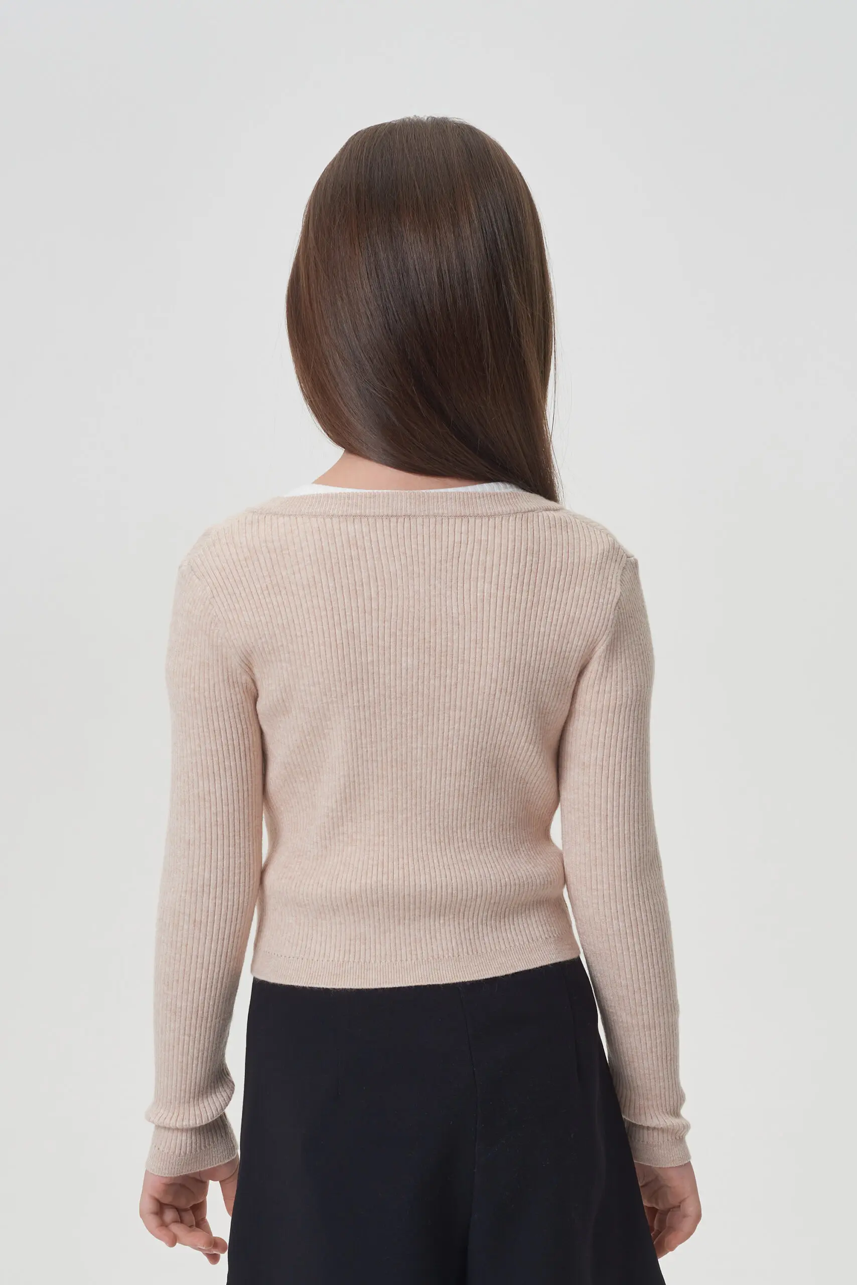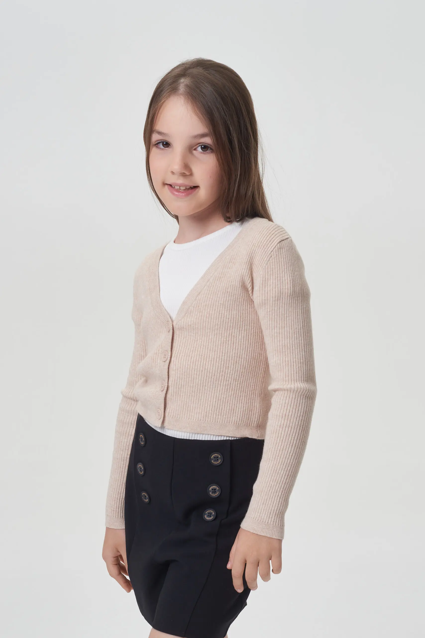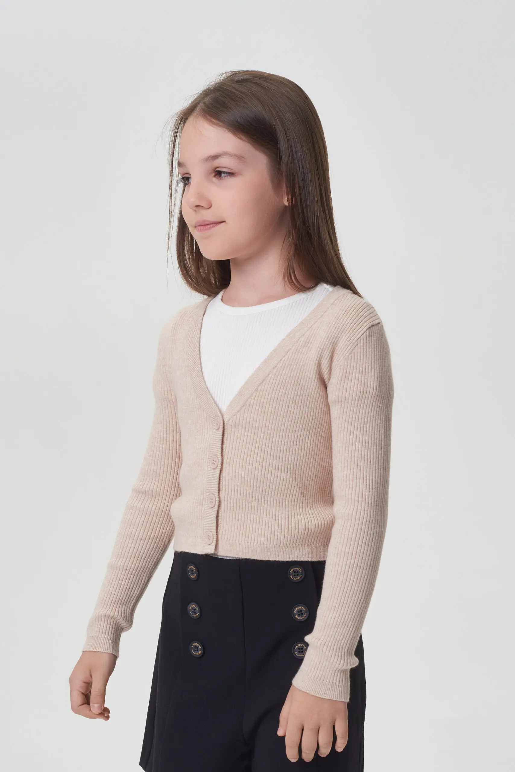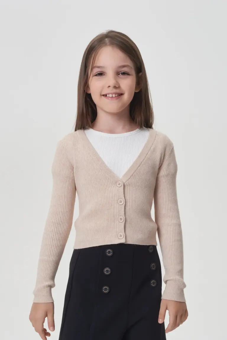 Бежевый кардиган укороченной длины – практичное решение как для школьного, так и повседневного гардероба девочки. Полуприлегающий силуэт выполнен из материала превосходного качества. Классический стиль кардигана акцентирован ... V-образным вырезом и застежкой на пуговицах, расположенной по всей длине. Рукава – длинные, с эластичными вставками на манжетах. Низ кардигана оформлен декоративной резинкой. Элегантный кардиган идеально дополнит школьный гардероб девочки, без труда сочетаясь с разнообразными платьями и сарафанами, а также с юбками и брюками. Он прекрасно гармонирует как с праздничными блузками, так и с простыми водолазками.
