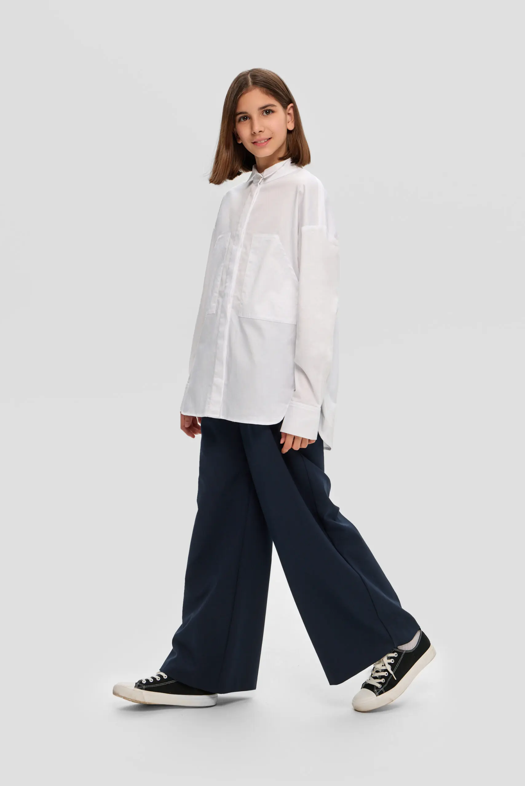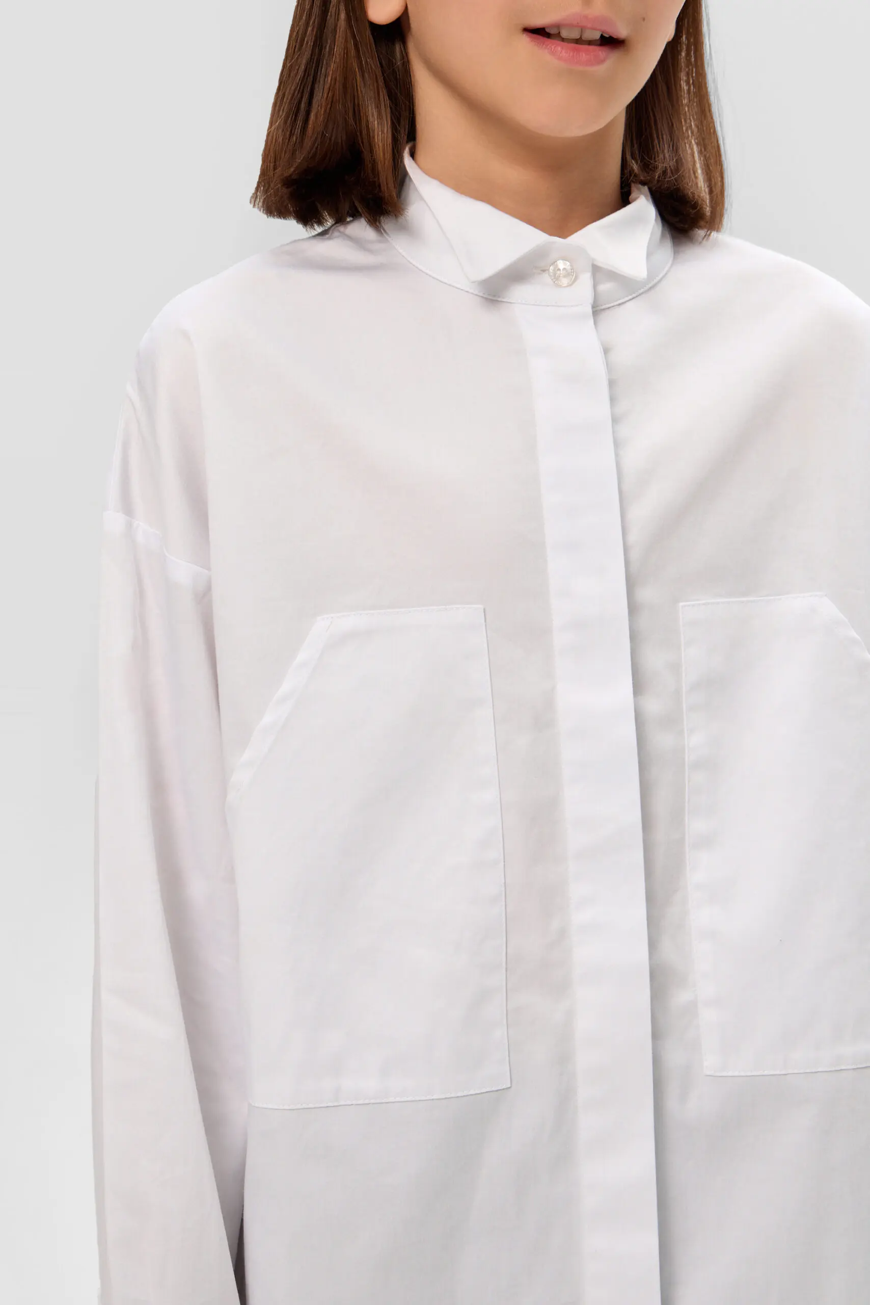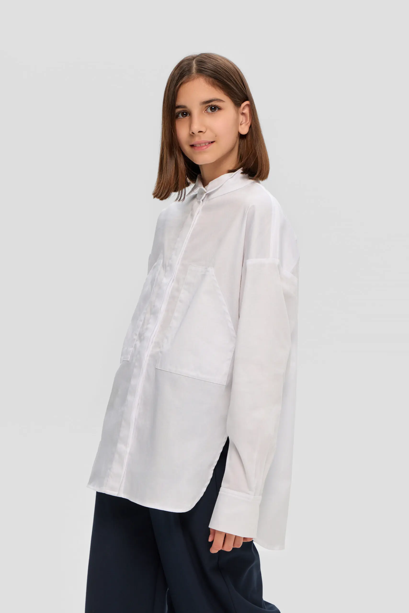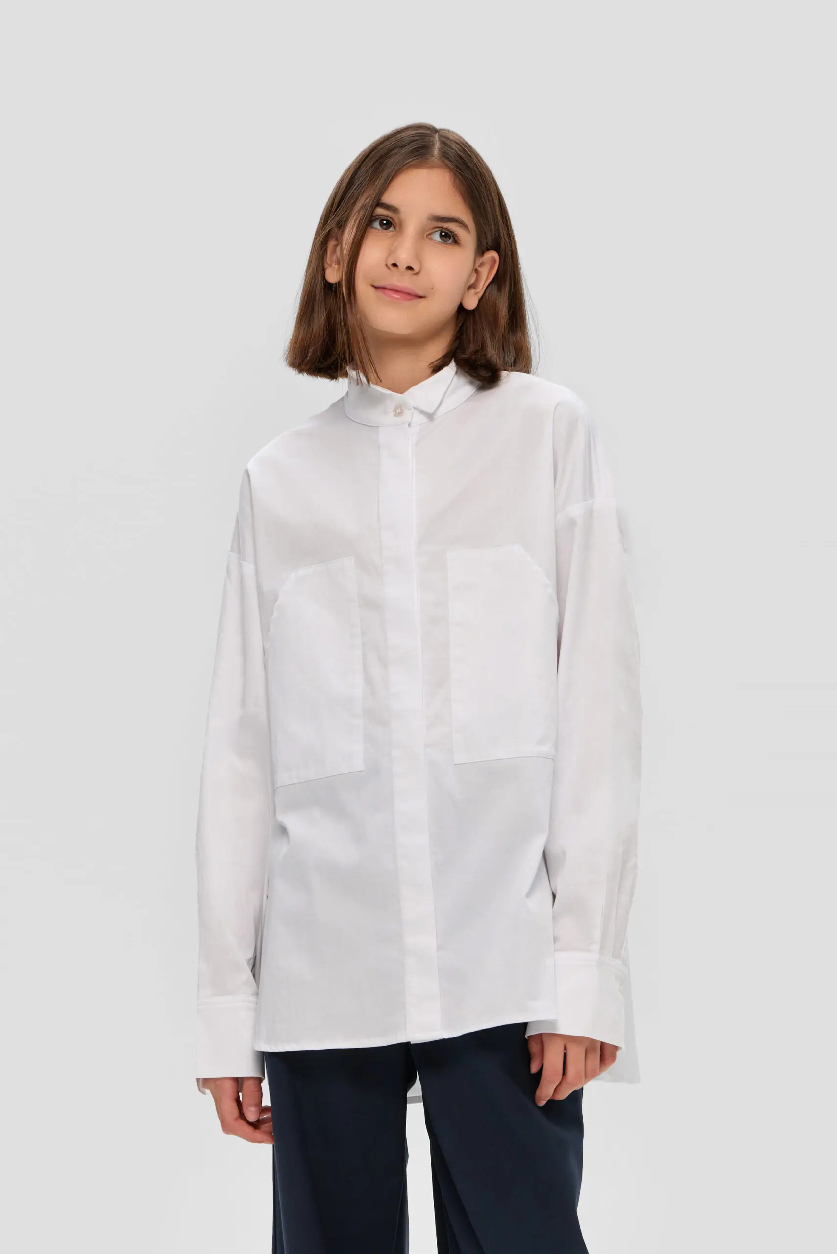 Белая блузка из хлопка – незаменимый элемент школьного гардероба. Удлиненная модель, выполненная в мужском стиле, отличается свободным силуэтом. Длинные рукава на манжетах. Классический отложной воротник и ... застежка на пуговицы по всей длине добавляют элегантности. Накладные карманы создают дополнительный акцент, делая ее не только комфортной, но и актуальной. Блузку можно носить поверх брюк, а также использовать в повседневных образах. Она легко сочетается с кардиганами, джемперами в стиле casual и джинсами.