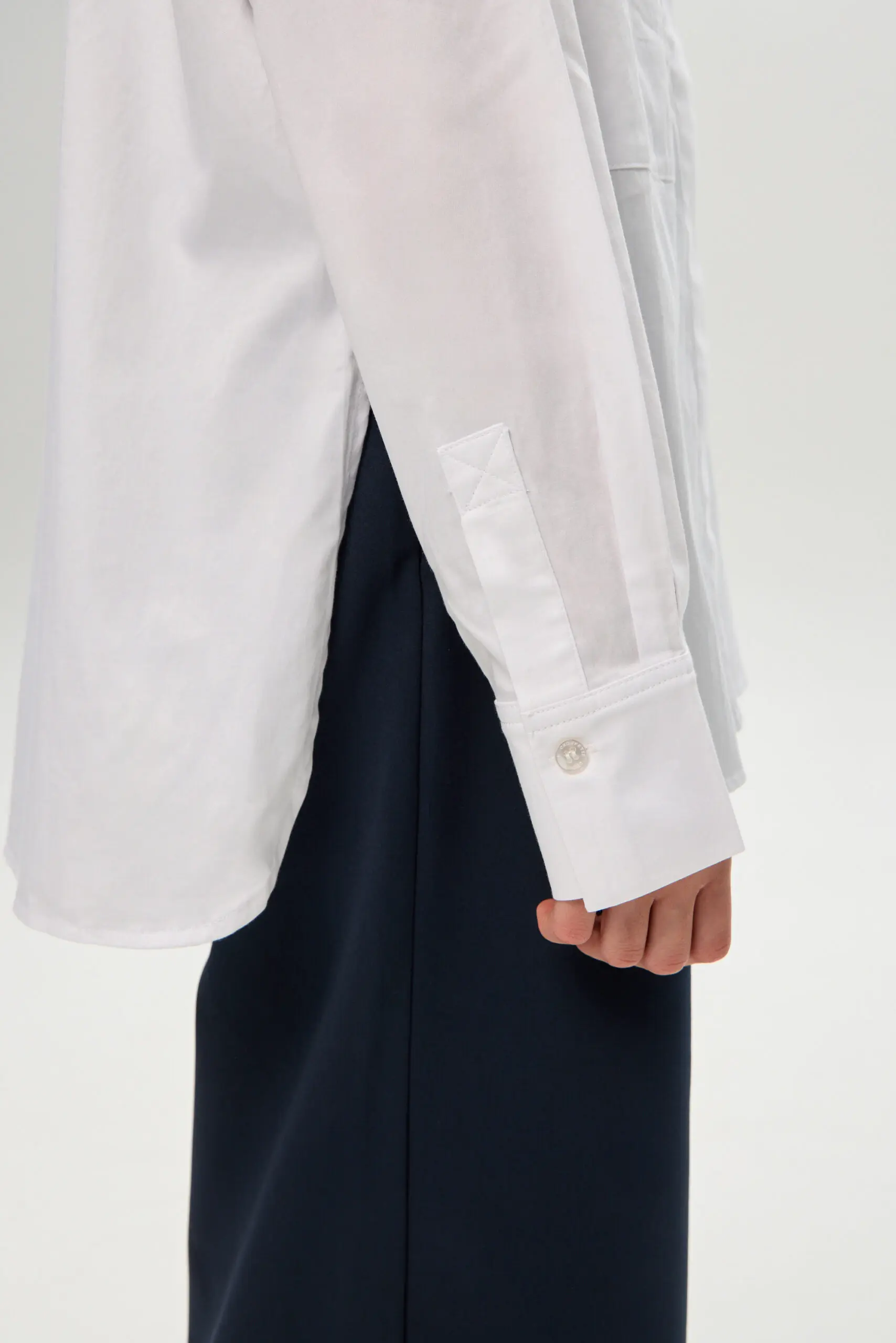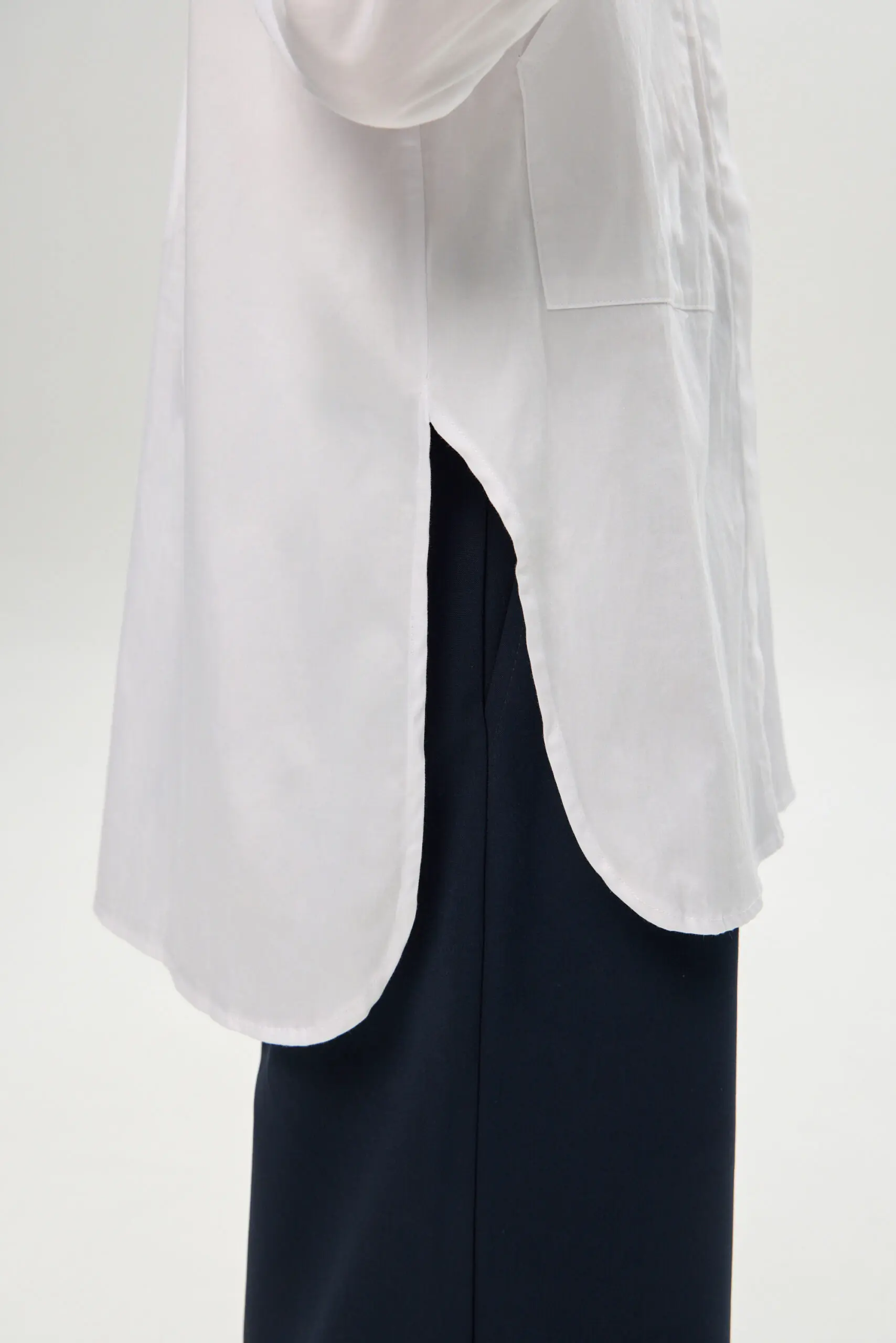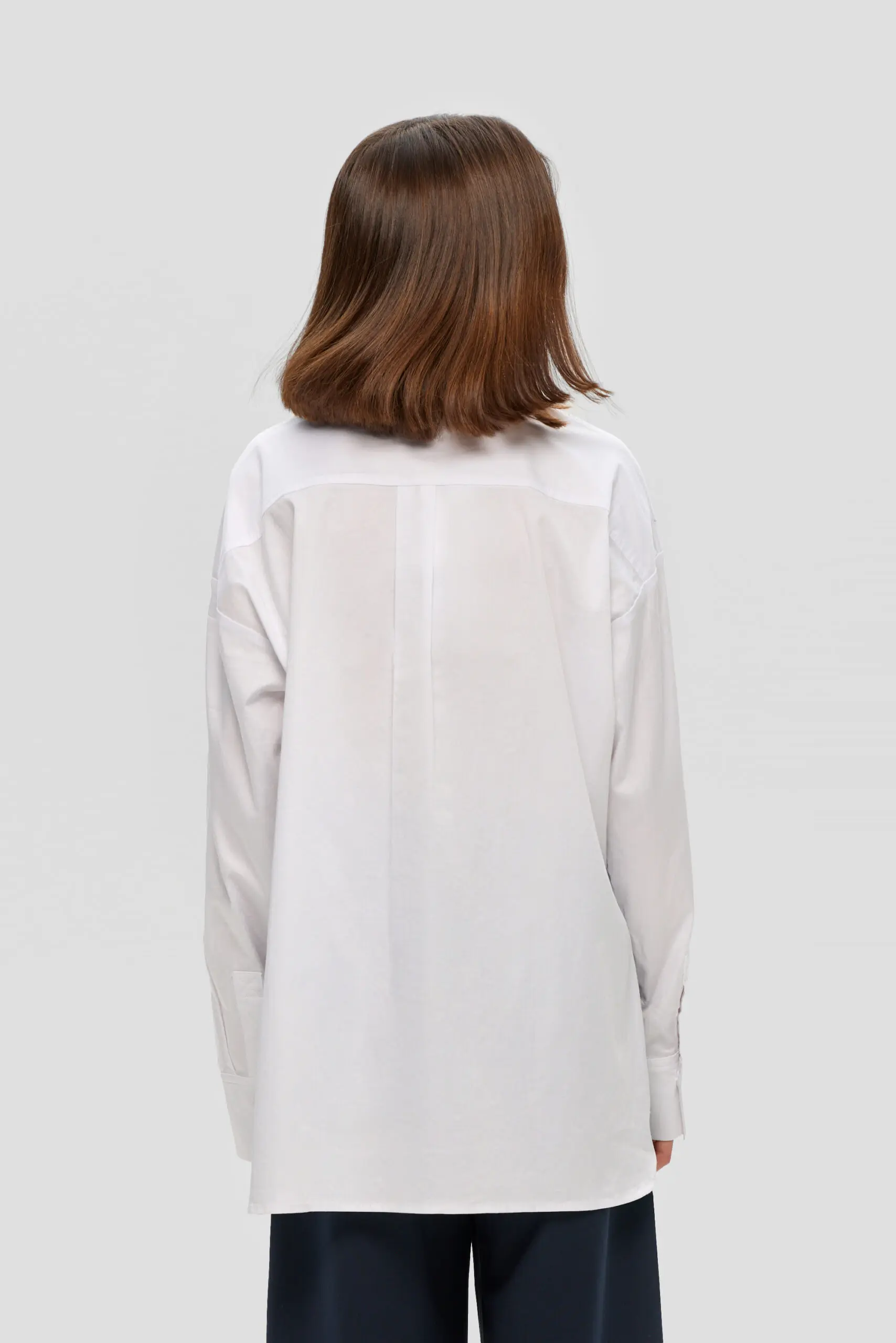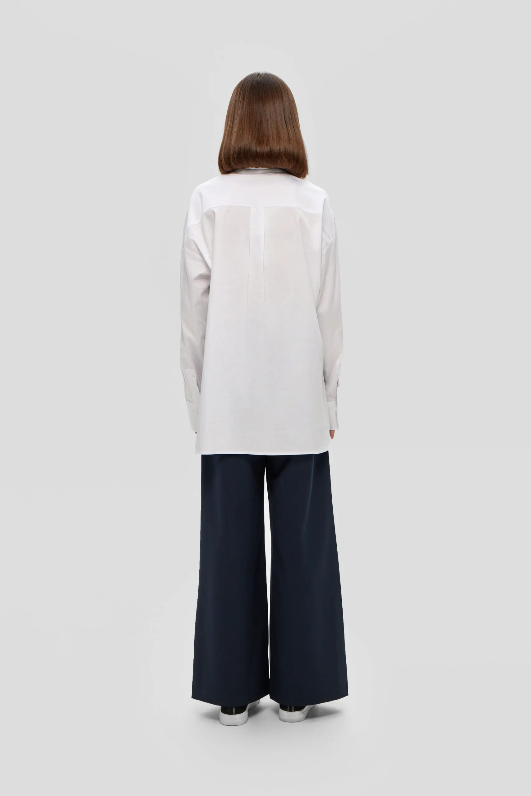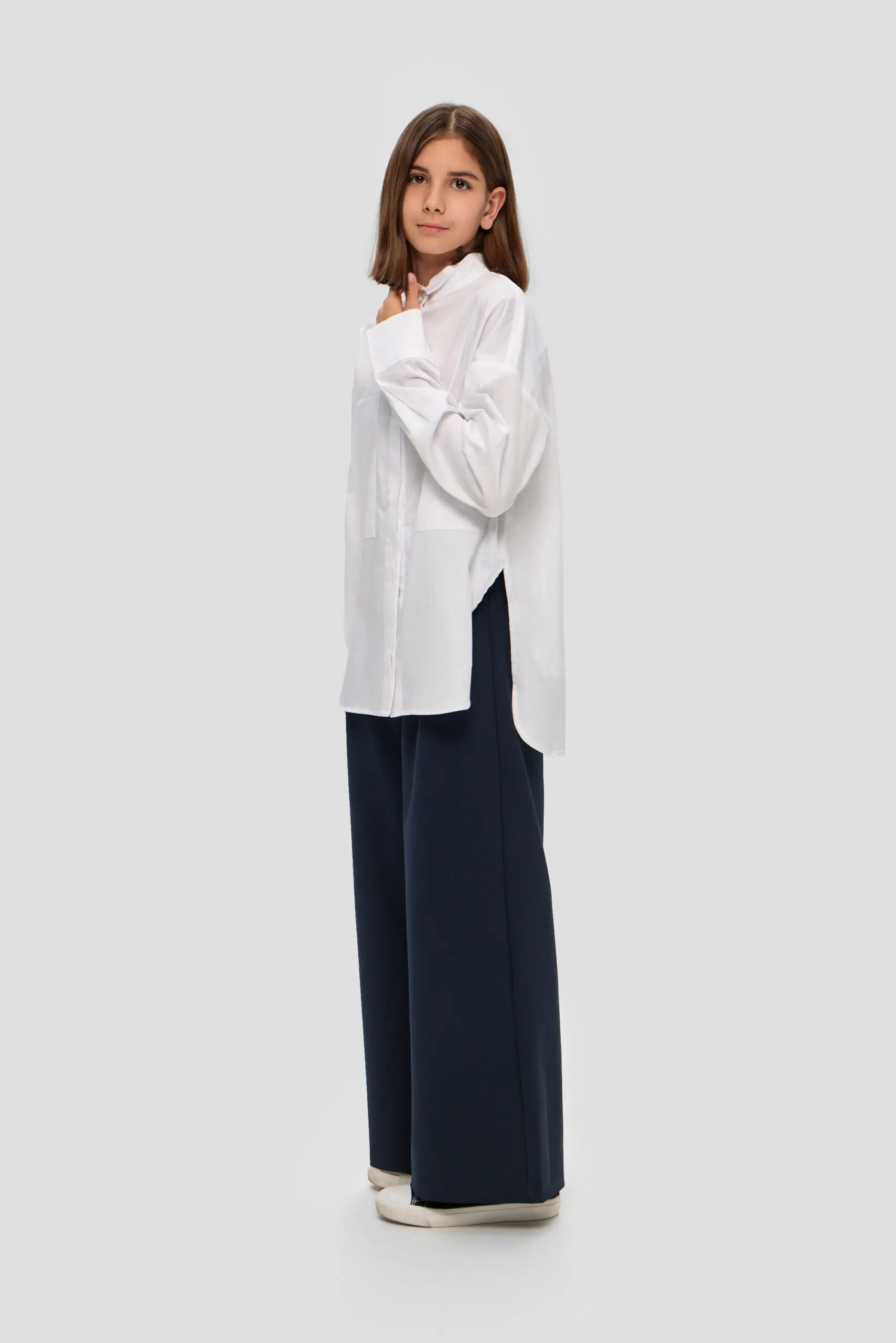 Белая блузка из хлопка – незаменимый элемент школьного гардероба. Удлиненная модель, выполненная в мужском стиле, отличается свободным силуэтом. Длинные рукава на манжетах. Классический отложной воротник и ... застежка на пуговицы по всей длине добавляют элегантности. Накладные карманы создают дополнительный акцент, делая ее не только комфортной, но и актуальной. Блузку можно носить поверх брюк, а также использовать в повседневных образах. Она легко сочетается с кардиганами, джемперами в стиле casual и джинсами.