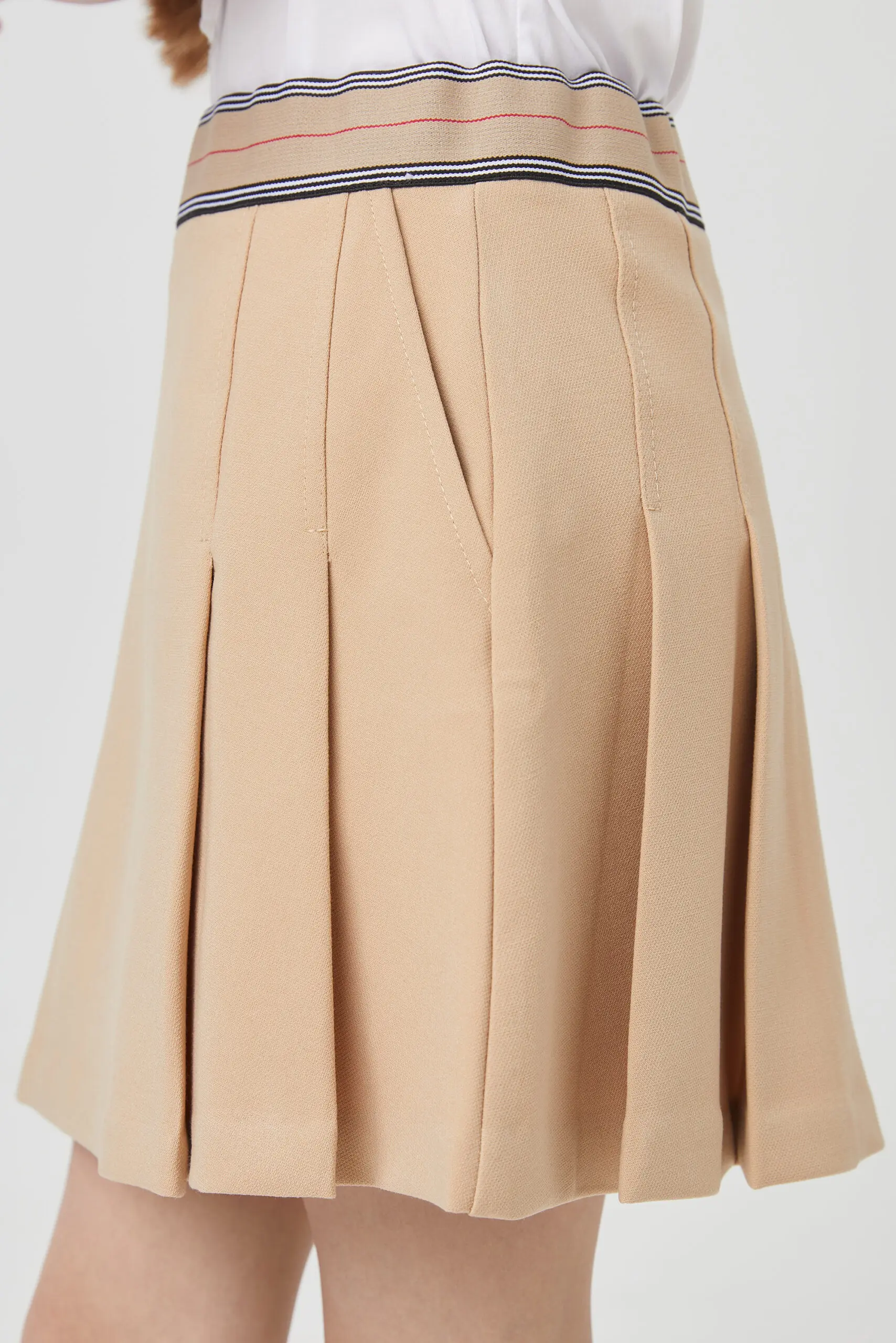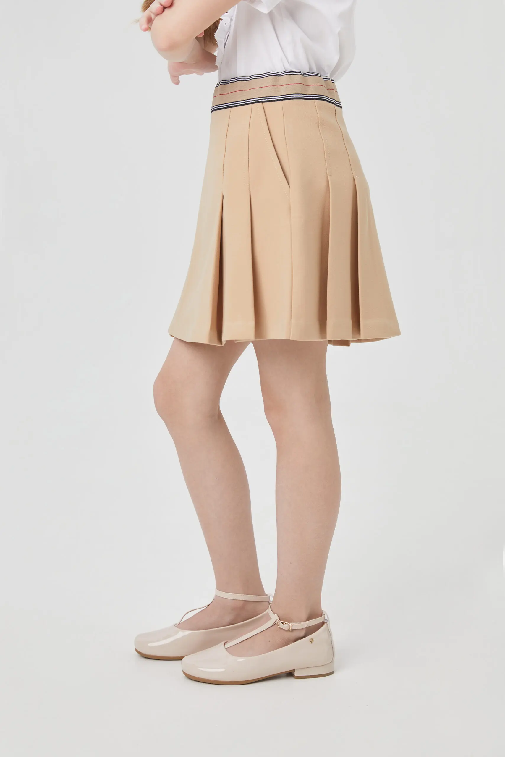 Бежевая юбка для девочки - отличная альтернатива традиционным школьным моделям. А-силуэт со складками, эластичная талия с возможностью регулировки и застежка-молния гарантируют идеальную посадку и удобство. Боковые ... карманы добавляют практичности. Изделие выполнено из качественной смесовой ткани на основе вискозы. Юбка со складками легко сочетается с различными блузами и рубашками.