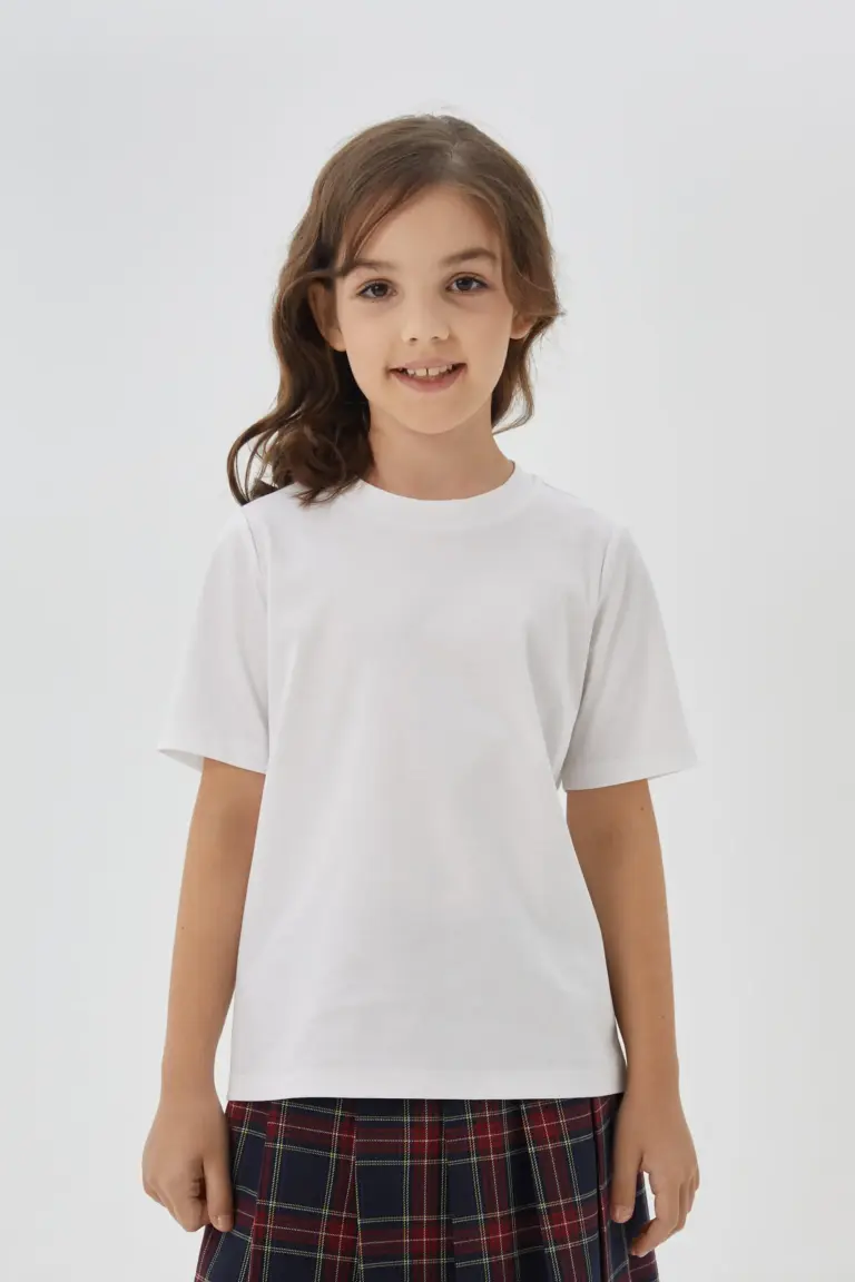 Белая футболка в лаконичном исполнении – базовый предмет гардероба для школы и на каждый день. За счет простого дизайна и комфортного фасона она идеально подходит для ... создания модных образов и сочетается с разными вещами. Футболка отлично смотрится как с юбками и кардиганами, так и с брюками и жакетами, а также с джинсами и пиджаками.