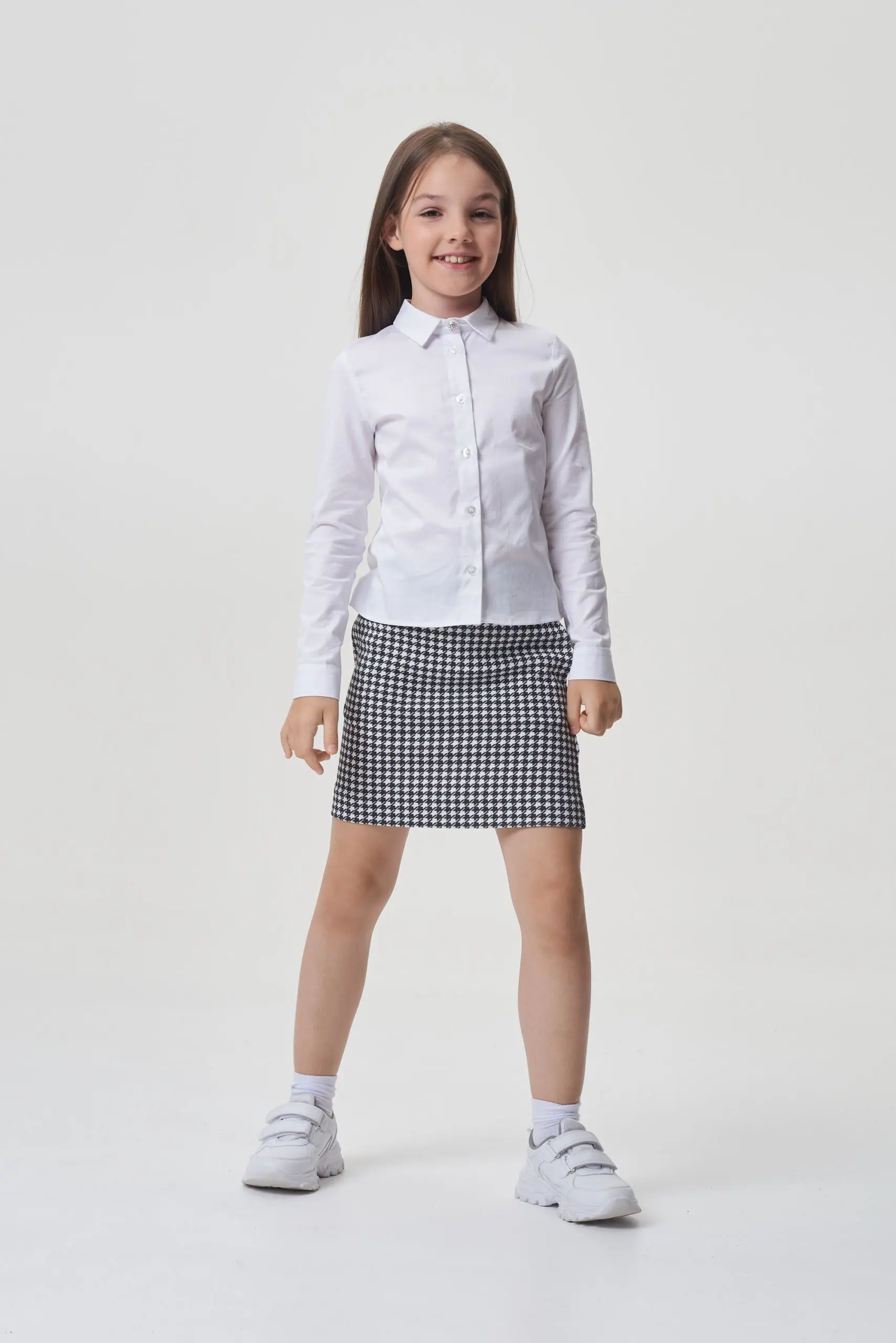 Юбка из джерси для девочки – элегантное и практичное решение для создания не только школьного образа, но и повседневного. Классический принт «пье-де-пуль», или «гусиная лапка», добавляет ... изделию элегантность, делая его стильным и современным. Нежный и мягкий на ощупь трикотаж дарит удобство в процессе носки. Благодаря прямому силуэту юбка превосходно комбинируется с разнообразными элементами верха – от обычных футболок и водолазок до нарядных кофточек и блуз. Её универсальность позволяет создавать как ежедневные, так и более торжественные комплекты. Эластичная резинка на поясе обеспечивает комфортную фиксацию. Наличие боковых карманов делает юбку более функциональной.