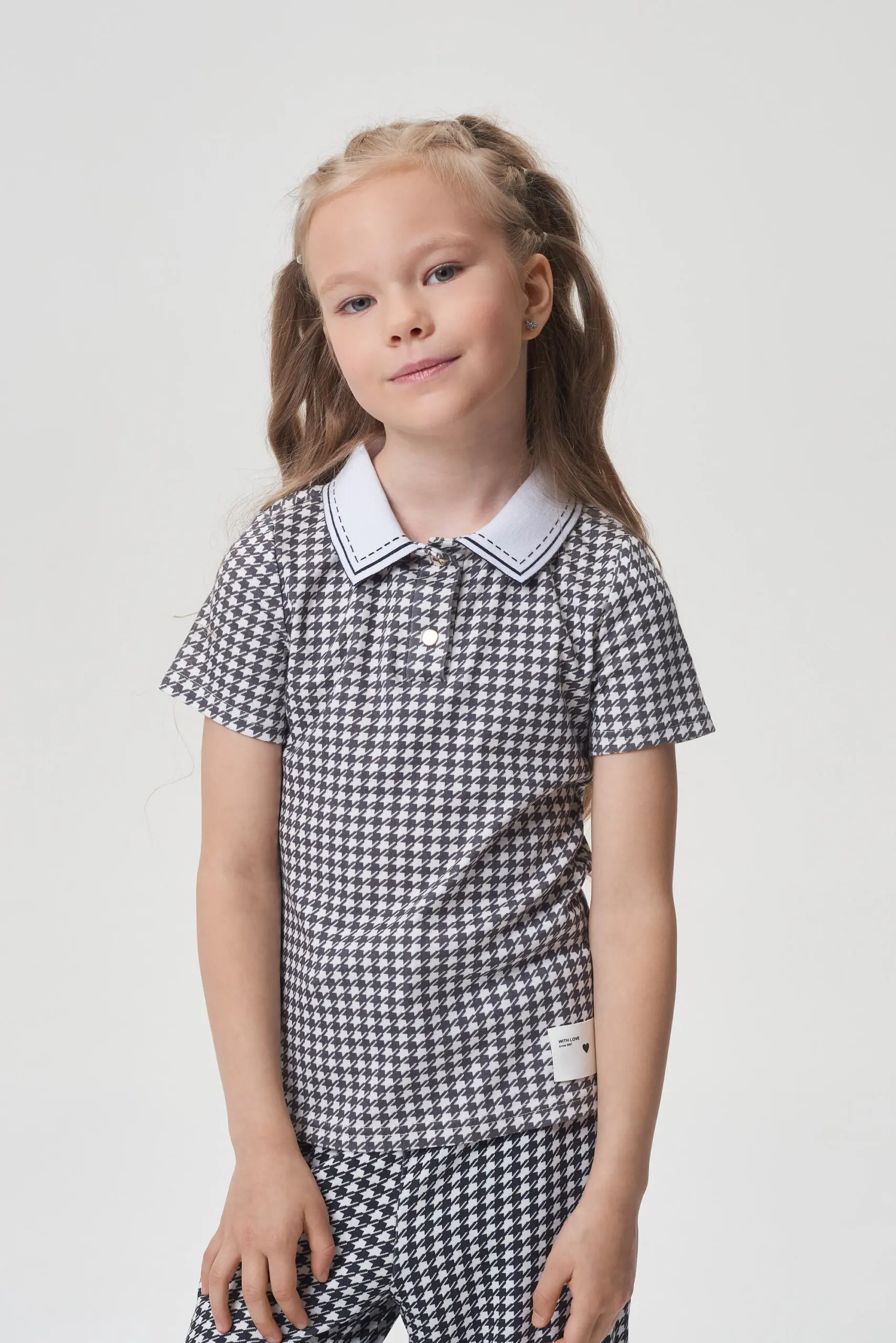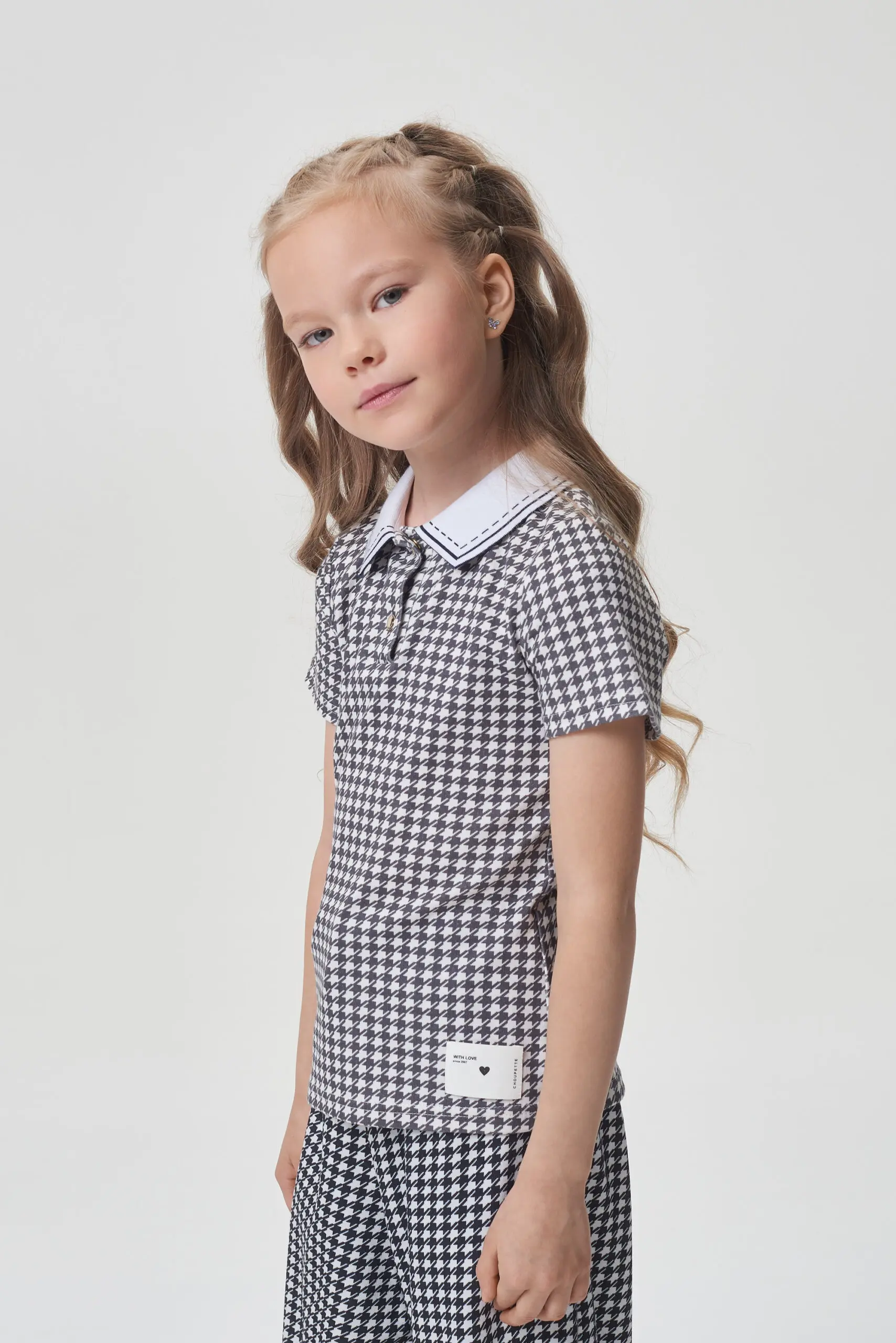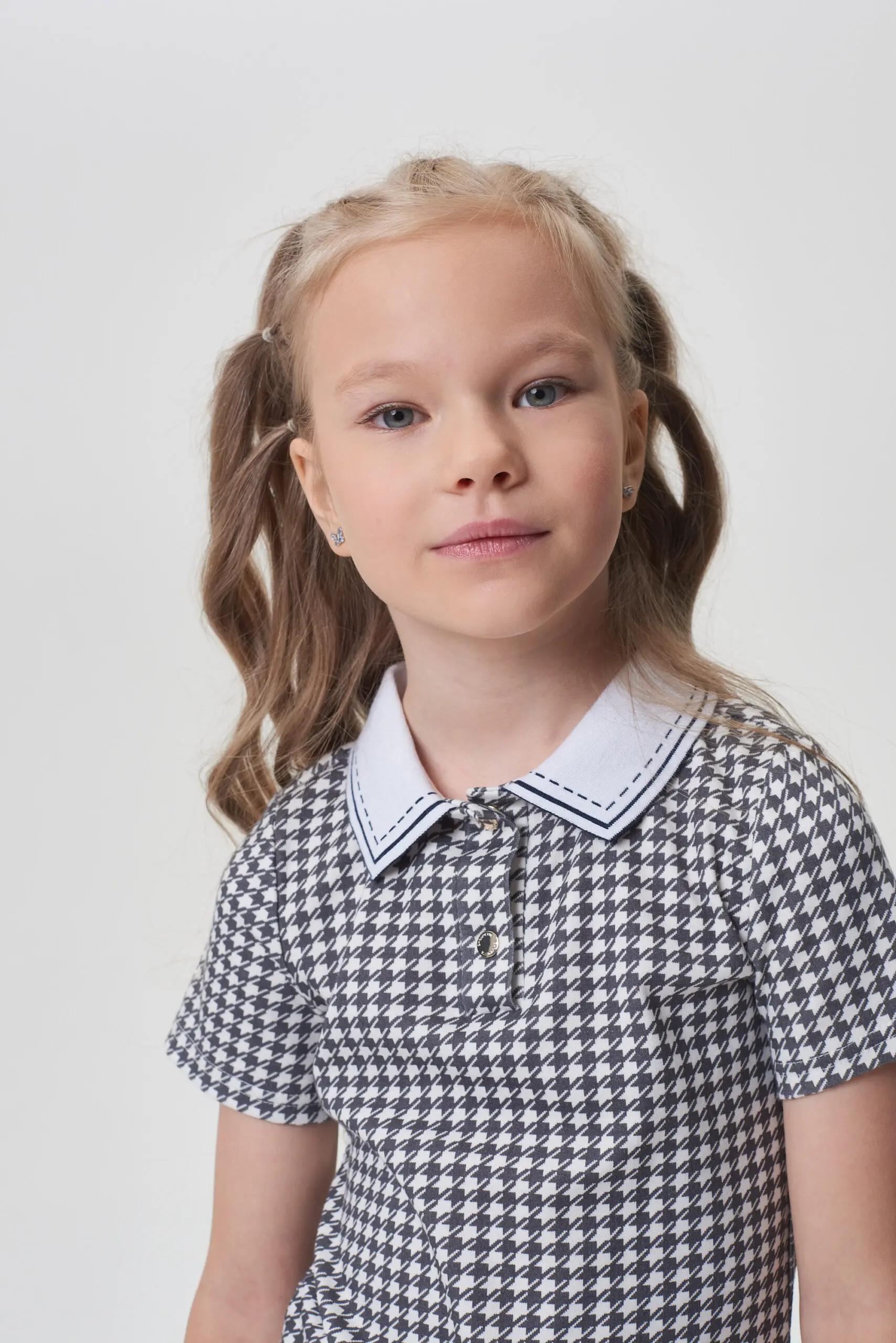 Футболка - замечательная альтернатива школьным блузкам. Благодаря лаконичному дизайну, эта вещь станет основой ежедневного гардероба для ученицы. Данная модель, с большим процентом хлопка, отличается прилегающим силуэтом, ... отложным поло-воротником и короткими рукавами. Футболка с узором "гусиная лапка" внесет разнообразие не только в школьные комплекты, но и в обычные образы.