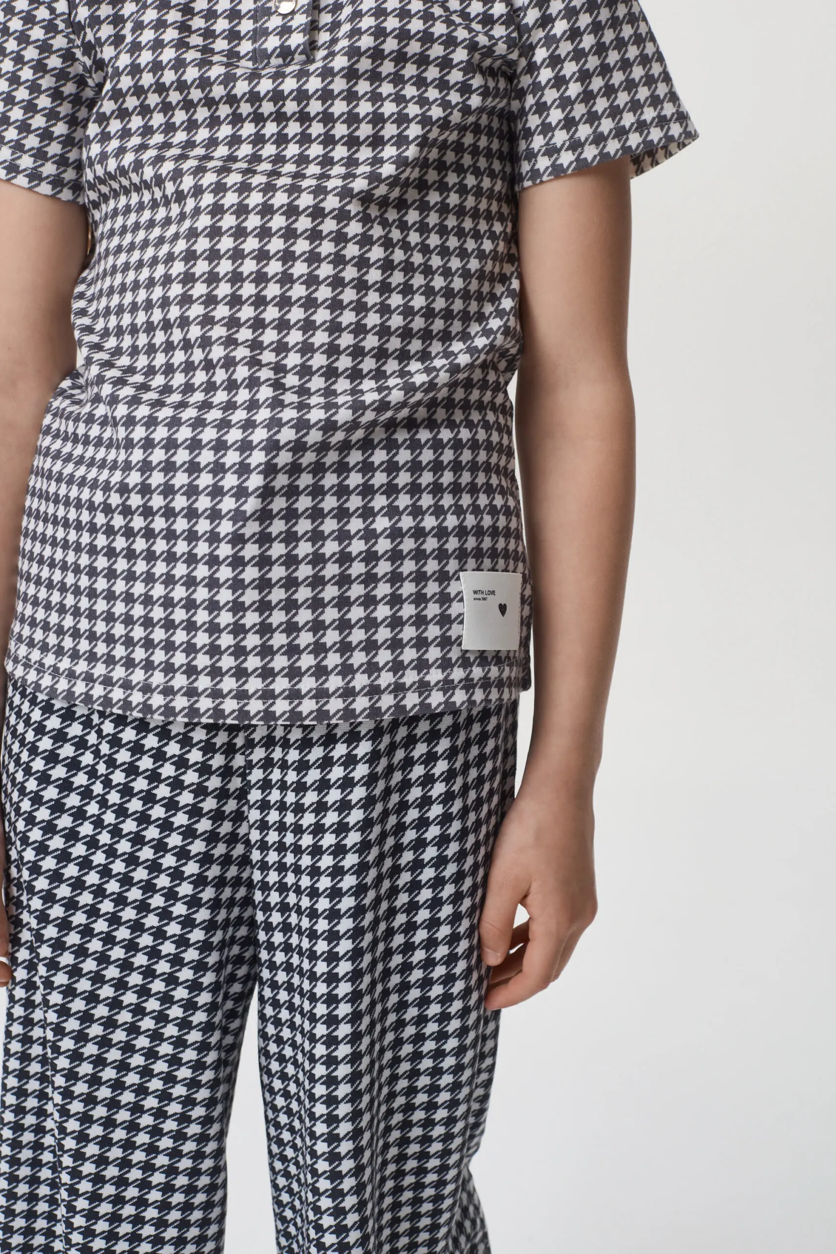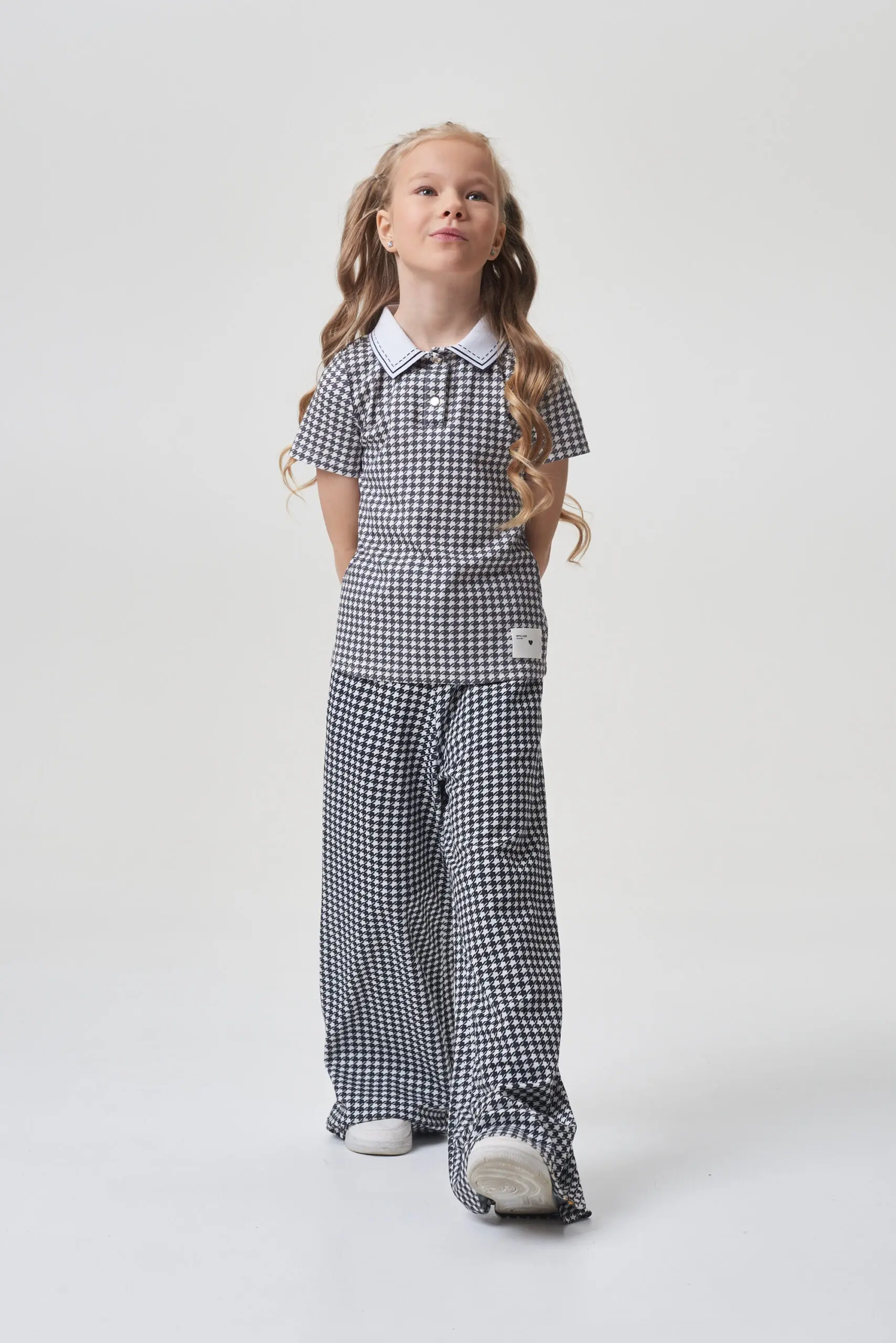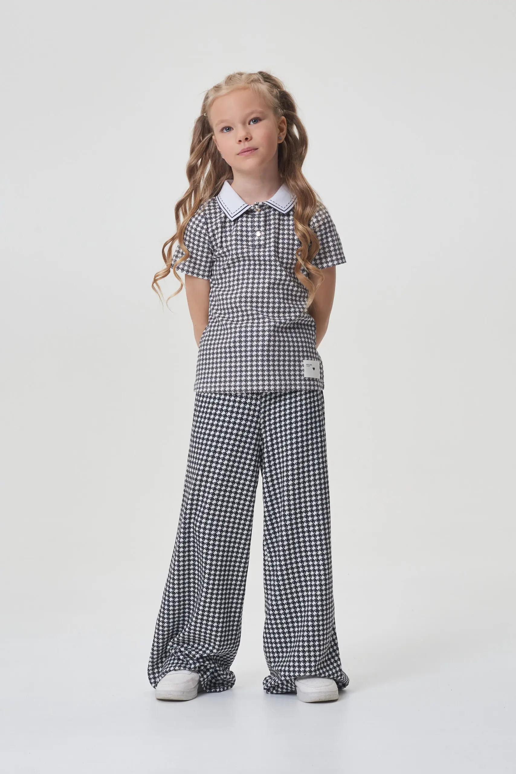 Футболка - замечательная альтернатива школьным блузкам. Благодаря лаконичному дизайну, эта вещь станет основой ежедневного гардероба для ученицы. Данная модель, с большим процентом хлопка, отличается прилегающим силуэтом, ... отложным поло-воротником и короткими рукавами. Футболка с узором "гусиная лапка" внесет разнообразие не только в школьные комплекты, но и в обычные образы.