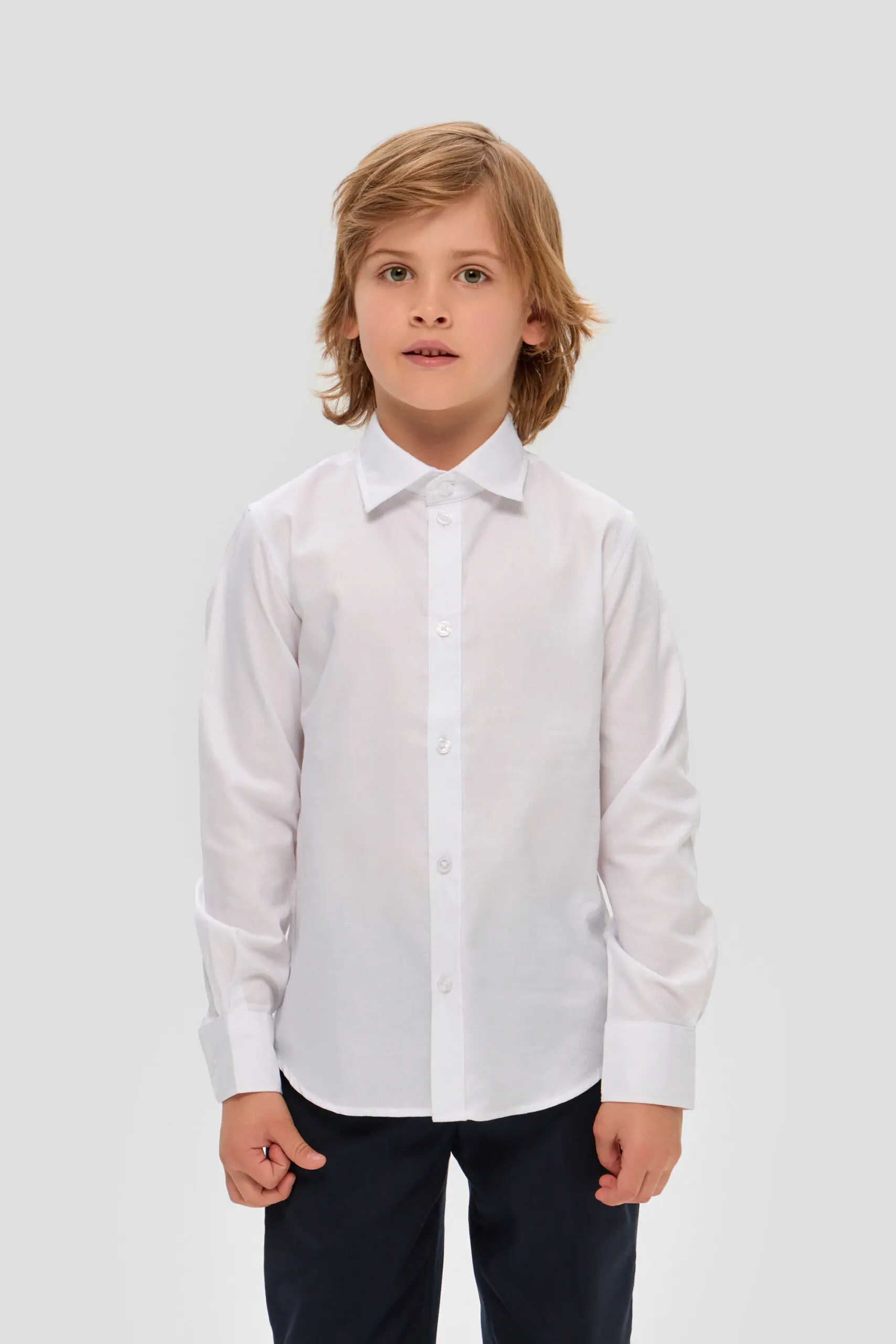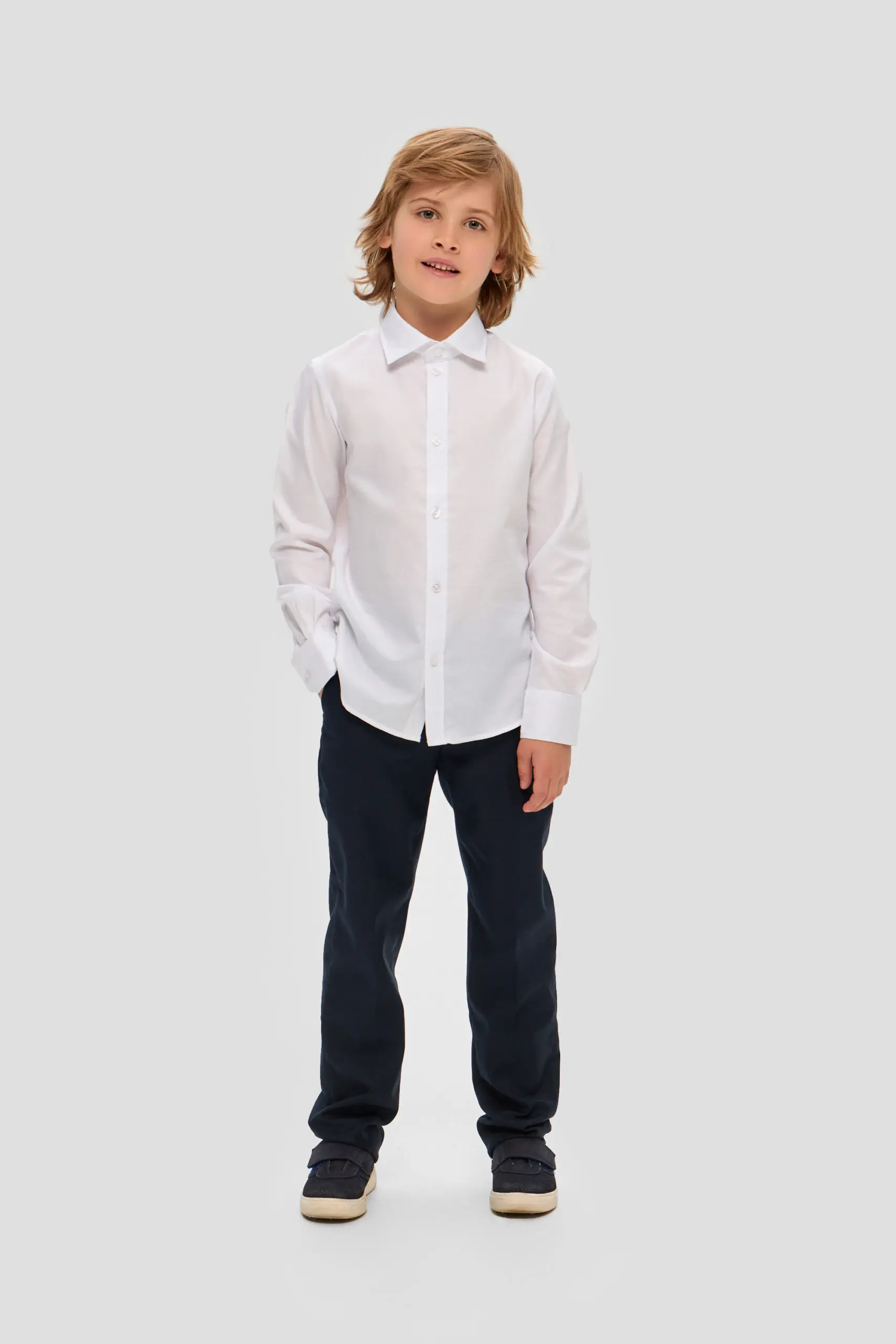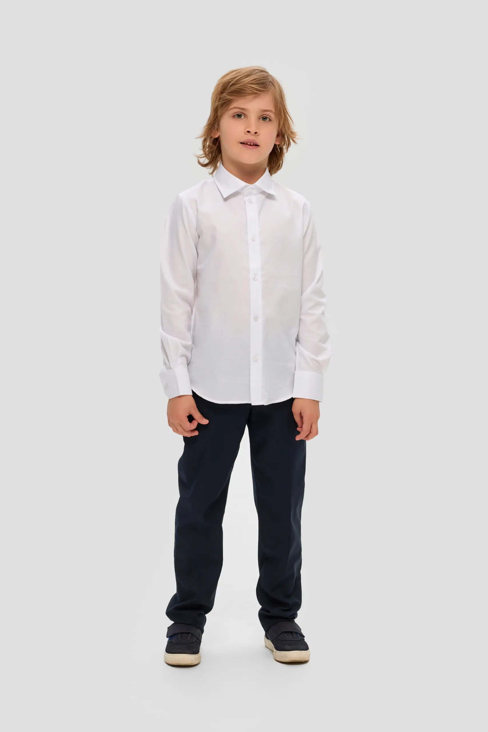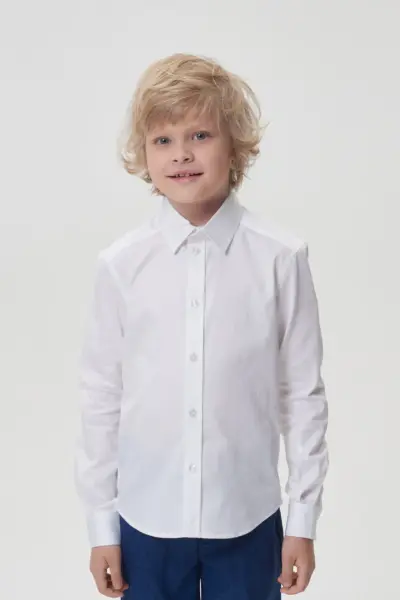 Белая сорочка для мальчика, выдержанная в традиционном дизайне, – обязательная составляющая гардероба для школьника. Эта модель свободного силуэта изготовлена из качественной ткани с преобладанием хлопка. Несомненное ... преимущество этой сорочки – неприхотливость в уходе: она практически не мнется и её очень легко гладить. Особенности модели: классический отложной воротник, который позволяет носить галстук или бабочку, застёжка на пуговицы по всей длине изделия, длинные рукава с манжетами. Линия низа имеет округлую форму. Эта сорочка прекрасно комбинируется с жилетами, пиджаками и кардиганами.