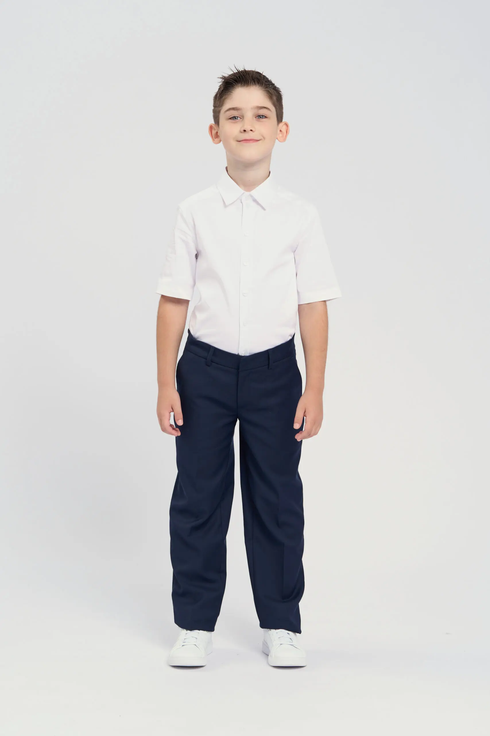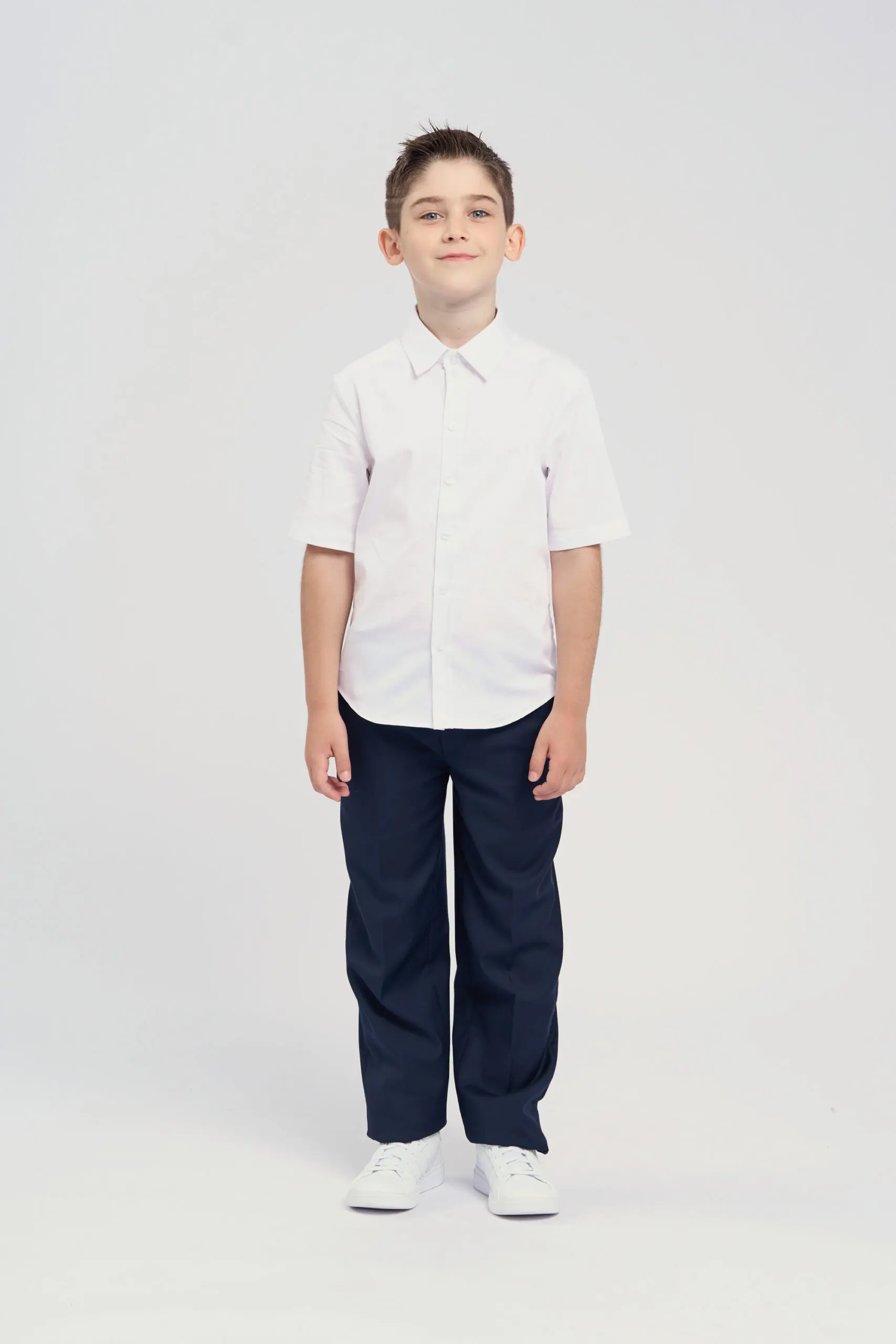 Сорочка с короткими рукавами для мальчика – отличный вариант как для обычных дней в школе, так и для особенных событий, например, торжественных линеек и праздничных мероприятий. ... Эта модель, имеющая силуэт slim, идеально садится по фигуре, не сковывает движения, что немаловажно для энергичных мальчиков, которые активно проводят время на переменах. Благодаря коротким рукавам, рубашка станет прекрасным решением для теплой погоды или помещений с хорошим отоплением. Классический отложной воротник позволяет дополнить образ галстуком или бабочкой. Удобная застежка на пуговицах расположена по всей длине изделия.