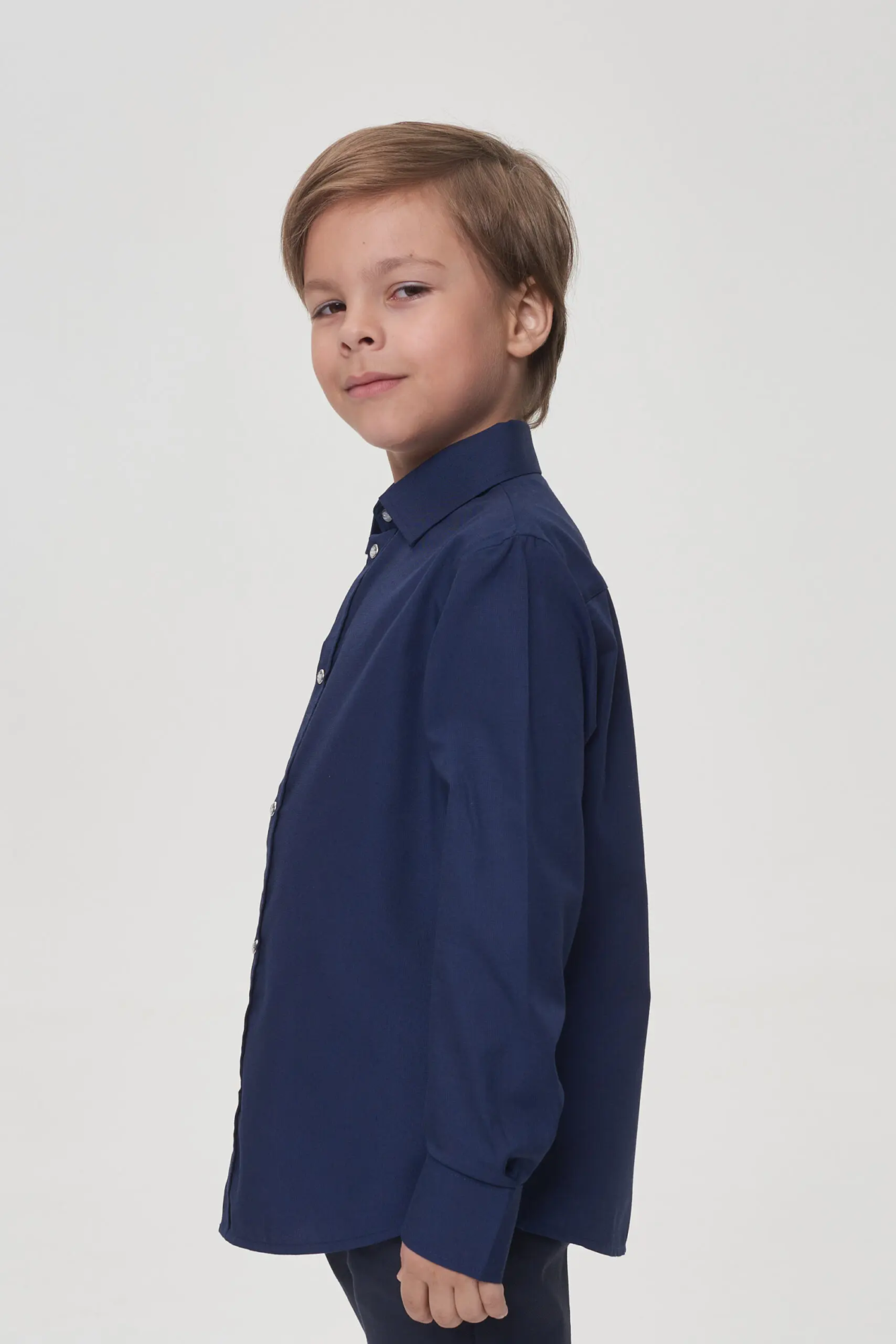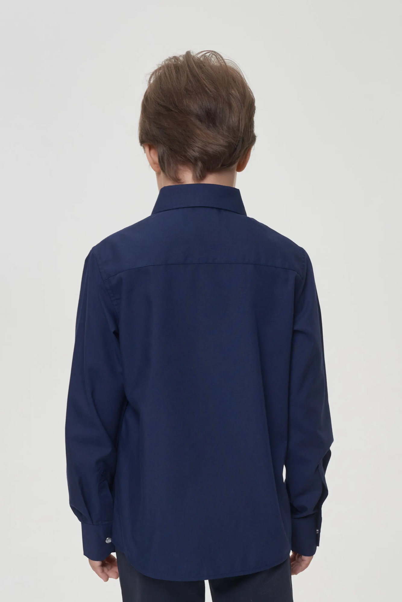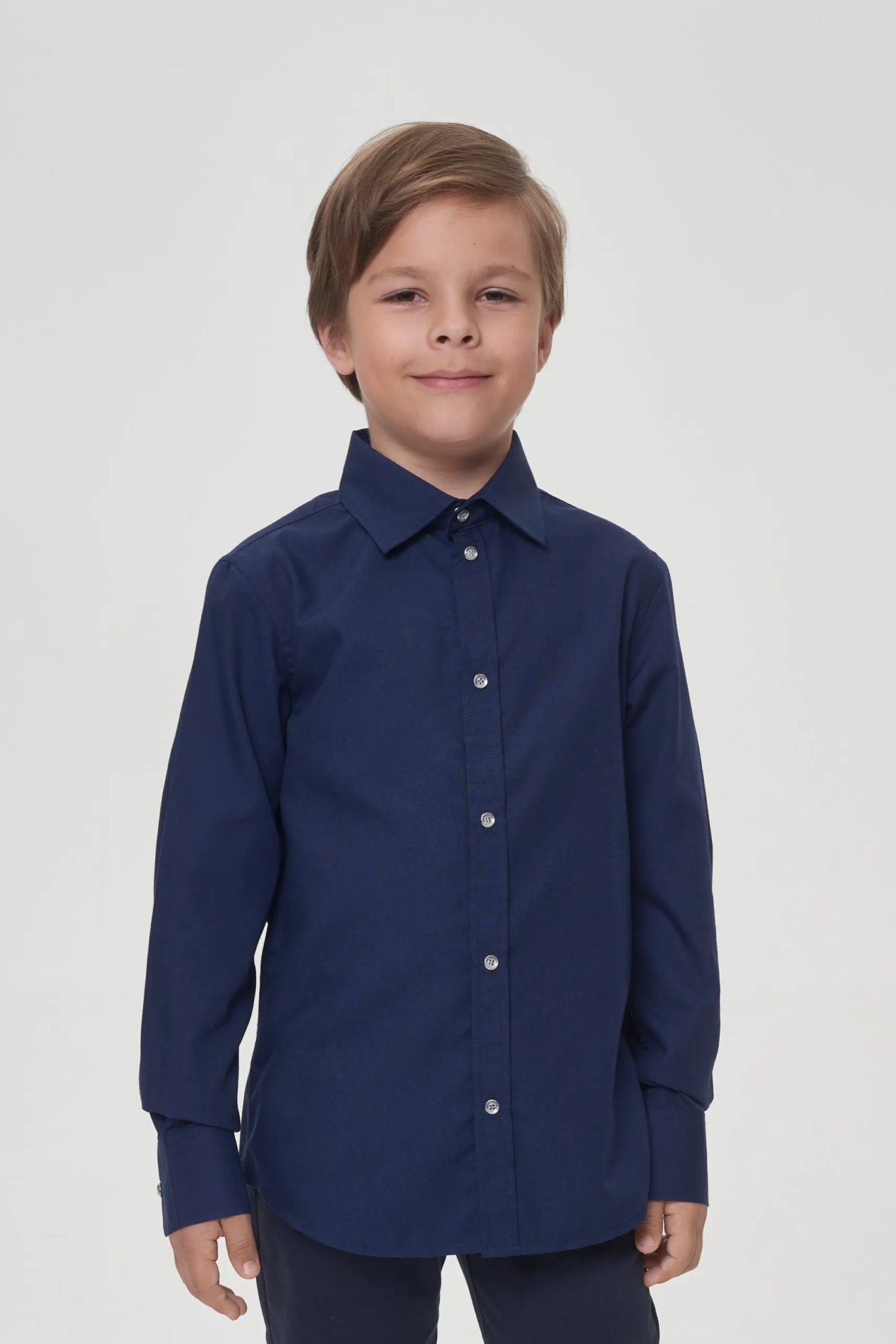 Темно-синяя рубашка классического кроя для мальчиков школьного возраста. Прямой силуэт изделия выполнен из качественного материала с высоким содержанием хлопка. Присутствует традиционный отложной воротник и застежка на ... кнопки, расположенная по всей длине. Рукава – длинные, с манжетами. Нижний край рубашки имеет закругленную форму. Ключевым достоинством этой модели является её практичность: она почти не мнется и проста в уходе, легко поддается глажке.