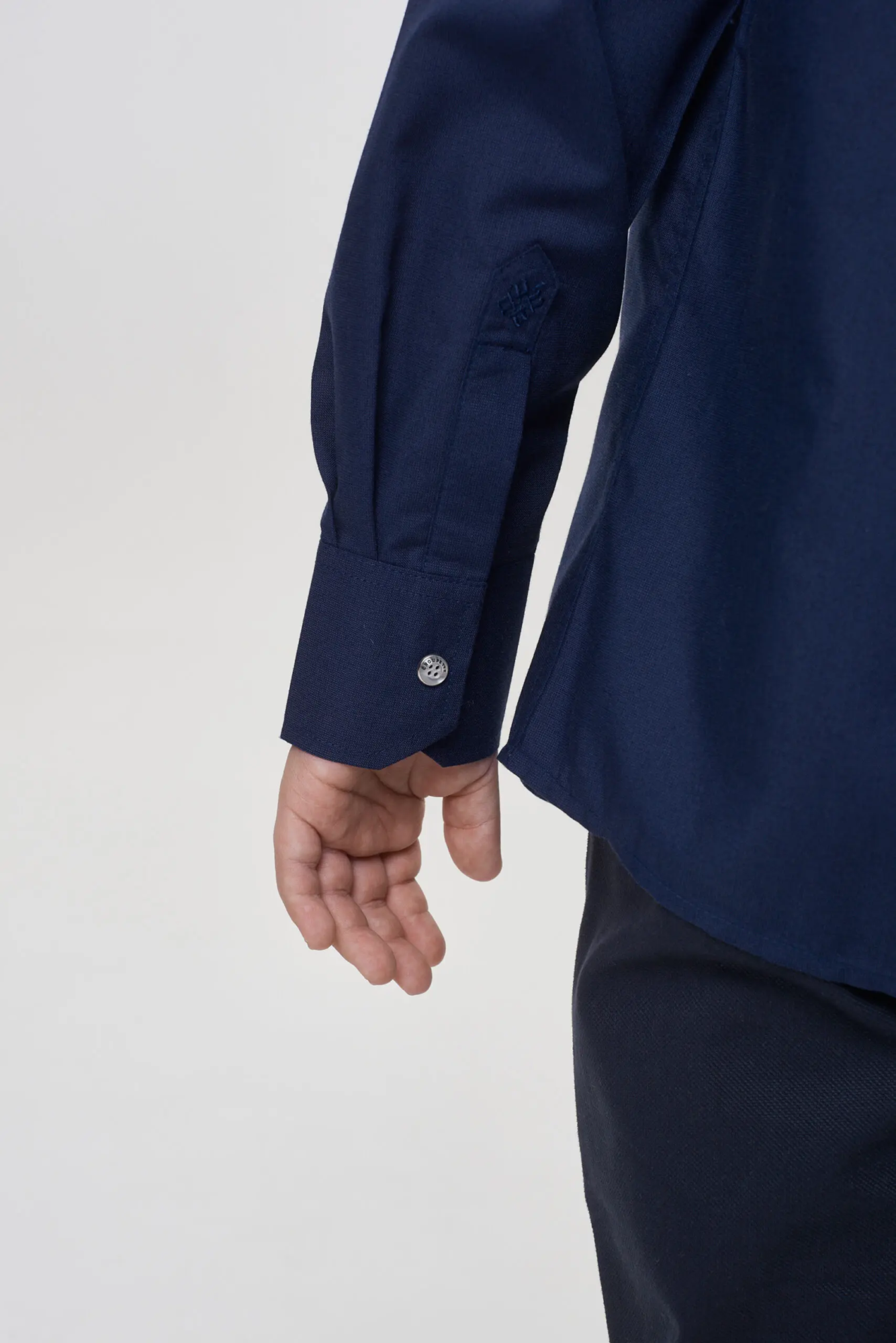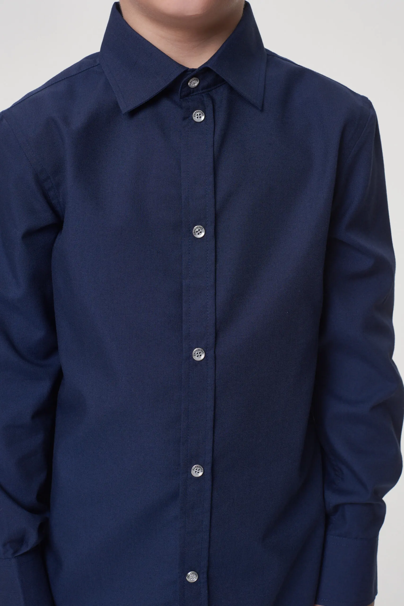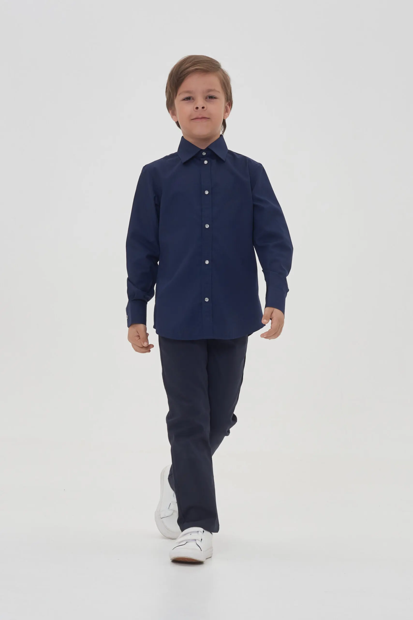 Темно-синяя рубашка классического кроя для мальчиков школьного возраста. Прямой силуэт изделия выполнен из качественного материала с высоким содержанием хлопка. Присутствует традиционный отложной воротник и застежка на ... кнопки, расположенная по всей длине. Рукава – длинные, с манжетами. Нижний край рубашки имеет закругленную форму. Ключевым достоинством этой модели является её практичность: она почти не мнется и проста в уходе, легко поддается глажке.