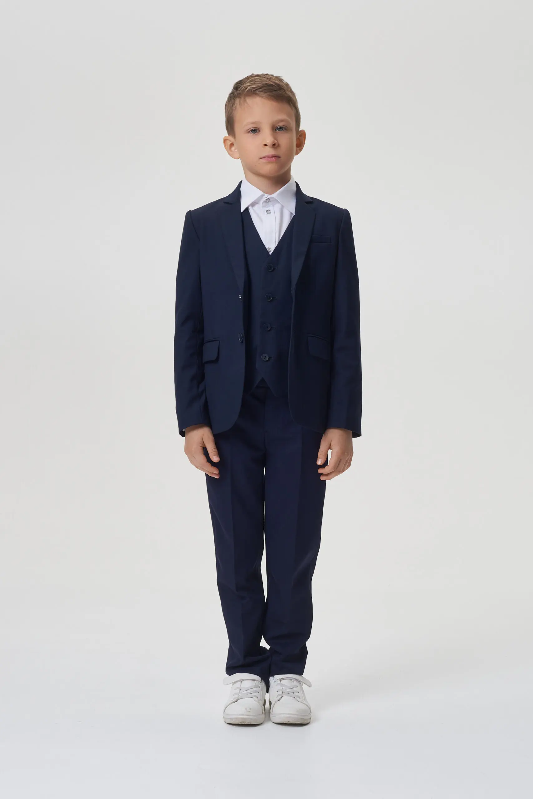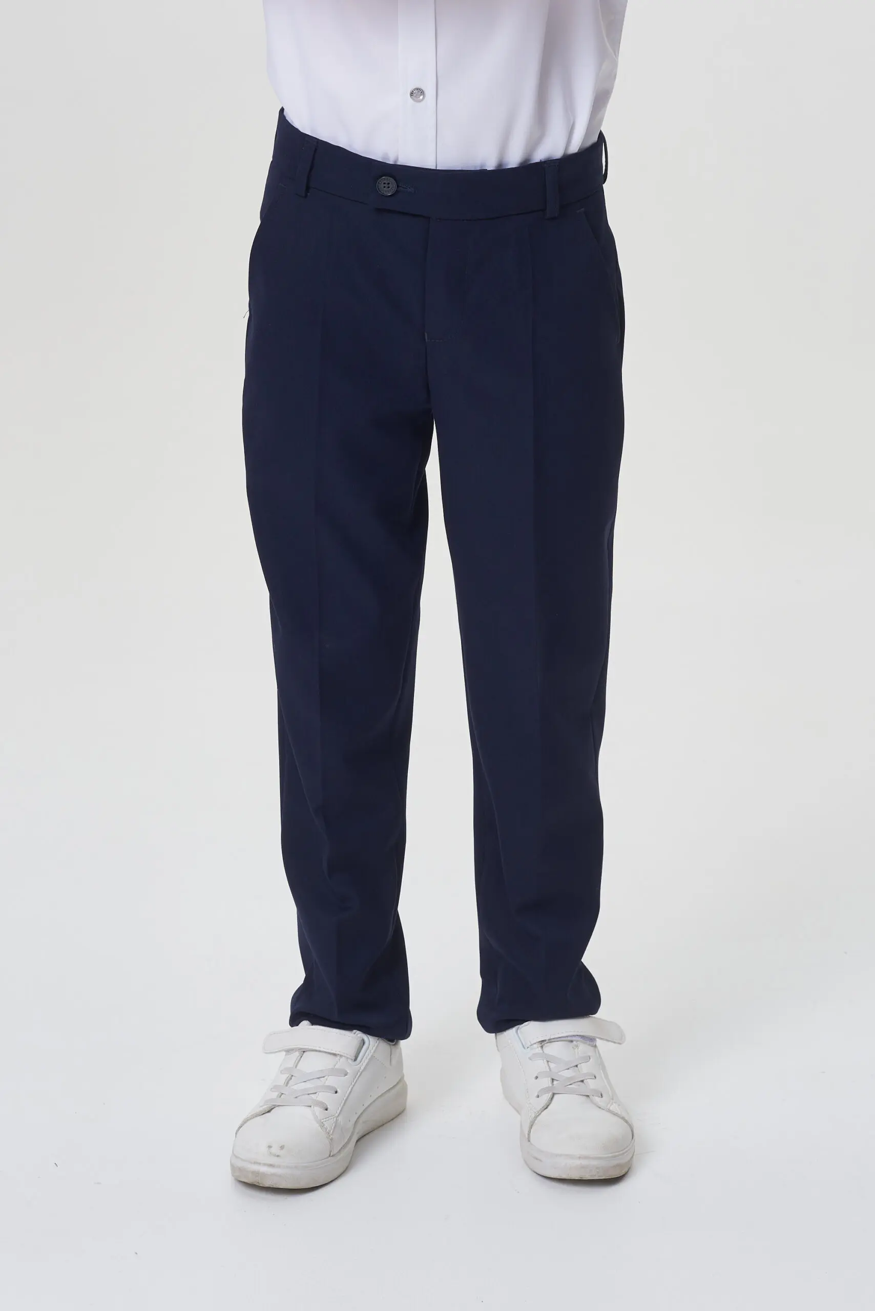 Классические синие брюки для мальчика - идеальный выбор для школьного гардероба. Зауженный силуэт, выполненный из прочной костюмной ткани, выделяется износостойкостью, надёжностью и элегантным внешним видом. Ткань ... приятна на ощупь, хорошо держит форму и обеспечивает превосходную посадку по фигуре. Каждая деталь этих брюк тщательно продумана: аккуратные швы, надёжная фурнитура и выверенная посадка. Для удобства предусмотрены практичные карманы. Застёжка-молния с пуговицей обеспечивает надёжную фиксацию. Внутренняя регулировка объёма талии позволяет адаптировать брюки под индивидуальные размеры, гарантируя удобство на протяжении всего дня. Брюки имеют слегка зауженный крой, который изящно подчёркивает силуэт, не сковывая движений. Они легко комбинируются с различной обувью – от строгих туфель до спортивных кроссовок. Благодаря универсальному дизайну, эти брюки идеально смотрятся как с пиджаком и рубашкой для особых случаев, так и с поло или вязаным свитером для повседневной носки.